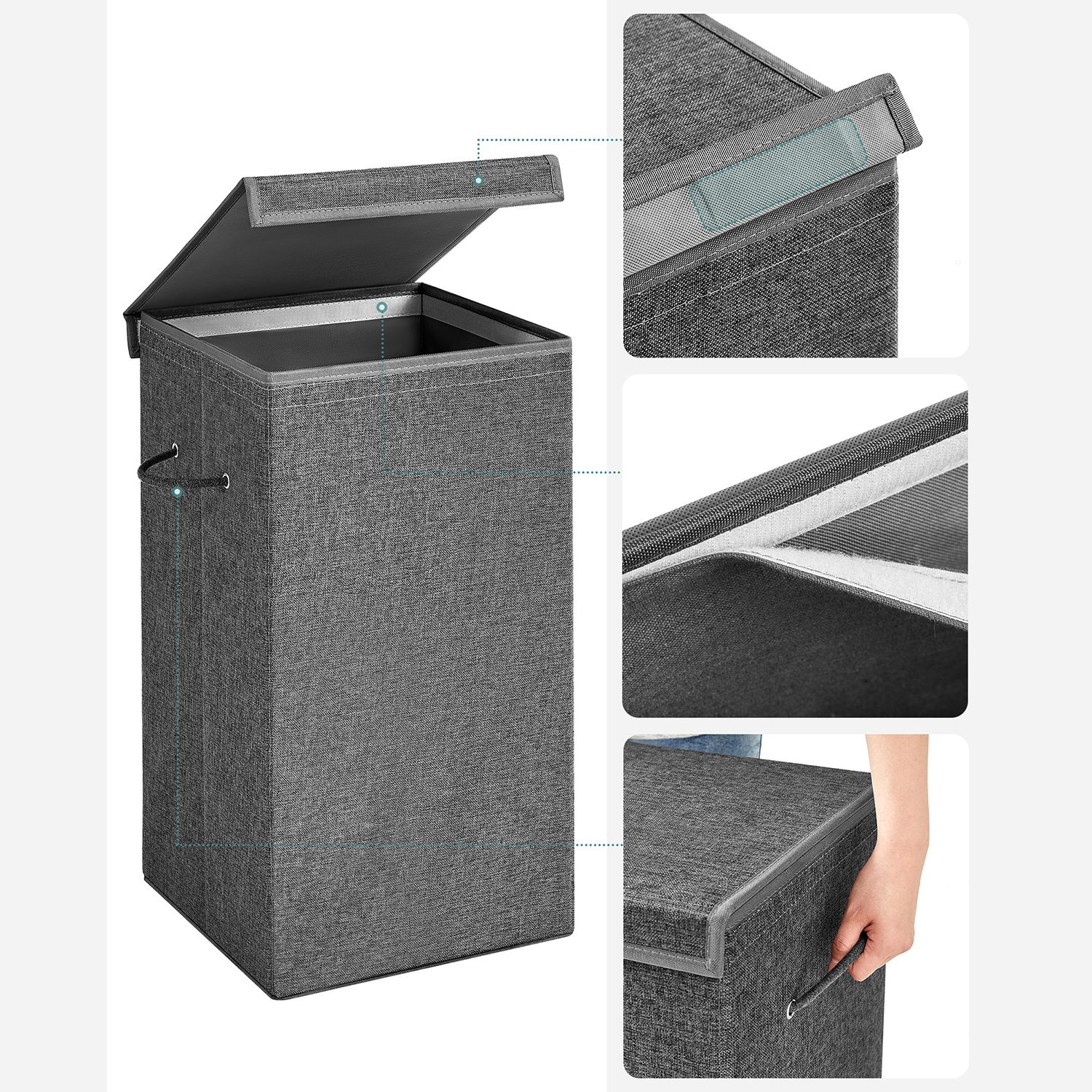 För en smidig tvättdag Ligger din smutsiga tvätt utspridd över hela rummet, så att du måste samla ihop den innan du kan ta den till tvättmaskinen? Eller upptäcker du regelbundet fler klädesplagg efter att din tvätt redan snurrar glatt i tvättrumman? Om ja, är denna tvättkorg från SONGMICS precis rätt för dig!Hudvänlig imiterad linne Denna tvättkorg är klädd med andningsbar imiterad linne i elegant mörkgrått. Detta material säkerställer god ventilation och passar dessutom till nästan alla inredningsstilar. Skaffa denna korg med lock redan idag så att den kan hjälpa dig genom tvättdagen! Produktdetaljer: – Färg: Mörkgrå – Material: Linimitation, MDF (medeldensitetsfiberplatta), bomull, non-woven-storlek: 36 x 36 x 66 cm (L x B x H) – Vikt: 3,1 kg – Max. statisk belastningskapacitet: 20 kg Leveransomfattning: – 1 x tvättkorg – 1 x instruktioner SONGMICS Anmärkningar:- Produkten får inte komma i kontakt med vassa föremål för att undvika skador. – Den maximala statiska belastningskapaciteten är 20 kg. Förvara inte för tunga föremål i denna tvättkorg.