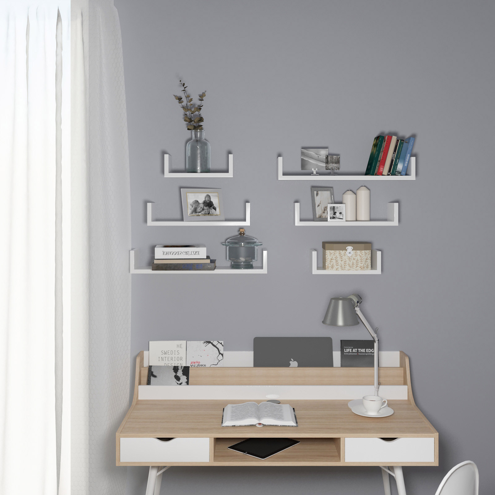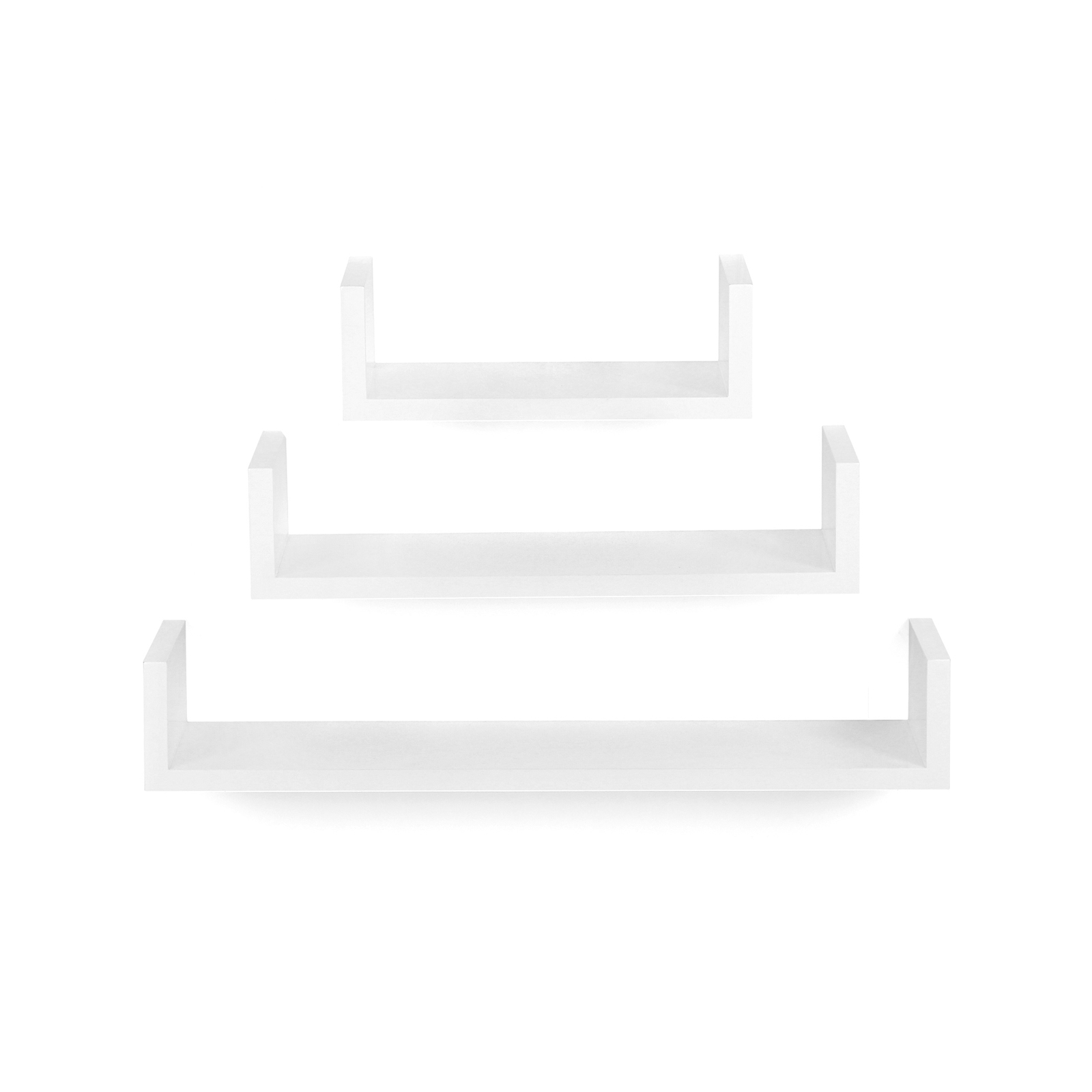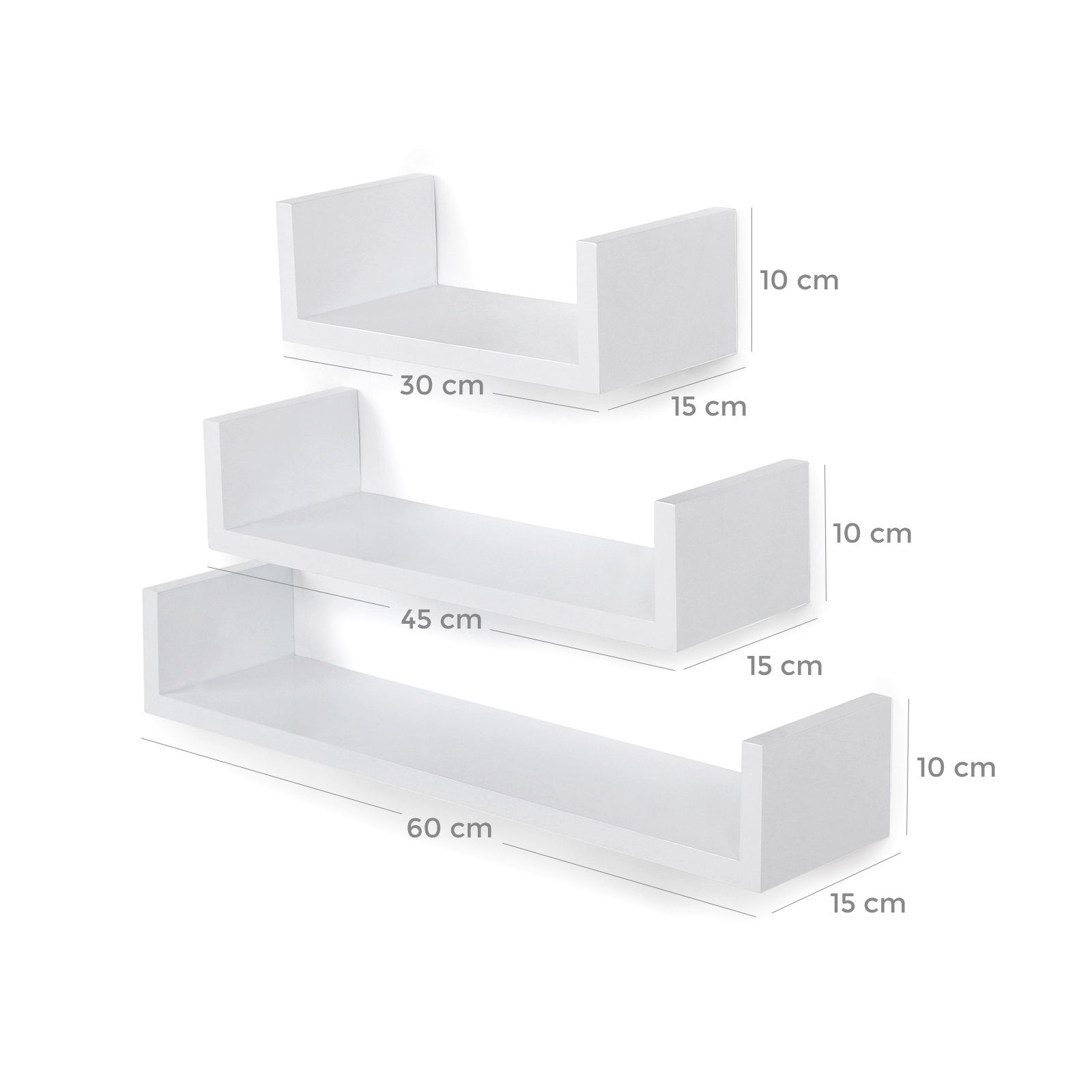 Detta trendiga 3-pack hyllor i U-form är ett riktigt blickfång! Songmics hyllset består av MDF-skivor som har testats enligt E1-standarden. Det är fuktbeständigt, deformeras inte lätt och har hög belastningskapacitet. Enkel montering tack vare integrerade osynliga väggfästen. Med sin nya design och moderna stil är hyllsetet den perfekta förvaringsytan för böcker, CD-skivor och andra småsaker. Som vägghylla eller helt enkelt som fristående dekoration – hyllan i elegant retrostil är ett praktiskt och dekorativt objekt i varje hem! Fäst produkten på en betongvägg, lättbetongvägg eller tegelvägg. Om du vill fästa produkten på en gipsskiva bör du först skaffa lämpliga skruvar från en fackhandel. Produktdetaljer: – Material: MDF-skivor (klass E1) Mått: – Yttermått: liten hylla: 30 x 10 x 15 cm (B x H x D); medelstor hylla: 45 x 10 x 15 cm (B x H x D); stort hyllplan: 60 x 10 x 15 cm (B x H x D) – Innermått: litet hyllplan: 26,4 x 8 x 15 cm (B x H x D); mellanstort hyllplan: 41,4 x 8 x 15 cm (B x H x D); Stort hyllplan: 56,4 x 8 x 15 cm (B x H x D) Leveransomfattning: – 1 x set vägghyllor (3 hyllplan) – 1 x set skruvar (6 st) och pluggar (6 st) för montering – 1 x bruksanvisning (DE, FR, EN, IT, ES)