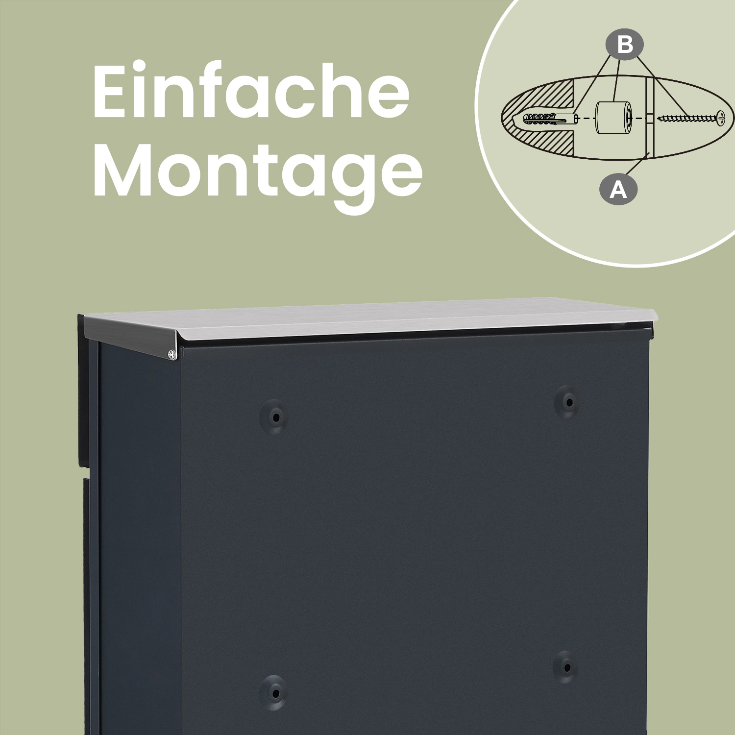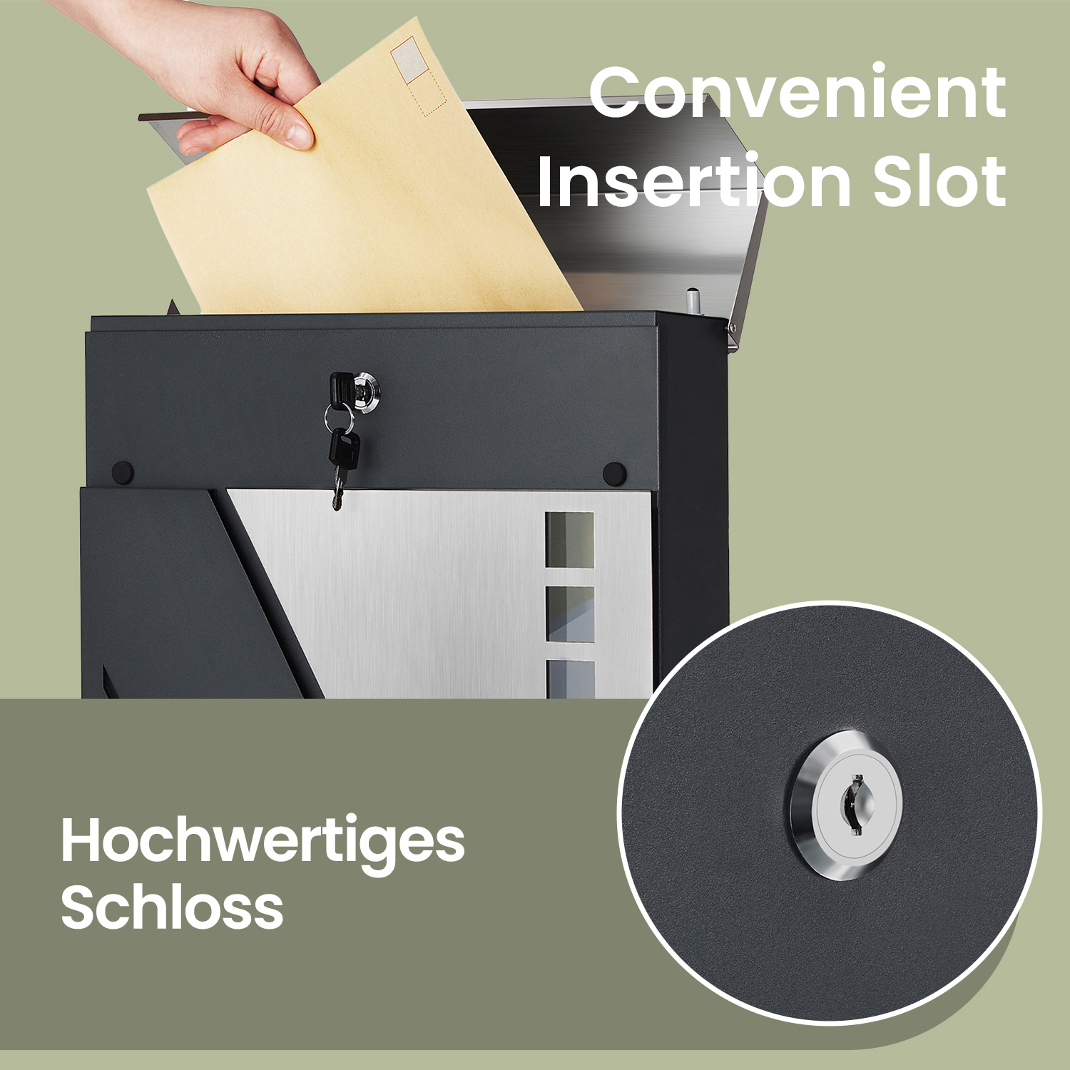 En fristad för dina brev: Lägger brevbäraren alltid dina brev på marken framför din dörr? Detta är särskilt irriterande på regniga dagar. Dessutom kan din post helt enkelt försvinna. Denna brevlåda från SONGMICS kommer till din hjälp och erbjuder dina brev en liten fristad. Den skyddar trycksakerna från väder och vind och har dessutom en lång livslängd. Skäl till varför denna brevlåda är rätt för dig: Tillverkad av rostfritt stål och galvaniserat, pulverlackerat stål för lång livslängd. Locket stängs mjukt efter att brevbäraren har lagt in breven.Fönstren gör att du snabbt kan se om ditt brev har kommit fram. 2 nycklar till låset ingår. Med ett tidningsfack i nedre delen. Enkel montering tack vare medföljande monteringsdetaljer. Produktdetaljer: Färg: Silver-antracit Material: Rostfritt stål, pulverlackerat galvaniserat stål Storlek: 37 x 10,5 x 37 cm (L x B x H) Vikt: 3,6 kg Leveransomfattning: 1 x brevlåda 2 x nycklar 4 x skruvar 4 x pluggar 4 x gummibeståndare SONGICs anmärkningar: Det rekommenderas att placera brevlådan på en väderskyddad plats för att säkerställa en längre livslängd.