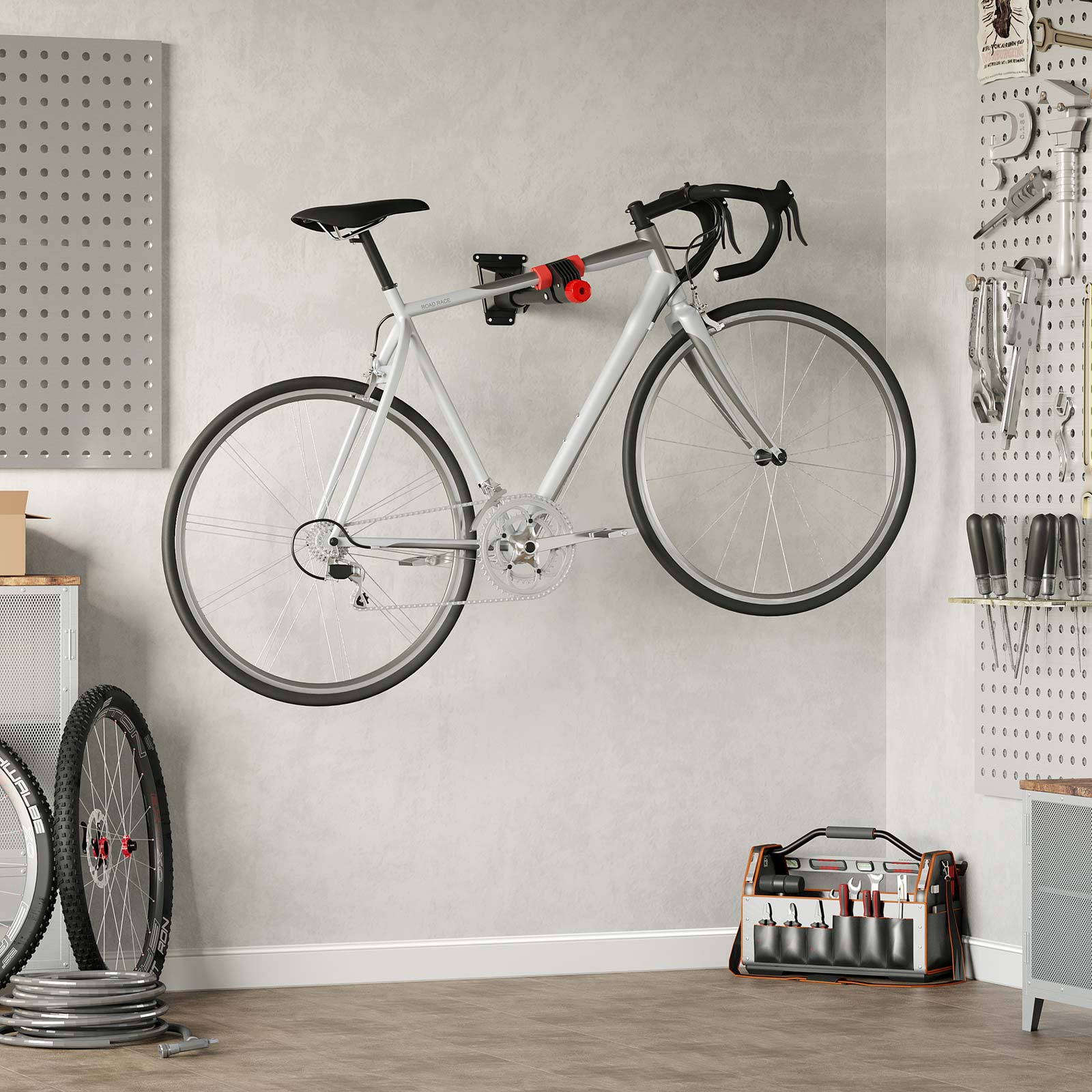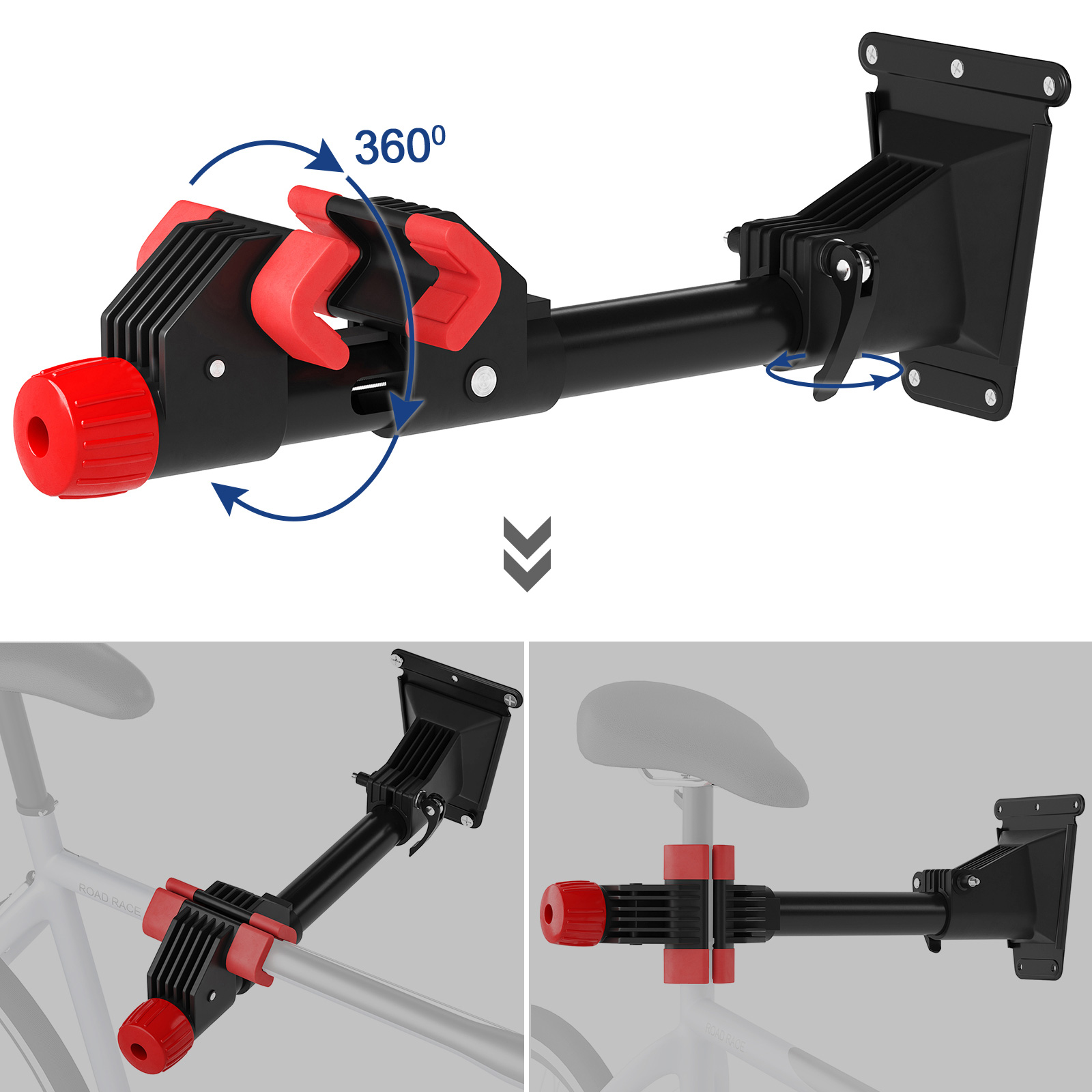 Enklare cykelreparationer: Med detta platsbesparande, väggmonterade reparationsstativ kan du hålla ordning i garaget eller hobbyverkstaden och samtidigt förenkla reparationer och underhållsarbete. Nu behöver du inte längre krypa på golvet eller be en vän om hjälp för att hålla din cykel i gott skick.Från holländska cyklar till mountainbikes: Detta monteringsstativ kan belastas med holländska cyklar eller mountainbikes upp till 20 kg. Den mjuka TPR-klämman omsluter cykelramar eller sadelstolpar med en diameter på 25 till 40 mm och kan vridas 360°. Produktdetaljer:Färg: Svart-röd Material: Stål, plast Storlek: 44 x 10 x 10 cm (L x B x H) Vikt: 1,9 kg Max. statisk belastningskapacitet: 20 kg Leveransomfattning: 1 x cykelreparationsställ (klämarm) 2 x väggfäste 1 x bruksanvisning (DE, EN, FR, ES, IT) SONGMICS Anmärkningar:Denna produkt är uteslutande avsedd för montering och reparation av cyklar i privat bruk. Montera och använd denna produkt i enlighet med bruksanvisningen. Montera denna produkt på en solid vägg (t.ex. en tegelvägg). Montera den inte på en gipsvägg. Var försiktig när du monterar, tar bort eller justerar höjden på produkten. Den maximala belastningen för denna produkt är 20 kg. Denna hållare är därför inte lämplig för reparation av tyngre cyklar. Klämman kan omsluta stänger med en diameter på 25-40 mm. Använd inte produkten för cyklar med större stänger. När du reparerar en cykel med hjälp av denna produkt bör du se till att cykelns tyngdpunkt alltid är i balans. Låt inte barn klättra på produkten, hänga i den eller leka i närheten för att undvika eventuella skador.
