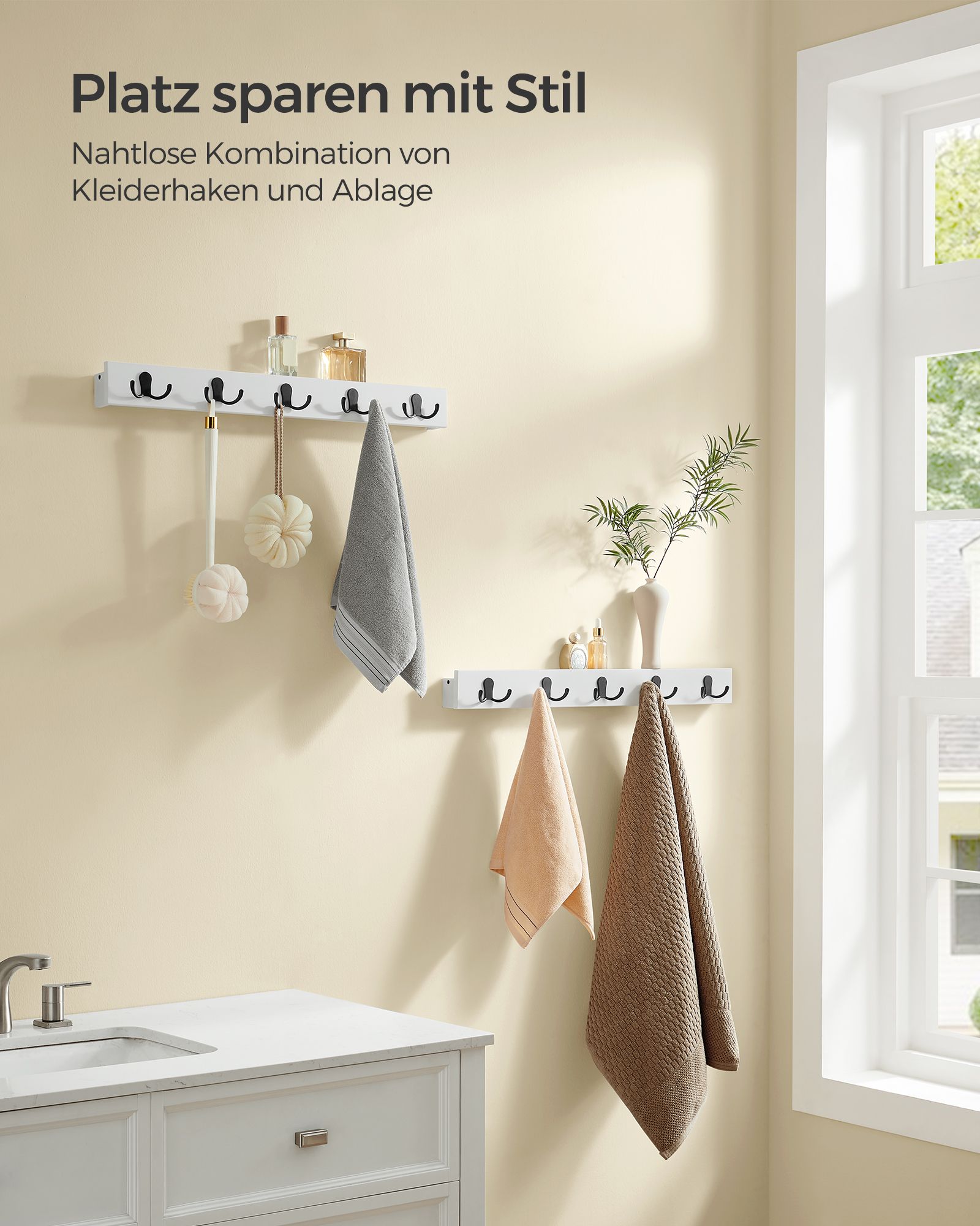 SONGMICS vägghängare, garderob med hyllplan, väggmontering, 5 dubbla metallkrokar, platsbesparande, för hall, vardagsrum, sovrum, max. belastning per krok 5 kg