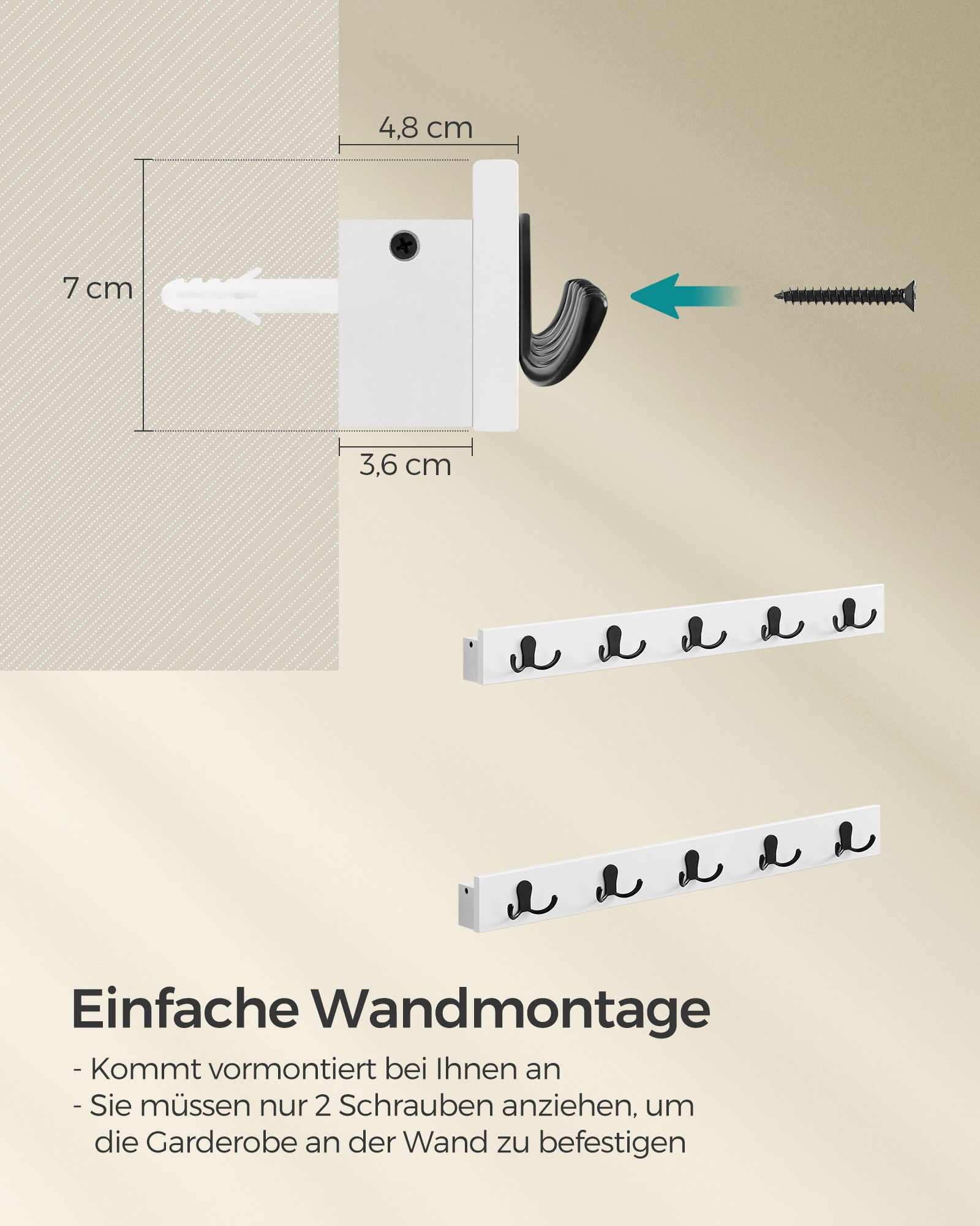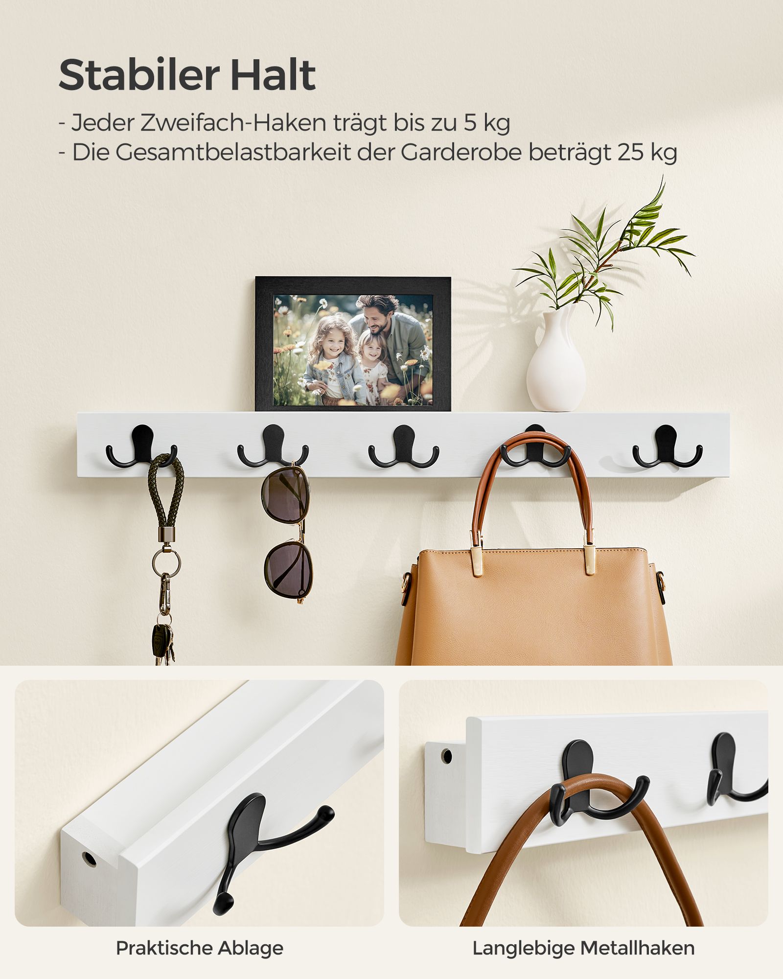 Max. statisk belastningskapacitet per krok: 5 kg