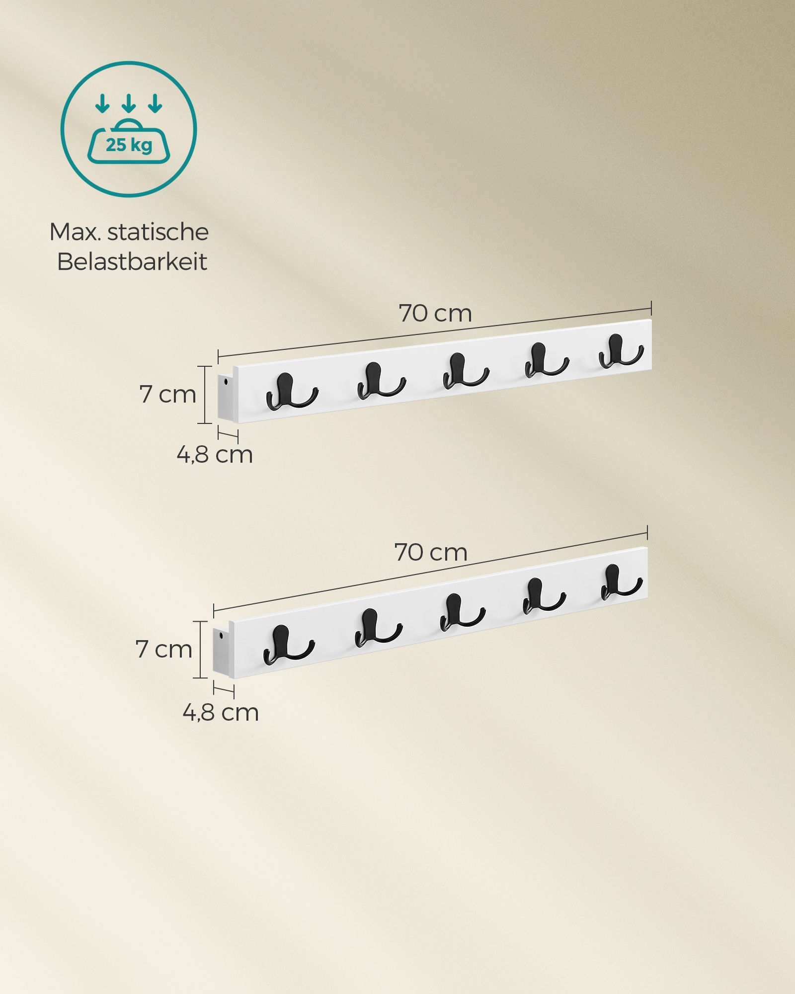 Max. statisk belastningskapacitet per vägghängare: 25 kg