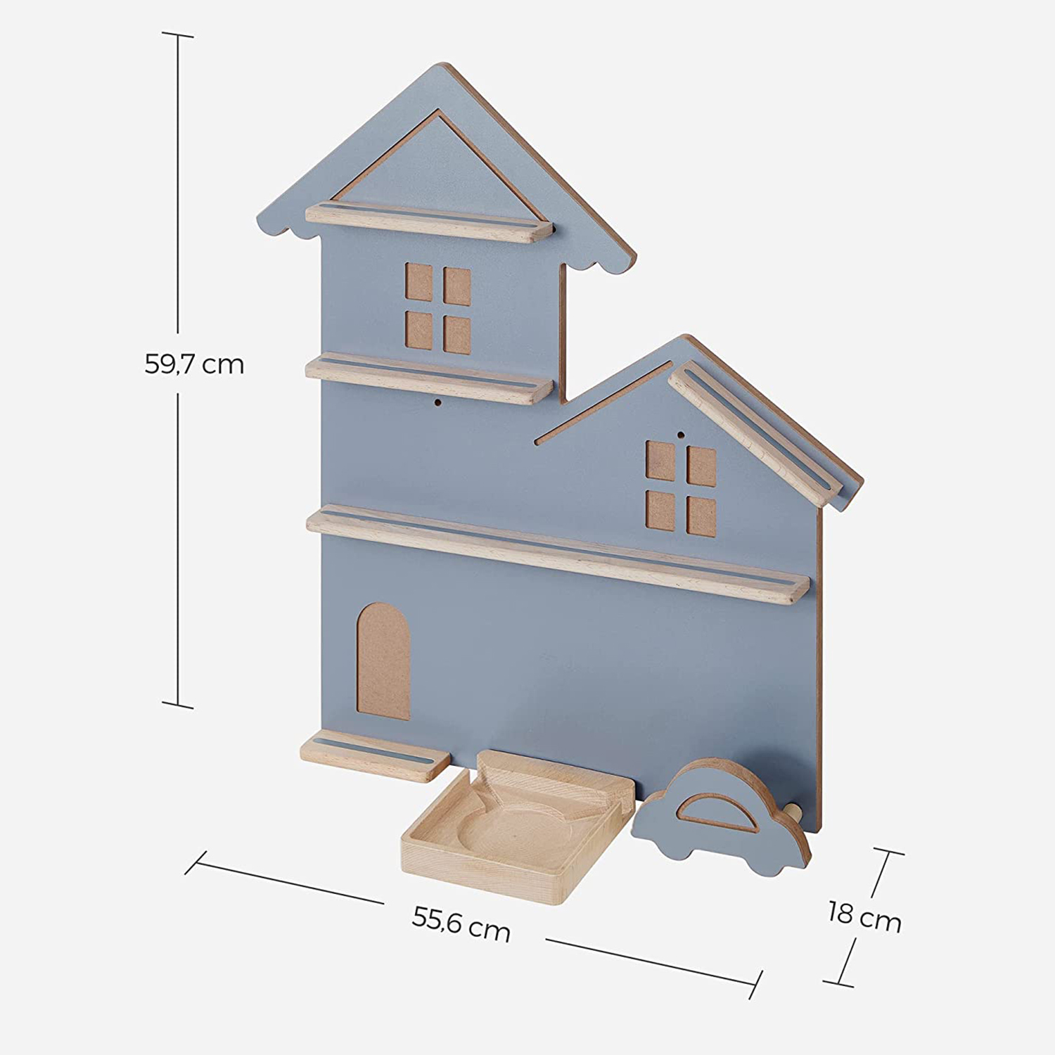 Produktdetaljer: Färg: Grå Material: MDF (medeldensitetsfiberplatta), stål, bokträ Storlek: 18 x 55,6 x 59,7 cm (D x B x H) Vikt: 3,1 kg Leveransomfattning: 1 x vägghylla 1 x tillbehörspaket 1 x bruksanvisning SONGMICS Anmärkningar:Av säkerhetsskäl är det förbjudet för barn att klättra på hyllan eller leka med den. Lådorna är inte tvättbara! Vid nedsmutsning rengör du dem med en trasa. Placera hyllan på en torr plats. Det kan hända att barnhyllan luktar ”nytt” när du packar upp den. I så fall kan du placera den i ett väl ventilerat rum så att lukten försvinner efter en kort stund.