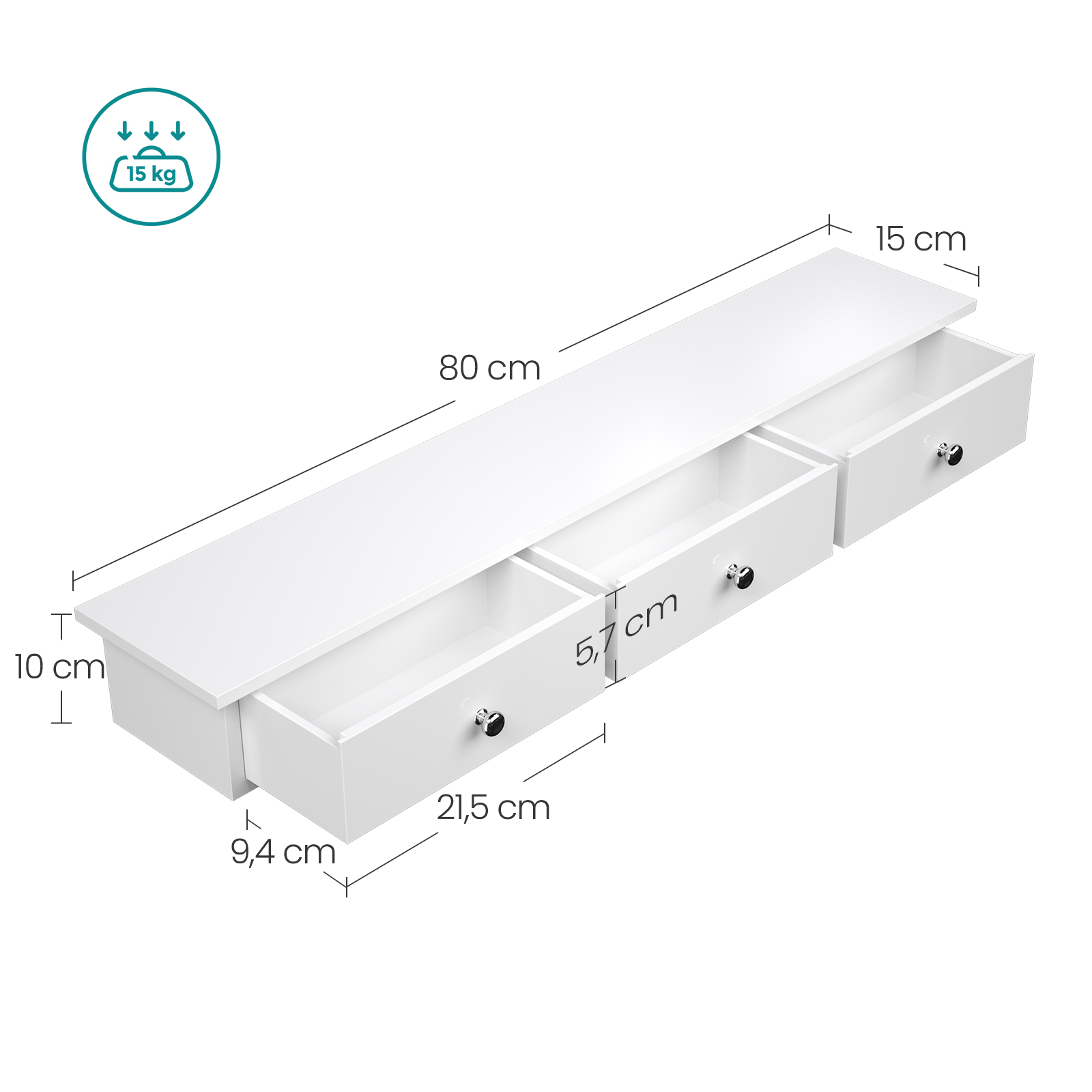 Saknar du förvaringsutrymme på golvet? Titta upp på väggarna! Med denna svävande hylla kan du visa upp fotoramar i sovrummet, förvara kryddburkar i köket eller placera dekorationsföremål i vardagsrummet. ”Vi är starka”: Skjut undan ostadiga hyllor! Denna svävande hylla med 3 lådor är tillverkad av E1-klassat trä och är tillräckligt stark för att rymma krukväxter eller inredningsdetaljer (max. statisk belastningskapacitet: 15 kg). Produktdetaljer: – Färg: Vit – Material: E1-klassad MDF (medeldensitetsfiberplatta) – Storlek: 80 x 15 x 10 cm (L x B x H) – Vikt: 4 kg – Max. statisk belastningskapacitet: 15 kg Leveransomfattning: – 1 x vägghylla med 3 lådor – 1 x tillbehörspaket – 1 x instruktioner (DE, EN, FR, ES, IT) SONGMICS Anmärkningar:- För montering av detta hyllsystem krävs en skruvmejsel, ett vattenpass och en hammare. – Montera produkten på massiva betong- eller tegelväggar. Om du vill montera produkten på gipsväggar måste du köpa lämpliga skruvar i fackhandeln.