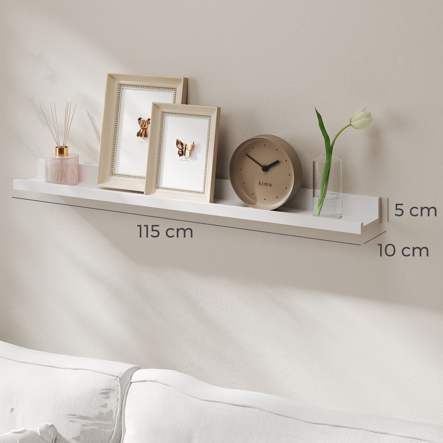 Produktdetaljer: – Färg: Vit – Material: E1-klass MDF, högblank lack – Produktstorlek: 110 x 10 x 5/2 cm (B x D x H) (baksida: 5 cm, framsida: 2 cm) – Vikt: 2,4 kg – Maximal statisk belastningskapacitet: 10 kg Leveransomfattning: – 1 x svävande vägghylla – 1 x tillbehörspaket – 1 x bruksanvisning (DE, EN, FR, ES, IT) SONGMICS Anmärkningar: – För montering behöver du en akku-skruvdragare, ett vattenpass och en hammare.