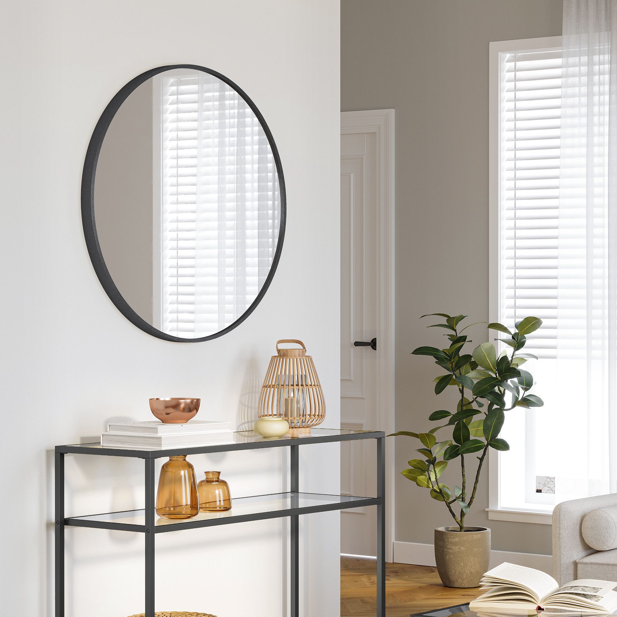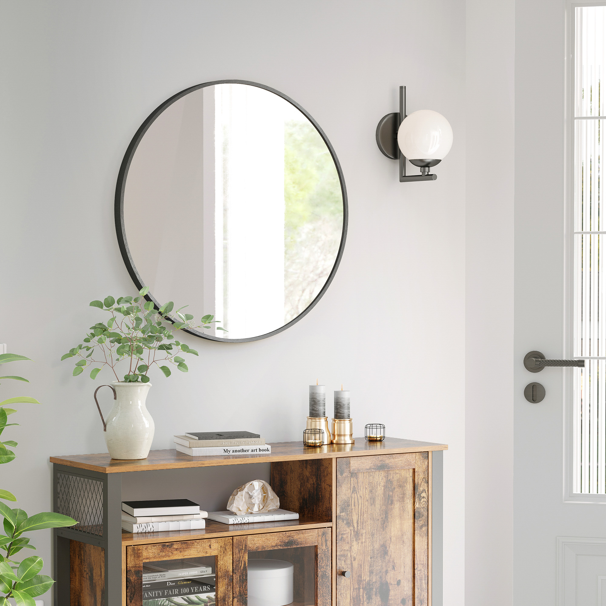 SONGMICS väggspegel, rund spegel, badrumsspegel, 61 cm diameter, metallram, för vardagsrum, sovrum, badrum, hall, svart LWM102B01