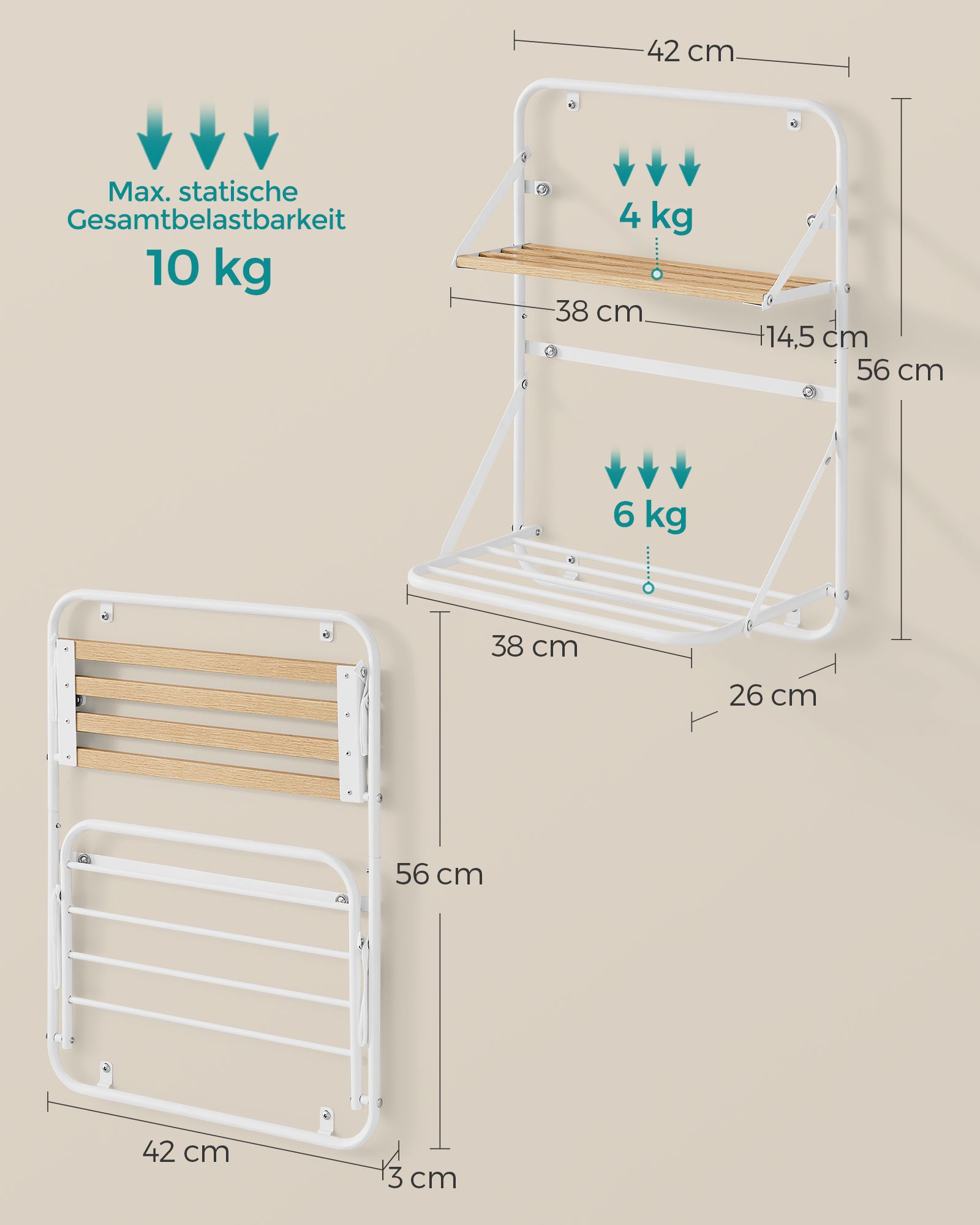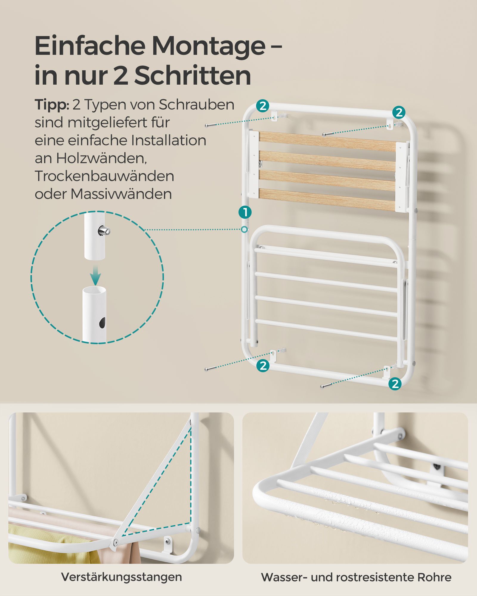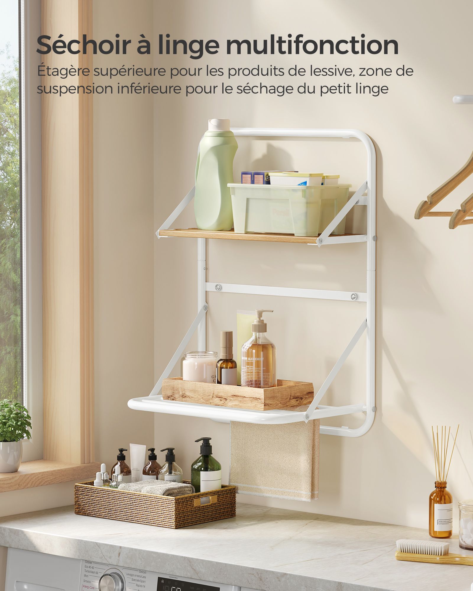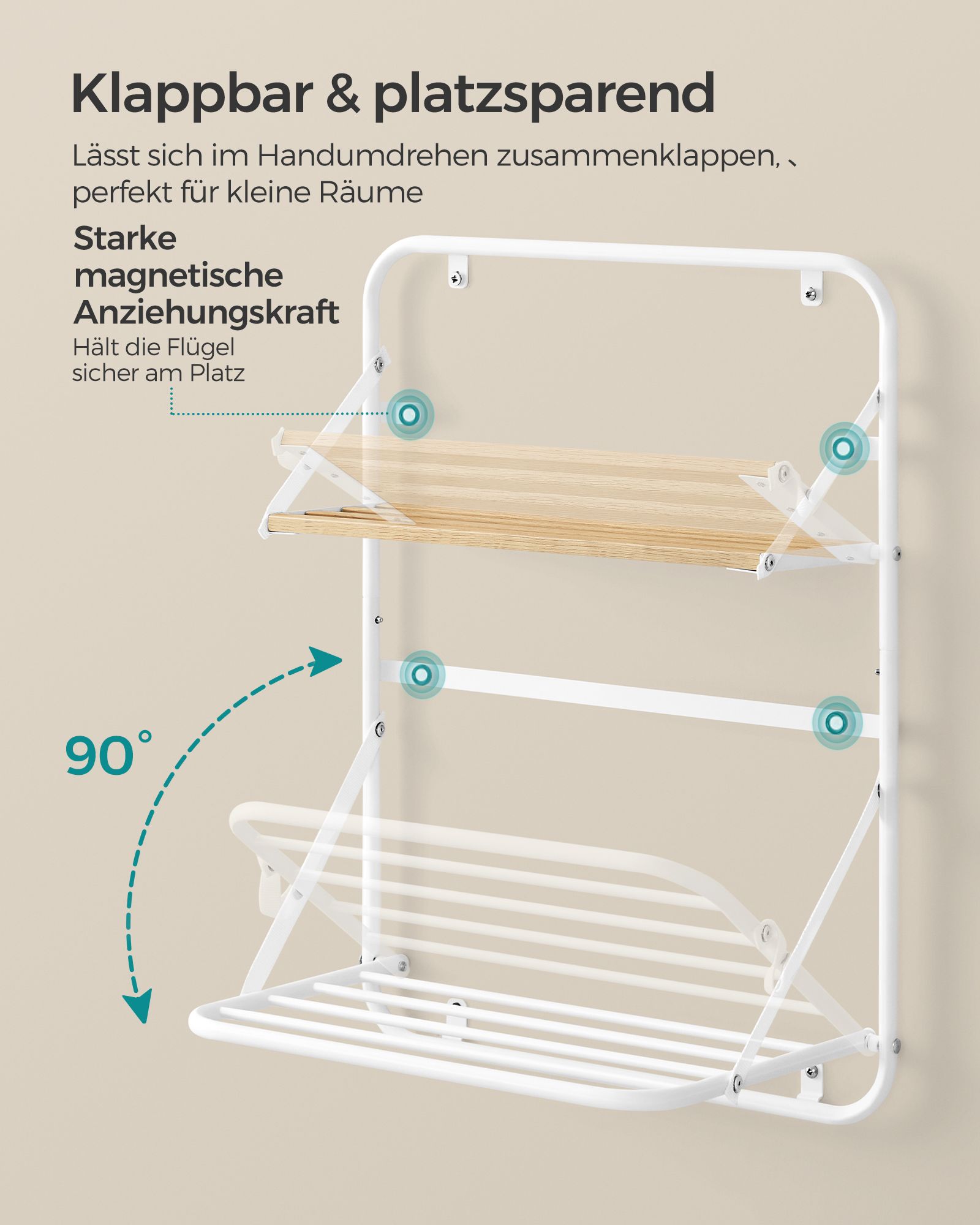 SONGMICS väggtork, klädstativ, väggmonterat torkställ, hopfällbart, med hylla, hängstänger, magnetisk design, för tvättstuga, badrum, molnvit LLR803W01