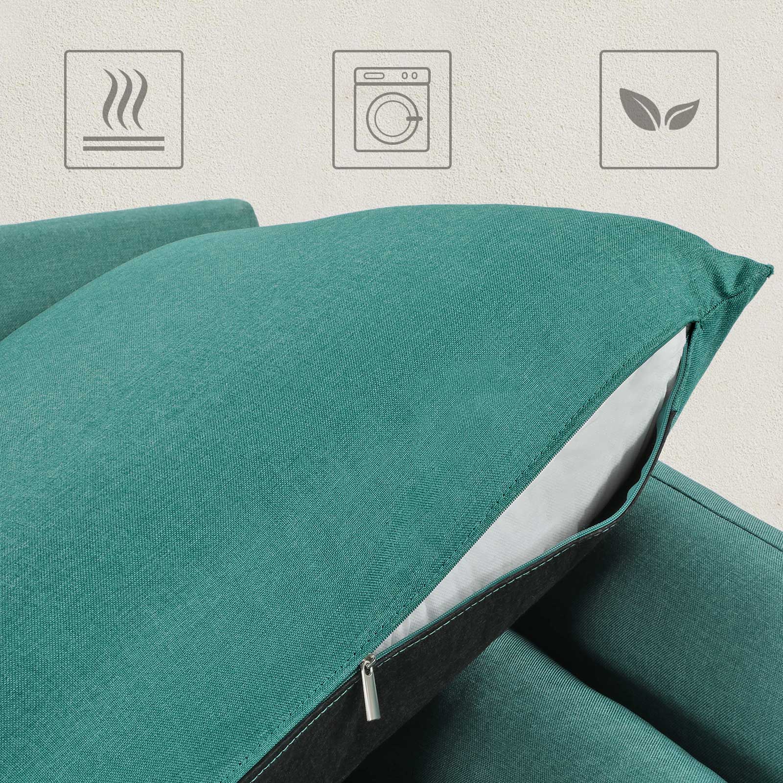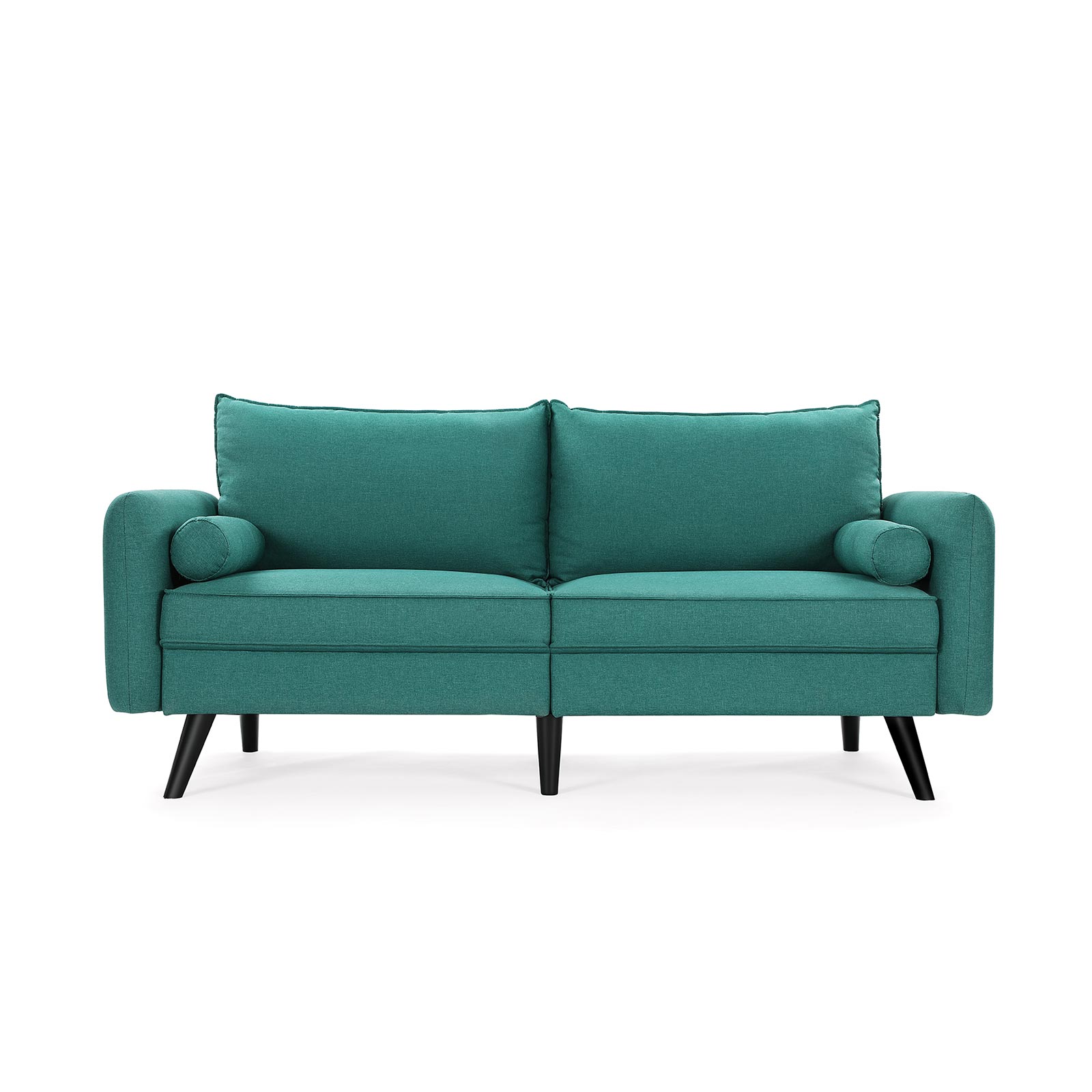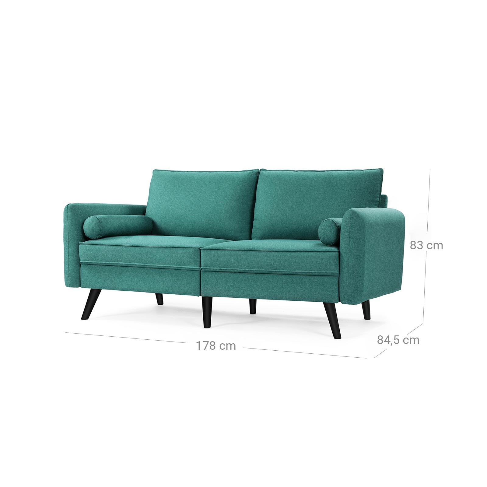Svarta ben i massivt trä och smaragdgrönt linneimitat – en oslagbar kombination som inte bara förhöjer ditt hem, utan också är extra robust och slitstark. Höjdpunkterna i denna bekväma sittmöbel i korthet: – Soffans ben är tillverkade av gummiträ, vilket tillsammans med den stabila träkonstruktionen gör att soffan tål en belastning på 200 kg per sittplats. – Extra fack på undersidan av soffan där du kan förvara kuddar och liknande. – De stora kuddarna fästs på soffan med kardborreband och håller sig därmed alltid på plats. – Klädseln på kuddarna och nackrullarna är avtagbar och därmed lätt att rengöra. Produktdetaljer: – Färg: Smaragdgrön – Material: Imitation av linne, skumplast, gummiträ, eukalyptusträ – Storlek: 180 x 82 x 83 cm (L x B x H) – Vikt: 38,5 kg – Max. statisk belastningskapacitet per sittplats: 200 kg/8 timmar. Leveransomfattning: – 1 x soffa – 1 x tillbehörspåse – 1 x bruksanvisning (DE, EN, FR, ES, IT) VASAGLE Anmärkningar: – Barn bör endast använda produkten under uppsikt av en vuxen. – Montera produkten enligt bruksanvisningen. Ändringar eller ombyggnader kan äventyra produktens säkerhet.