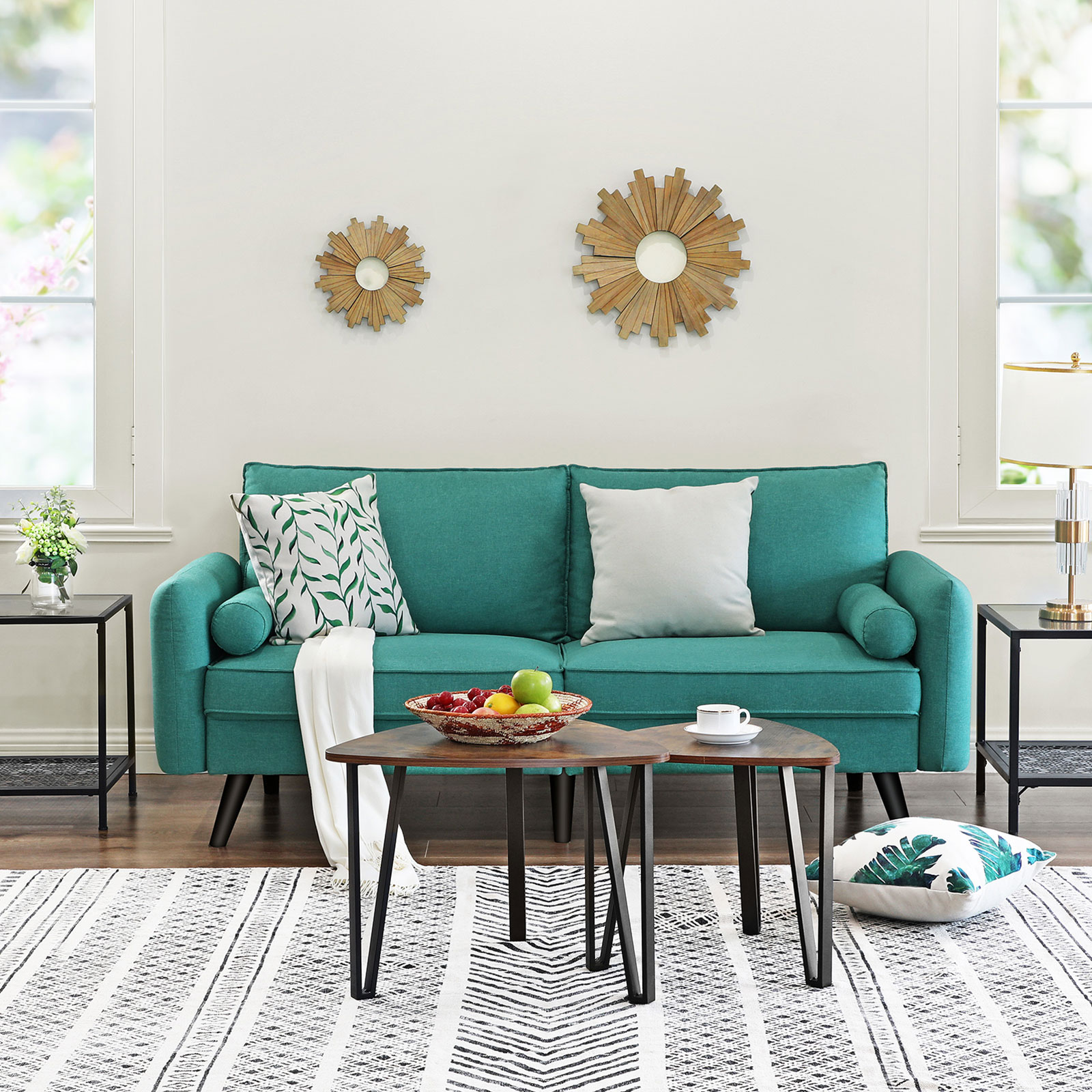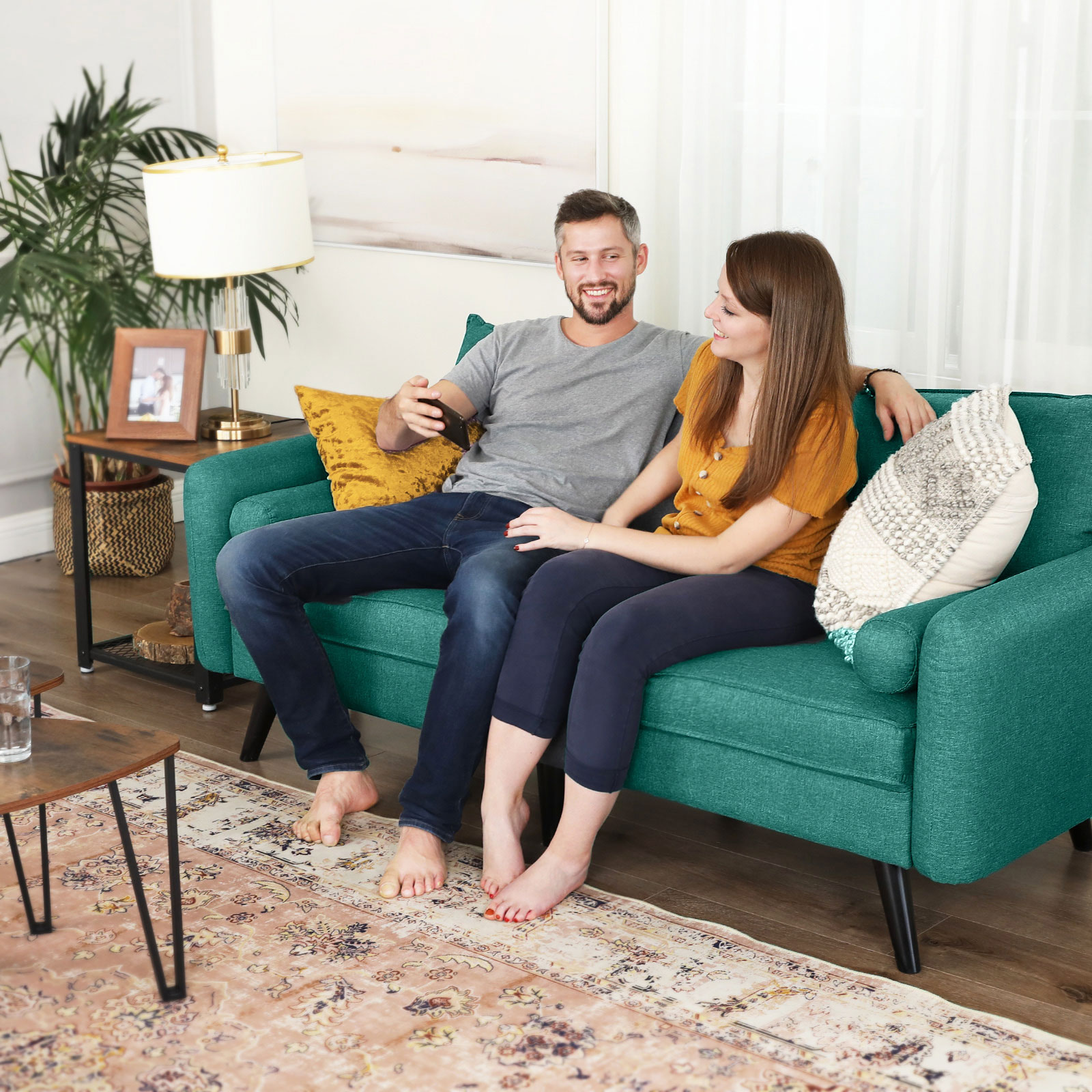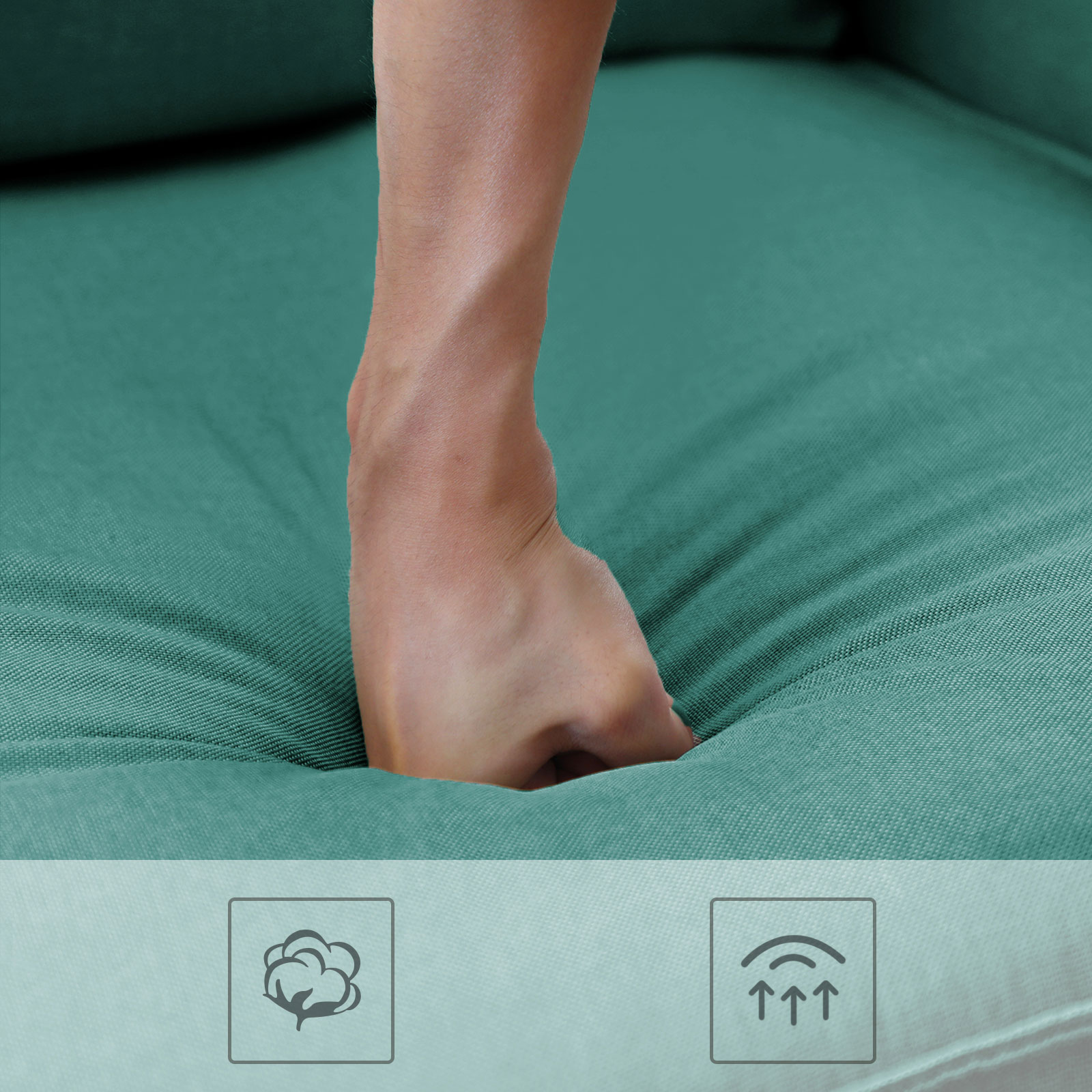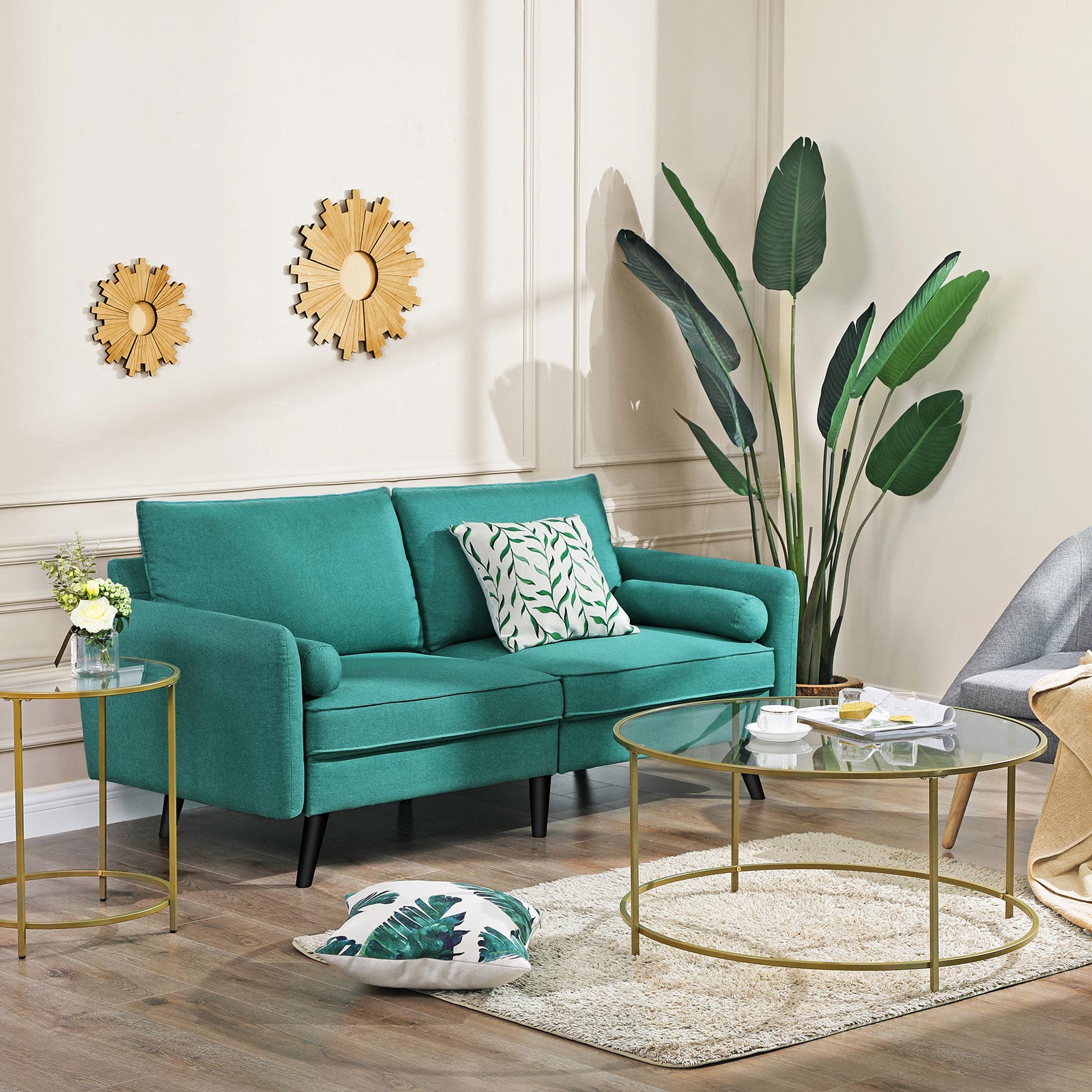 Svarta ben i massivt trä och smaragdgrönt linneimitat – en oslagbar kombination som inte bara förhöjer ditt hem, utan också är extra robust och slitstark. Höjdpunkterna i denna bekväma sittmöbel i korthet: – Soffans ben är tillverkade av gummiträ, vilket tillsammans med den stabila träkonstruktionen gör att soffan tål en belastning på 200 kg per sittplats. – Extra fack på undersidan av soffan där du kan förvara kuddar och liknande. – De stora kuddarna fästs på soffan med kardborreband och håller sig därmed alltid på plats. – Klädseln på kuddarna och nackrullarna är avtagbar och därmed lätt att rengöra. Produktdetaljer: – Färg: Smaragdgrön – Material: Imitation av linne, skumplast, gummiträ, eukalyptusträ – Storlek: 180 x 82 x 83 cm (L x B x H) – Vikt: 38,5 kg – Max. statisk belastningskapacitet per sittplats: 200 kg/8 timmar. Leveransomfattning: – 1 x soffa – 1 x tillbehörspåse – 1 x bruksanvisning (DE, EN, FR, ES, IT) VASAGLE Anmärkningar: – Barn bör endast använda produkten under uppsikt av en vuxen. – Montera produkten enligt bruksanvisningen. Ändringar eller ombyggnader kan äventyra produktens säkerhet.