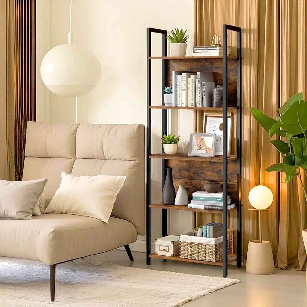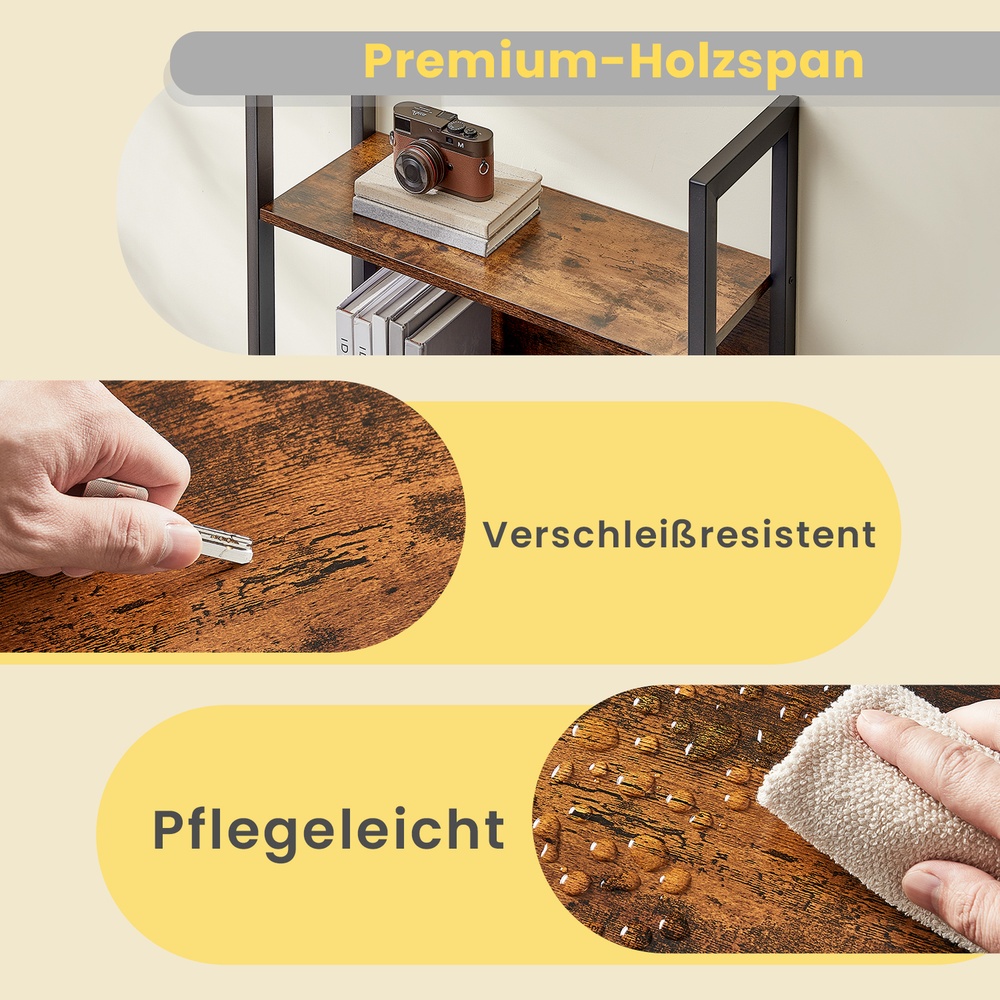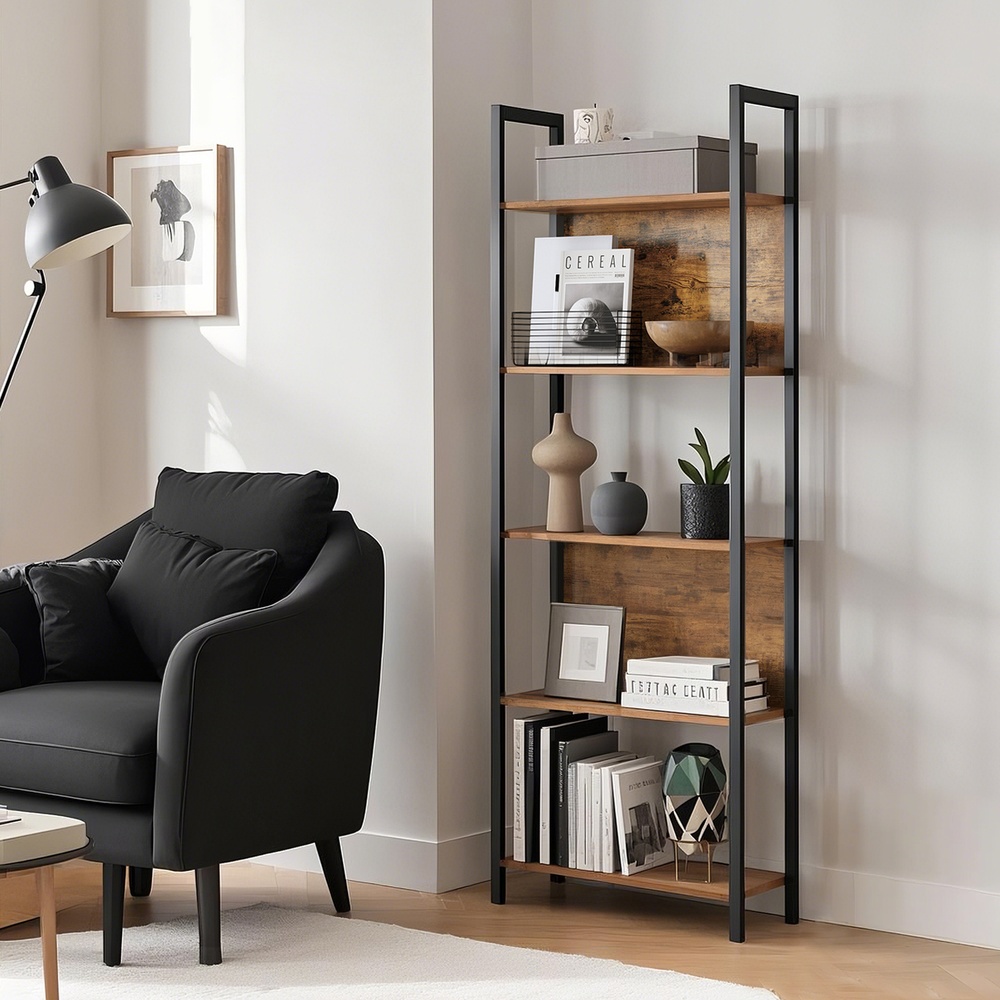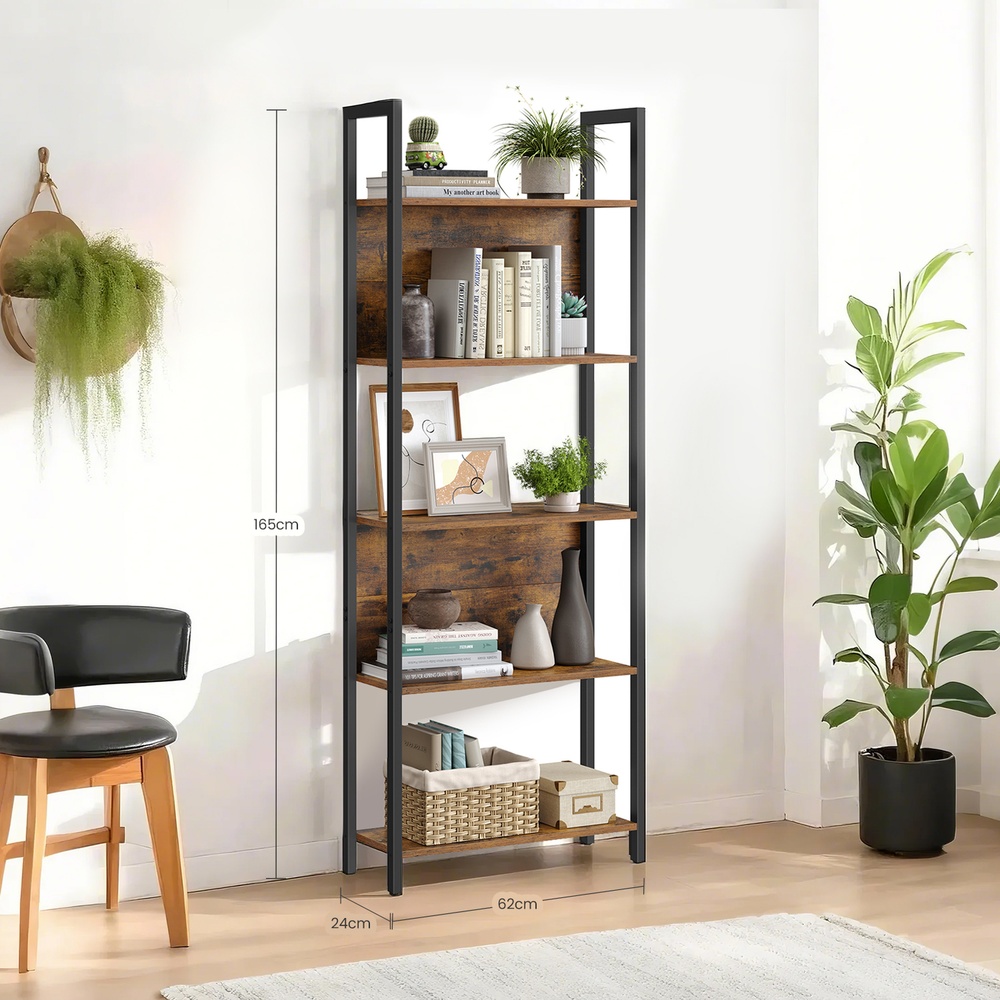 Produktdetaljer: – Färg: Vintagebrun-svart – Material: Spånskiva, stål – Storlek: 62 x 24 x 165 cm (L x B x H) – Vikt: 14 kg – Max. statisk belastningskapacitet per hyllplan: 20 kg Leveransomfattning:- 1 x bokhylla – 1 x tillbehörspaket – 1 x tippskydd – 1 x bruksanvisning (DE, EN, ES, FR, IT) VASAGLE Anmärkningar: – Av säkerhetsskäl är det förbjudet för barn att klättra på eller leka med produkten. – Fäst denna produkt på väggen med det medföljande tippskyddet.