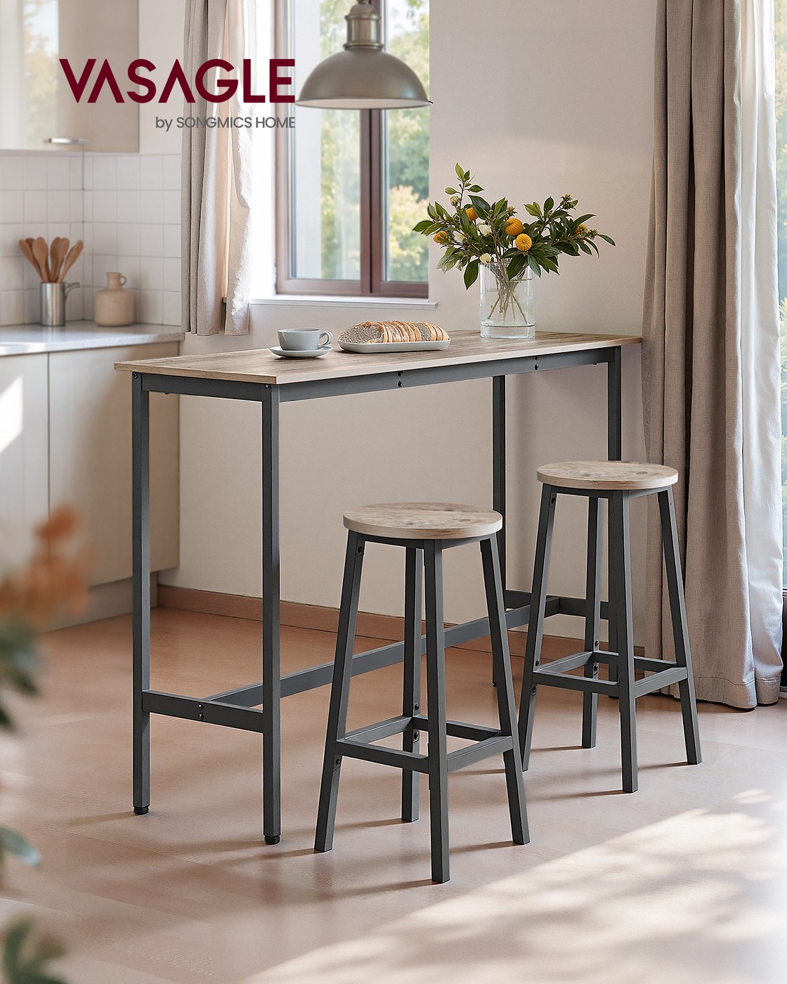 Produktdetaljer: – Färg: Greige-svart – Material: Spånskiva, stål – Storlek: 32 x 65 cm (Ø x H) – Totalvikt: 7,5 kg – Max. statisk belastningskapacitet: 150 kg Leveransomfattning: – 2 x barstol – 1 x tillbehörspaket – 1 x bruksanvisning VASAGLE Anmärkningar:- Av säkerhetsskäl är det förbjudet för barn att klättra på eller leka med produkten. – Denna produkt har en maximal belastningskapacitet på 150 kg. Överskrid inte denna maximala vikt.