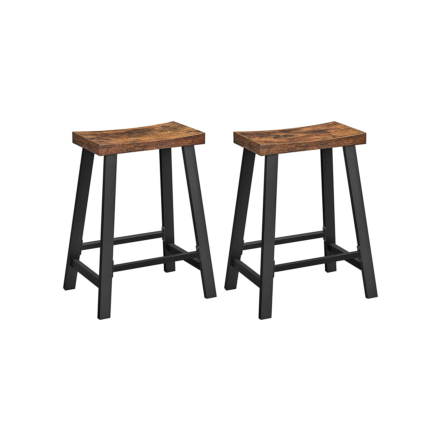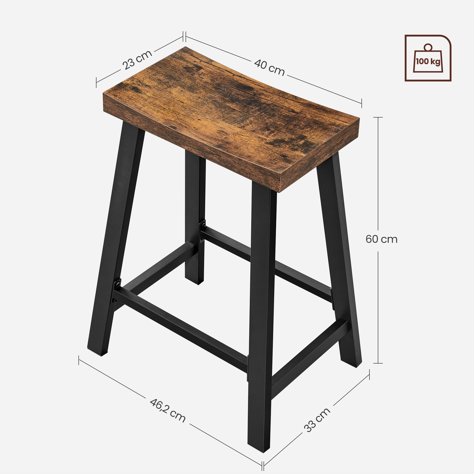 Produktdetaljer: – Färg: Vintagebrun-svart – Material: Plywood, stål – Storlek på varje pall: 46,2 x 33 x 60 cm (L x B x H) – Storlek på sitsen: 40 x 23 cm (L x B x H) – Totalvikt: 9,5 kg – Max. statisk belastningskapacitet per pall: 100 kg Leveransomfattning: – 2 x barstolar – 1 x tillbehörspaket – 1 x bruksanvisning VASAGLE Anmärkningar: – Av säkerhetsskäl är det förbjudet för barn att klättra på eller leka med produkten. – Den maximala statiska belastningskapaciteten för varje barstol är 100 kg. Överskrid inte denna maximala vikt.