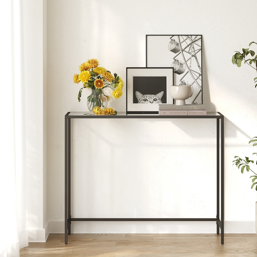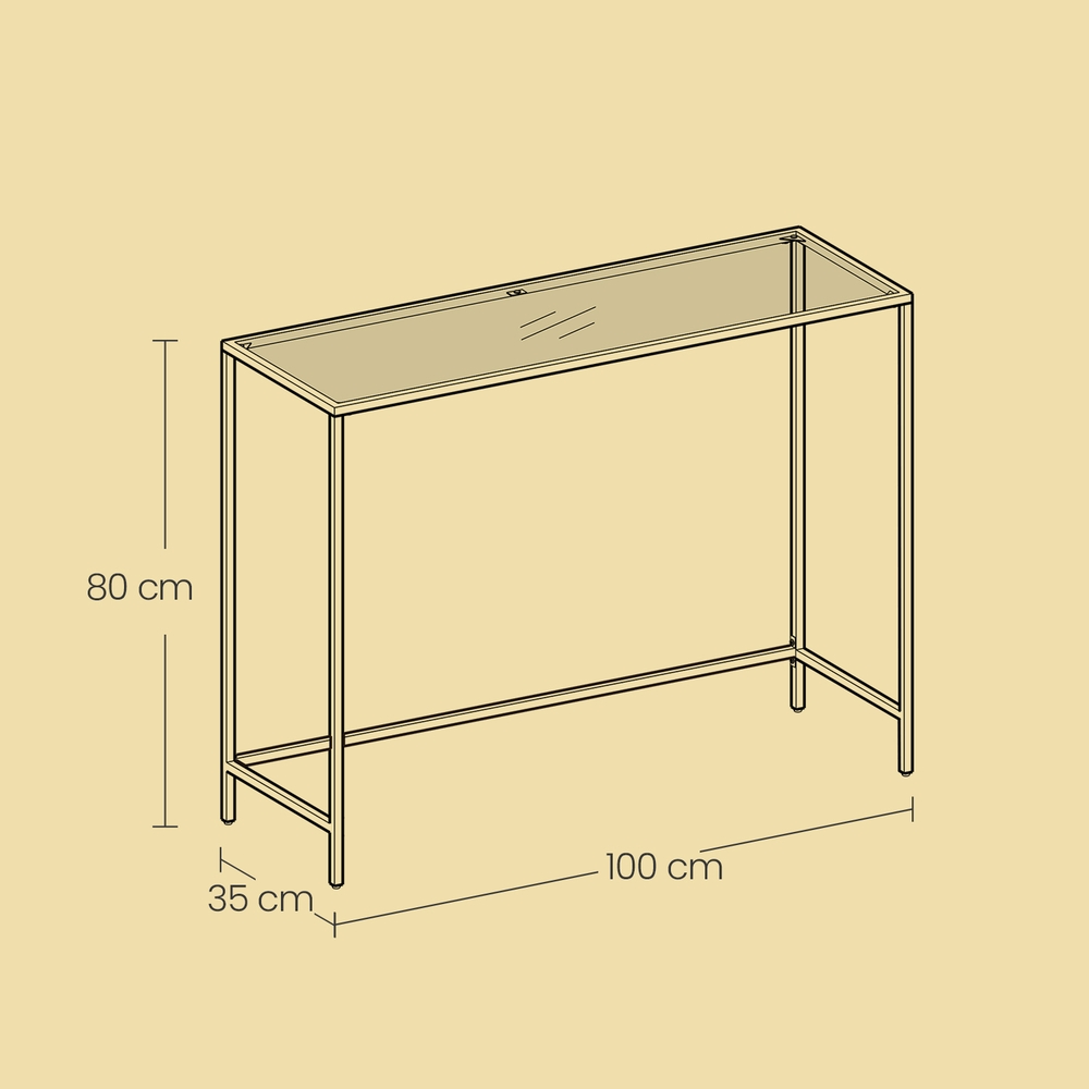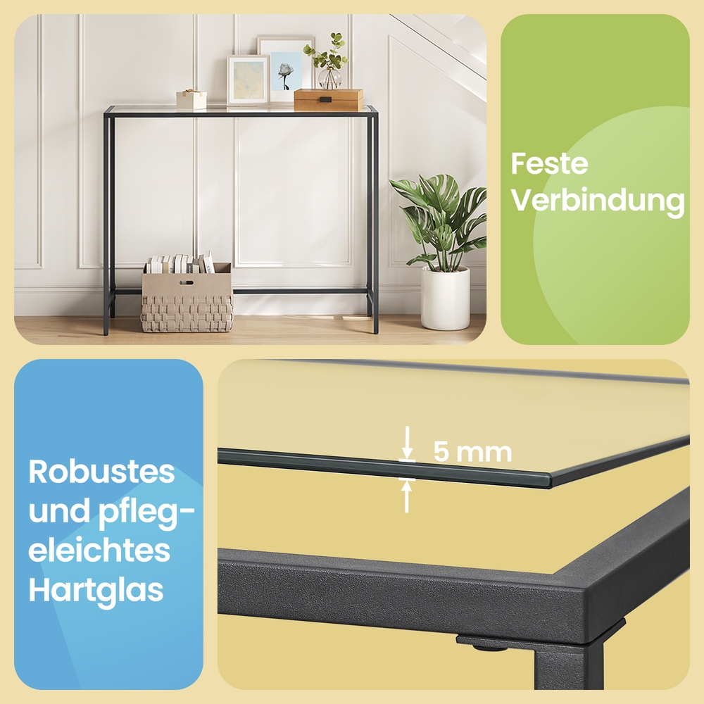 Produktdetaljer: – Färg: Svart – Material: Metall, glas – Storlek: 100 x 35 x 80 cm (L x B x H) – Vikt: 8,2 kg – Max. statisk belastningskapacitet: 30 kg Leveransomfattning: – 1 x konsolbord – 1 x tillbehörspaket – 1 x bruksanvisning (DE, EN, ES, FR, IT)