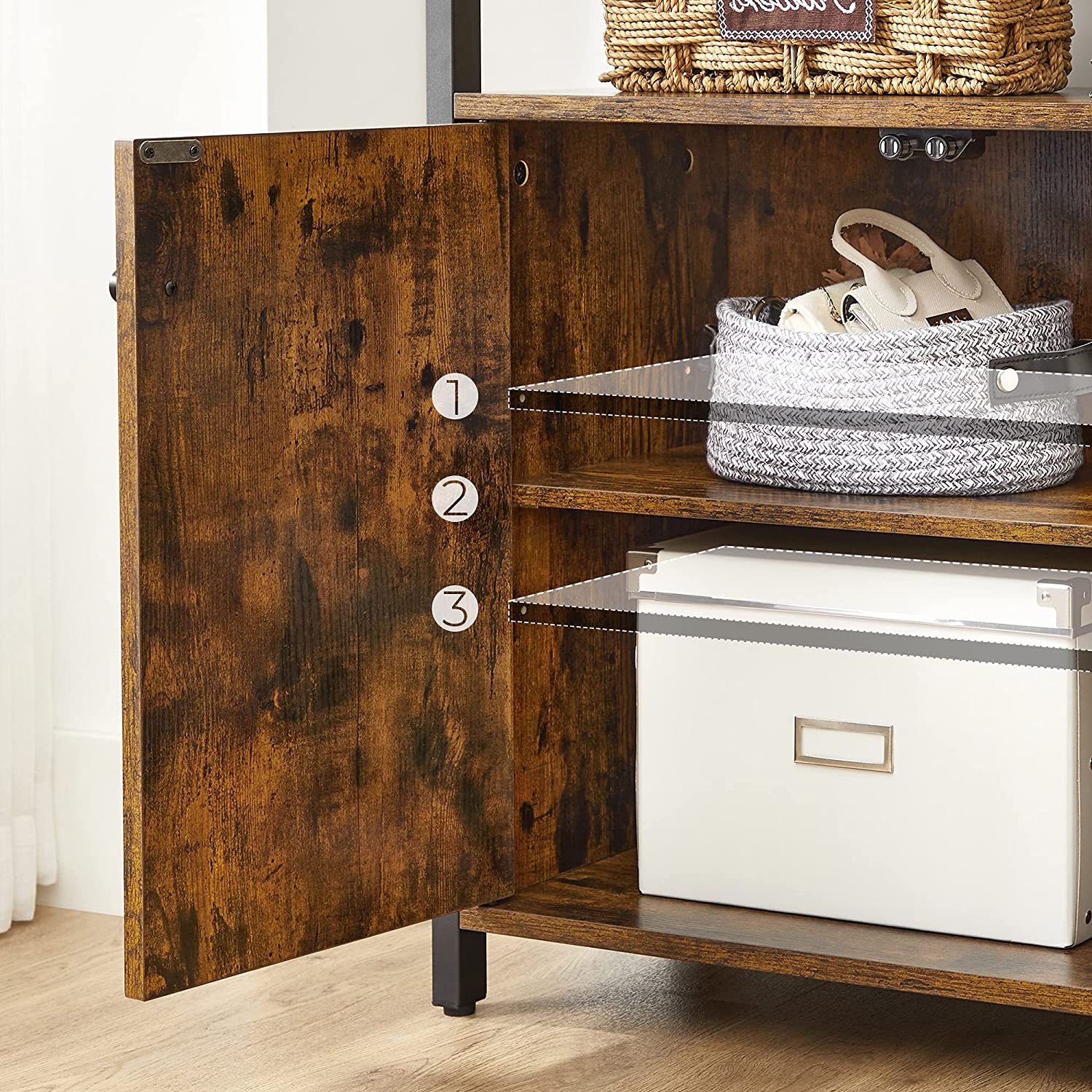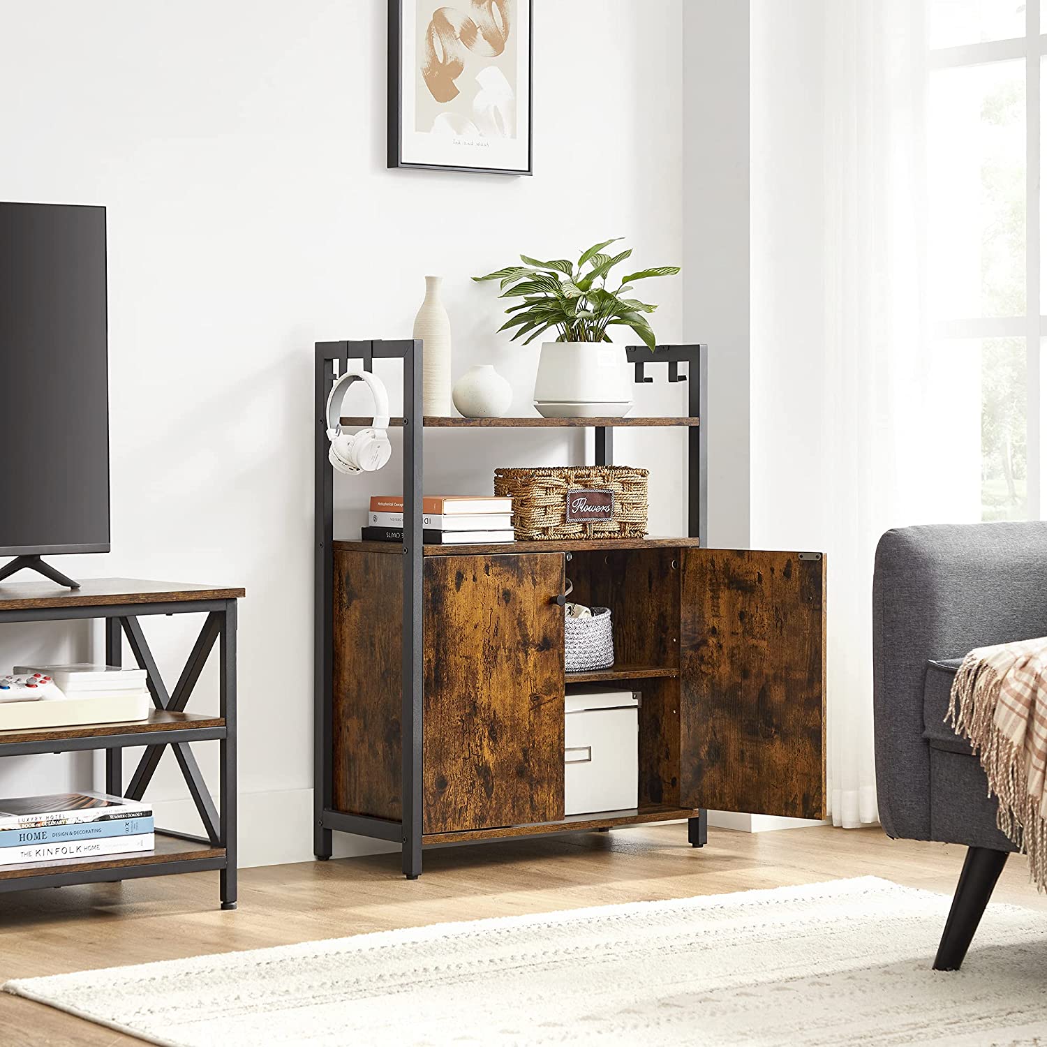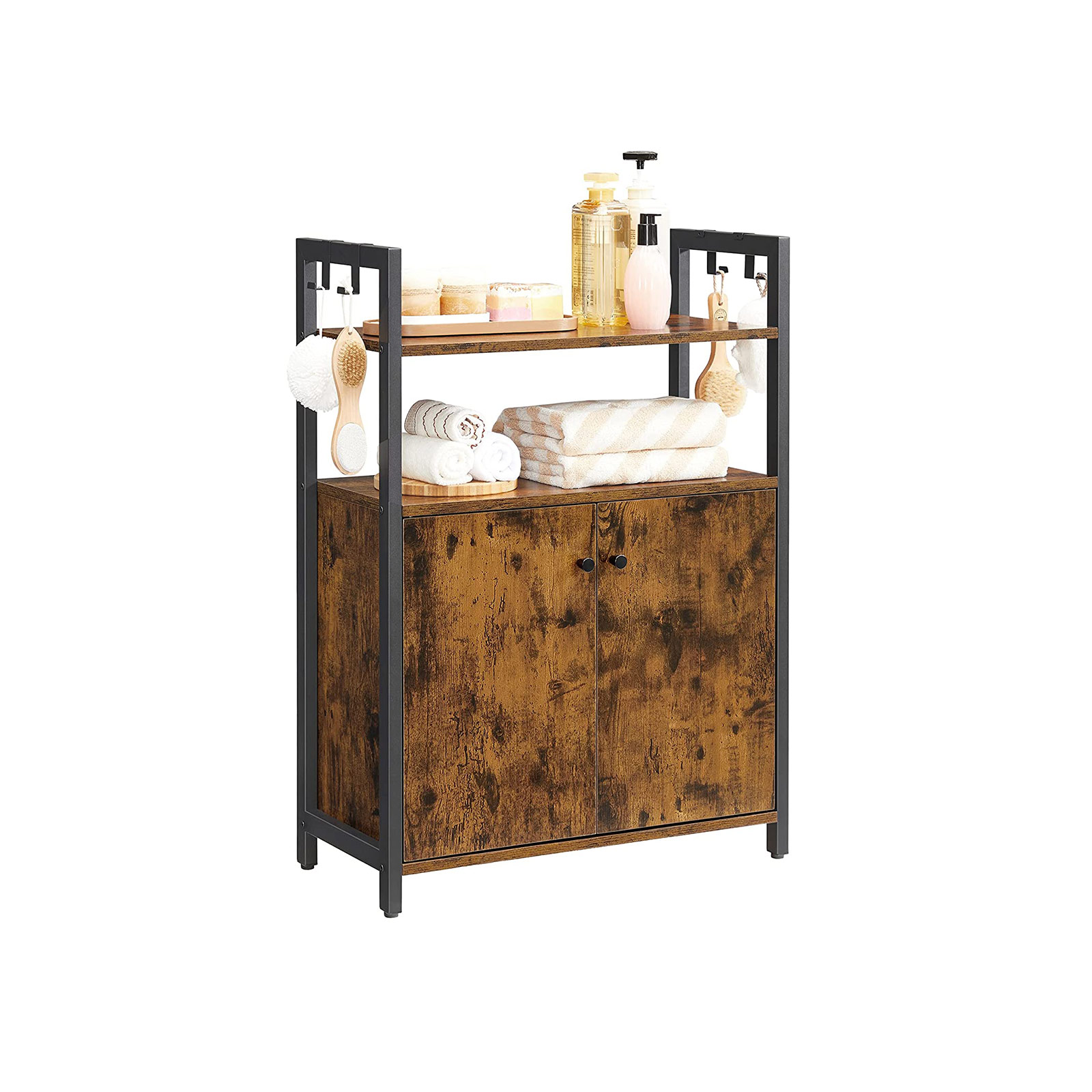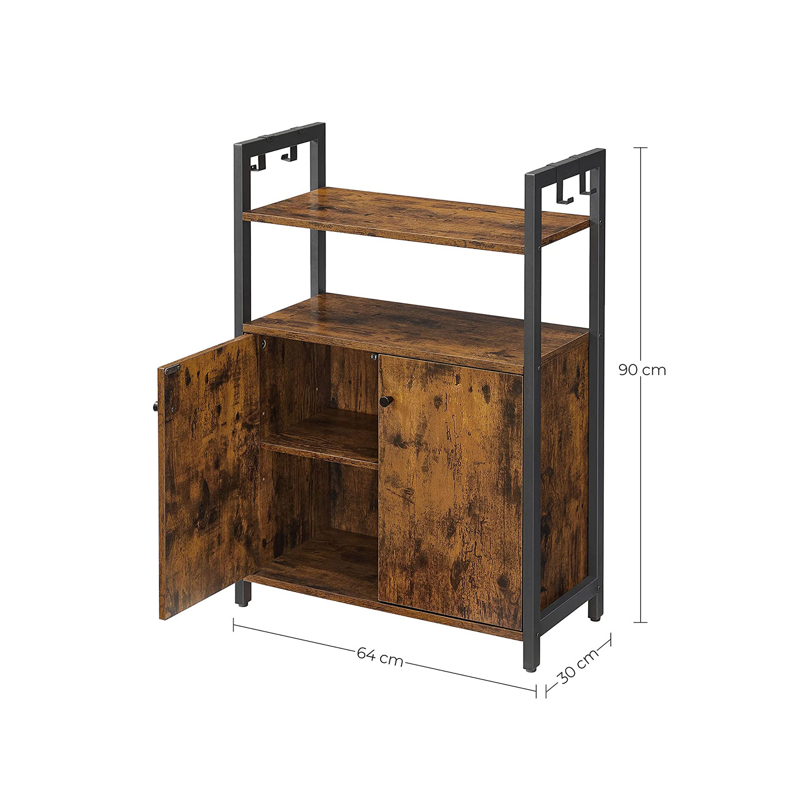 Produktdetaljer: – Färg: Vintagebrun-svart – Material: Spånskiva, stål – Storlek: 64 x 30 x 90 cm (L x B x H) – Vikt: 15 kg – Max. statisk belastningskapacitet på ytan: 15 kg – Max. statisk belastningskapacitet på öppen hyllplan: 15 kg – Max. statisk belastningskapacitet per plan bakom dörrarna: 10 kg Leveransomfattning:- 1 x sidobord – 1 x tillbehörspaket – 1 x tippskydd – 1 x bruksanvisning VASAGLE Anmärkningar: – Av säkerhetsskäl är det förbjudet för barn att klättra på eller leka med produkten. – Fäst denna produkt på väggen med det medföljande tippskyddet för att garantera säker användning.