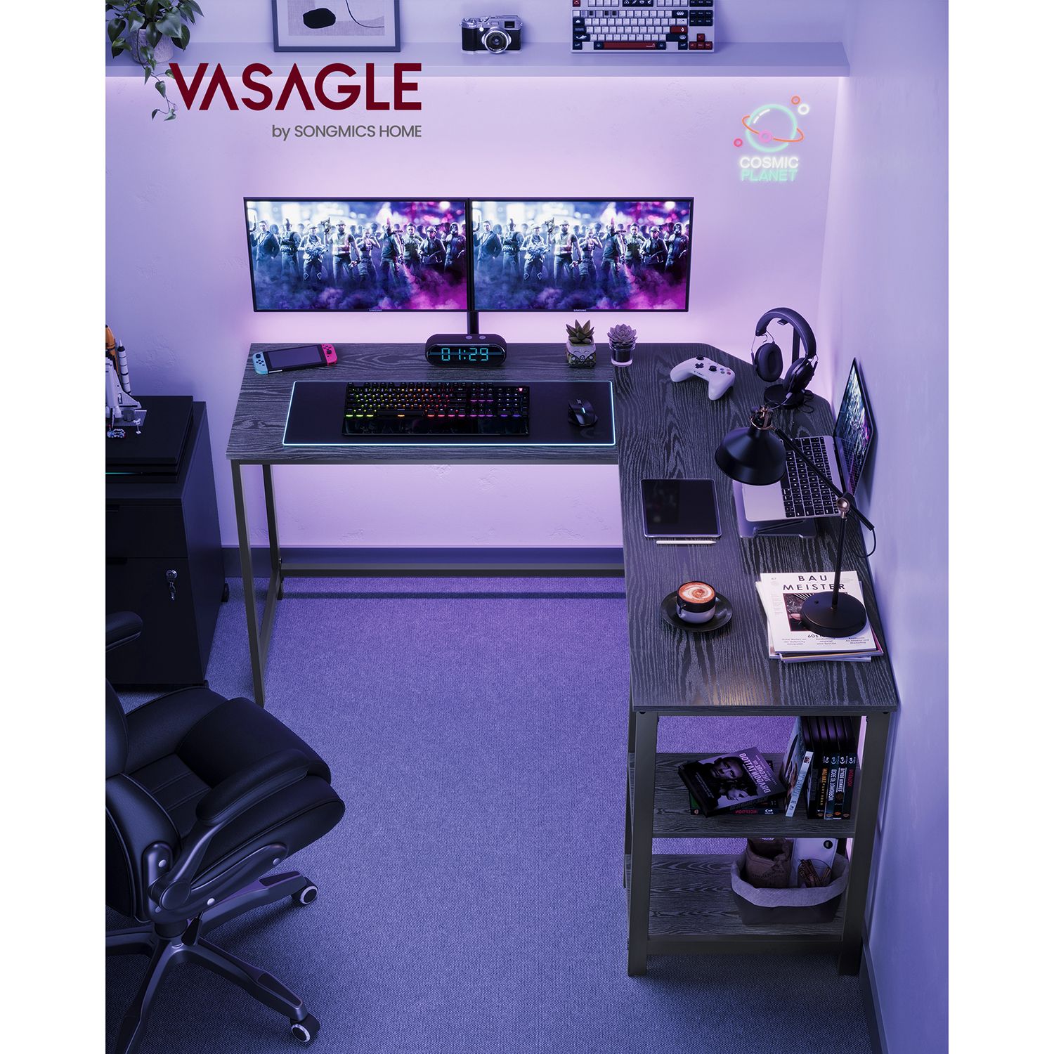VASAGLE skrivbord, L-format datorskrivbord, hörnskrivbord med 2 hyllor, platsbesparande kontorsbord i industriell design, gaming, enkel montering, vintagebrunt-svart LWD72X