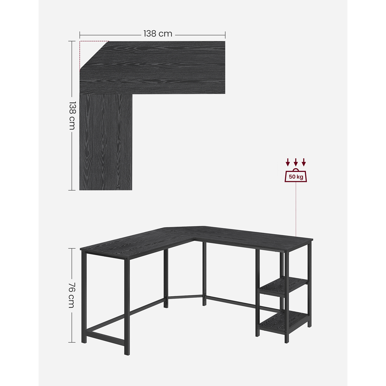 Max. statisk belastningskapacitet per hylla under bordsskivan: 10 kg
