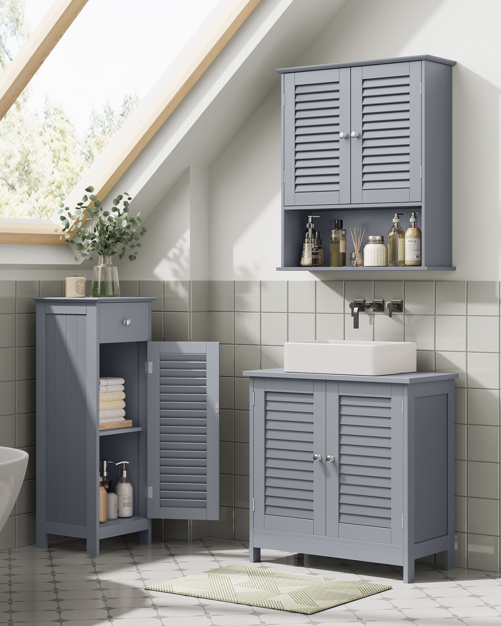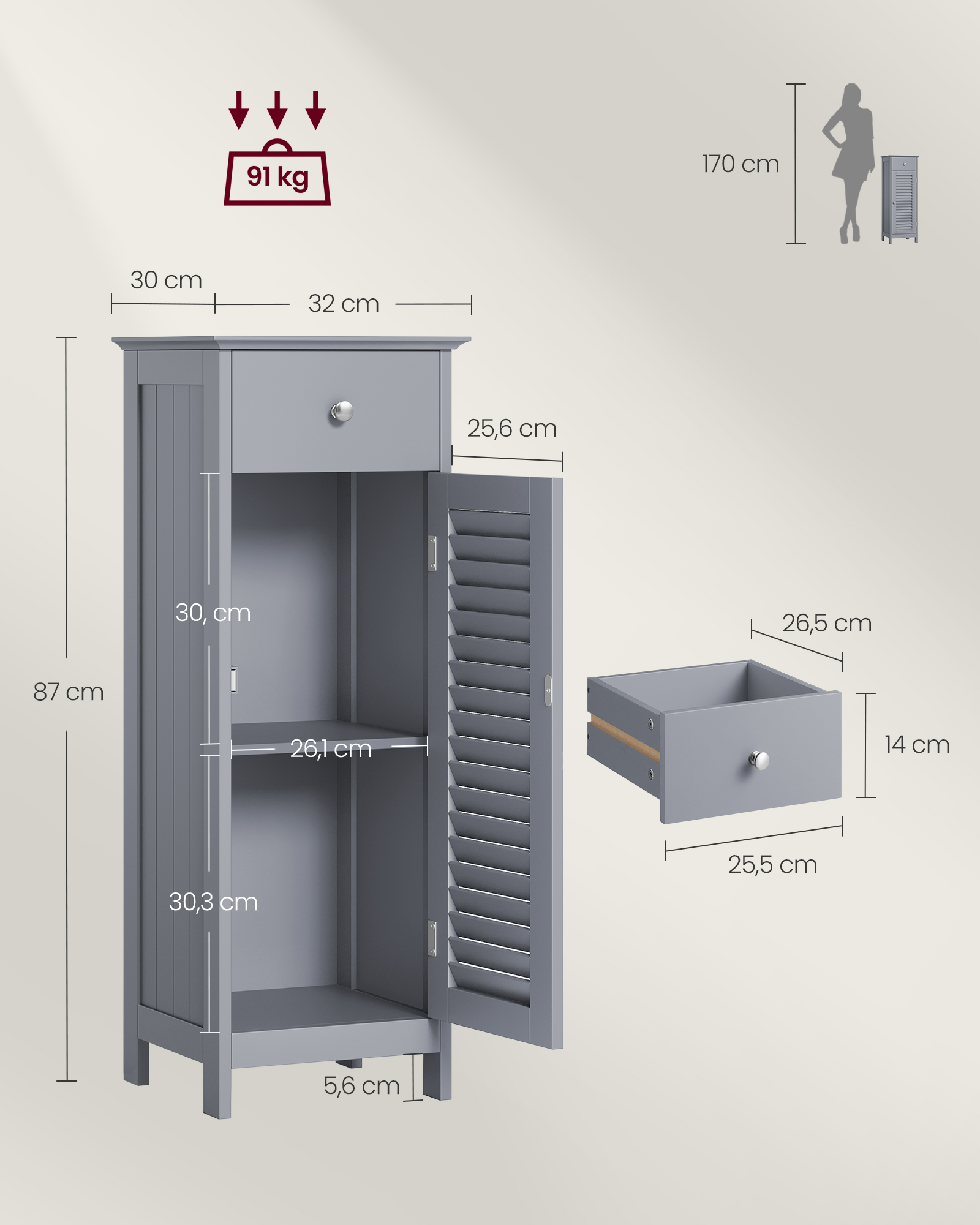 VASAGLE Badrumsskåp, badrumsskåp, sidobord, nattduksbord med låda och lamelldörr, badrum, hall, sovrum, 32 x 87 x 30 cm, vit BBC43WT