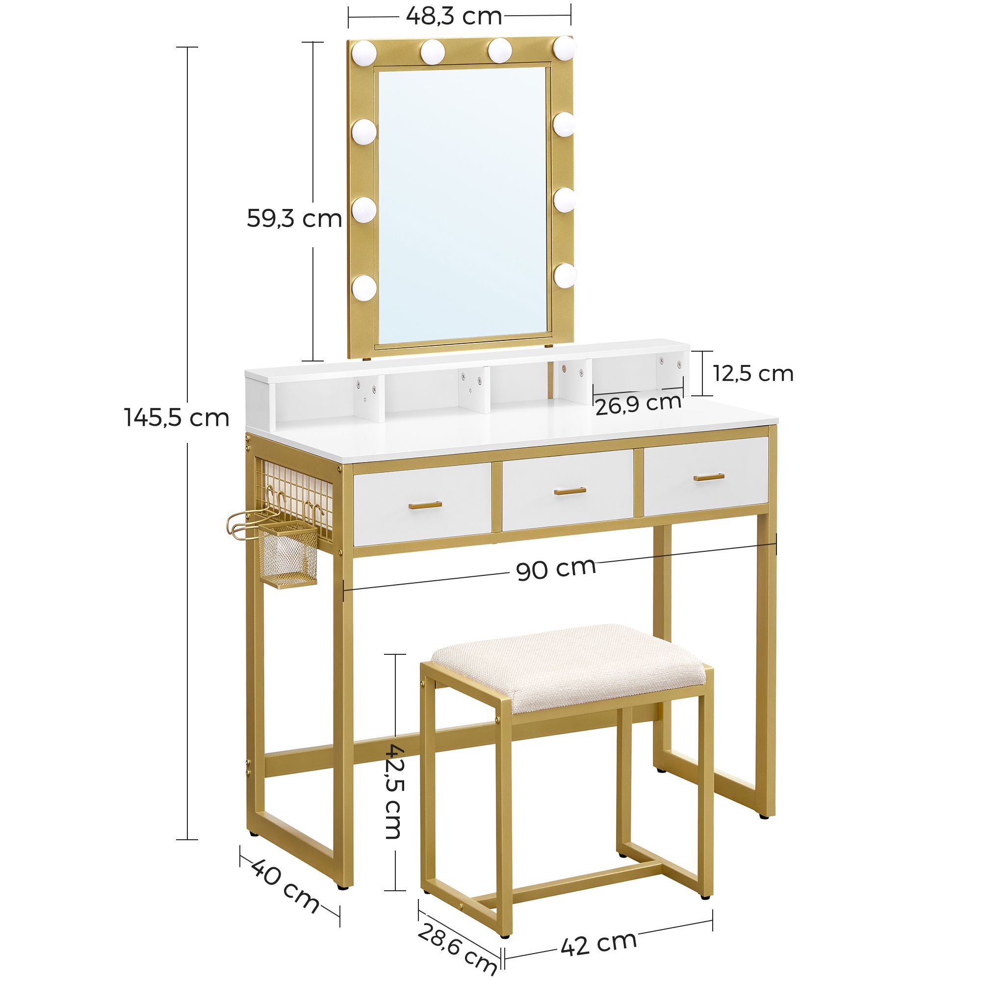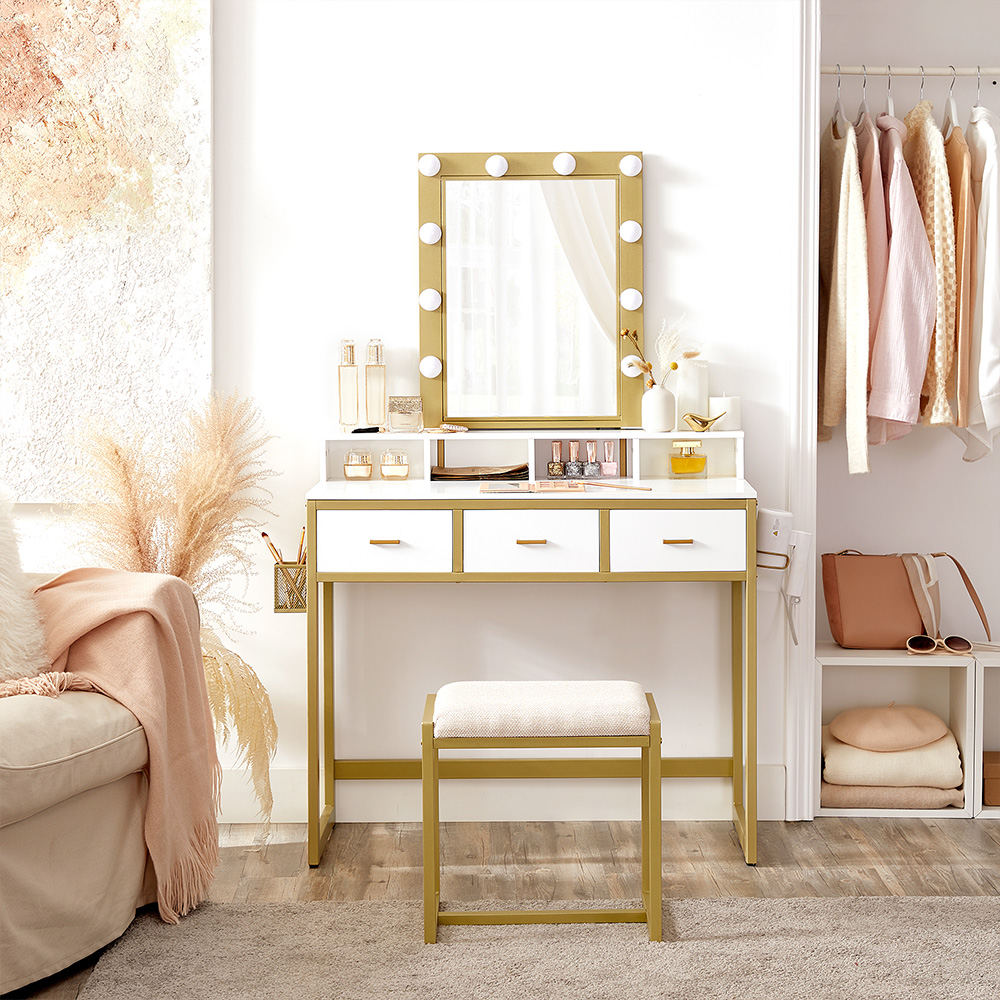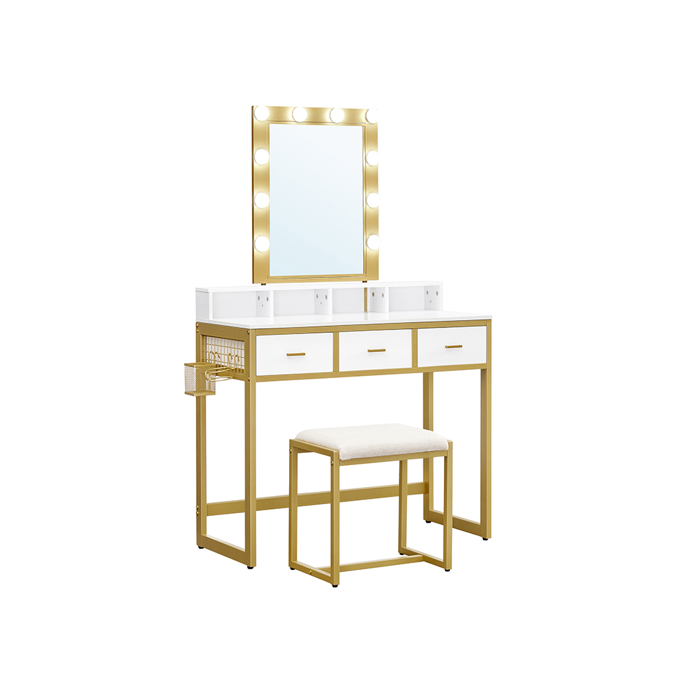 Produktdetaljer: – Färg: Vit-guldfärgad – Material: Spånskiva, stål, glas – Storlek på sminkbordet: 90 x 40 x 145,5 cm (L x B x H) – Vikt: 22,5 kg – Max. statisk belastningskapacitet för pallen: 150 kg Leveransomfattning: – 1 x sminkbord – 1 x pall – 1 x tippskydd – 1 x tillbehörspaket – 1 x bruksanvisning VASAGLE Anvisningar: – Av säkerhetsskäl är det förbjudet för barn att klättra på eller leka med produkten. – Pallens maximala statiska belastningskapacitet är 150 kg. Överskrid inte denna maximala vikt. – Fäst produkten på väggen med det medföljande tippskyddet för att garantera säkerheten under användning.