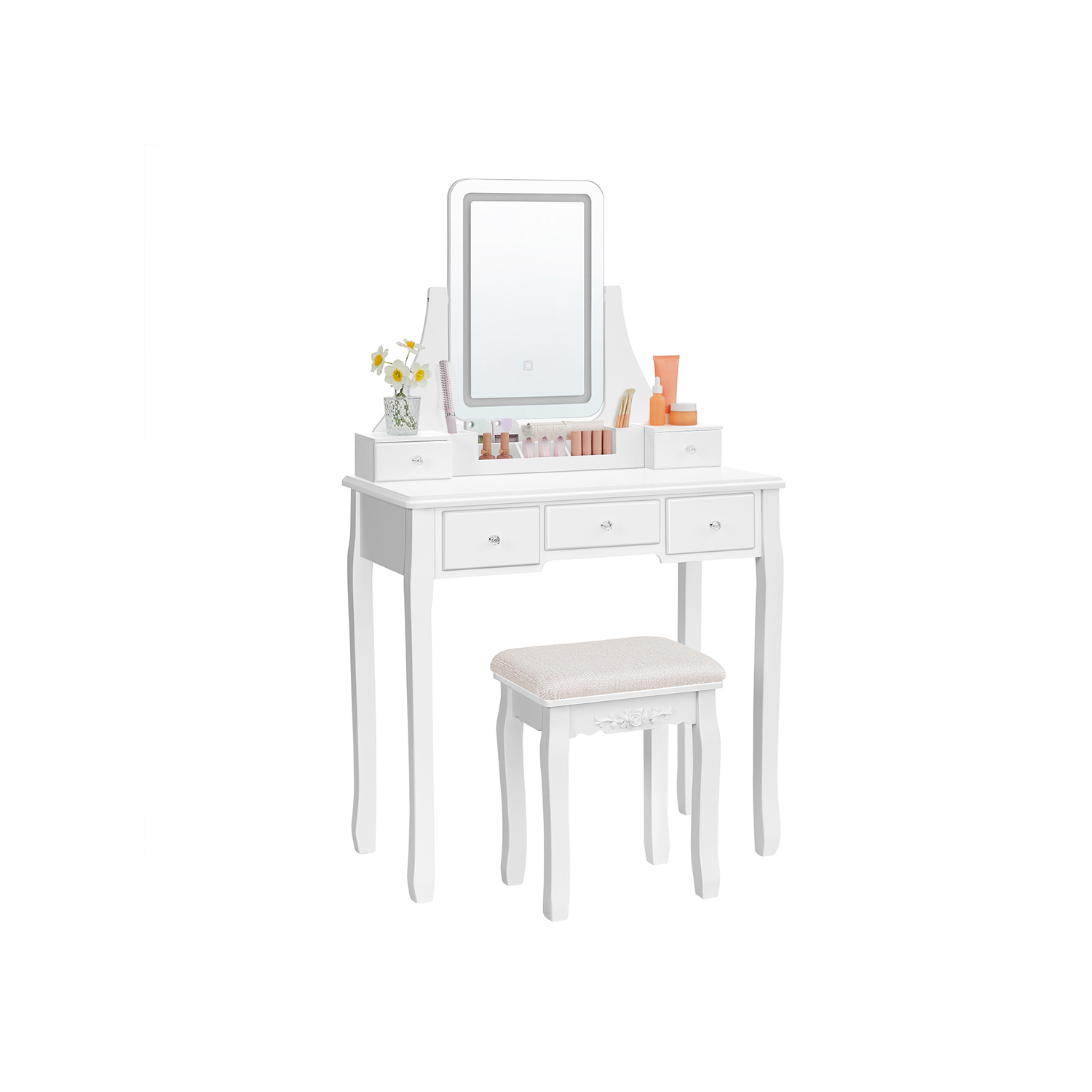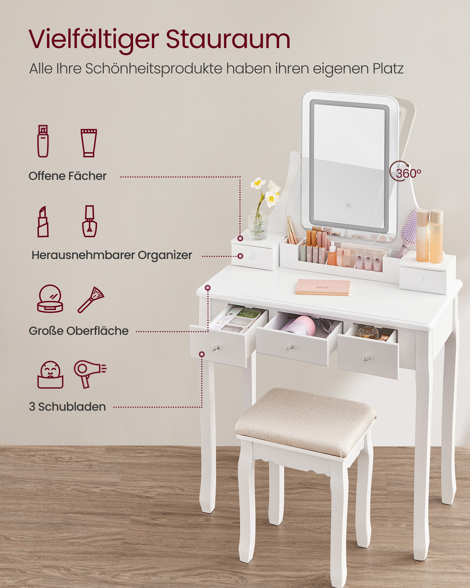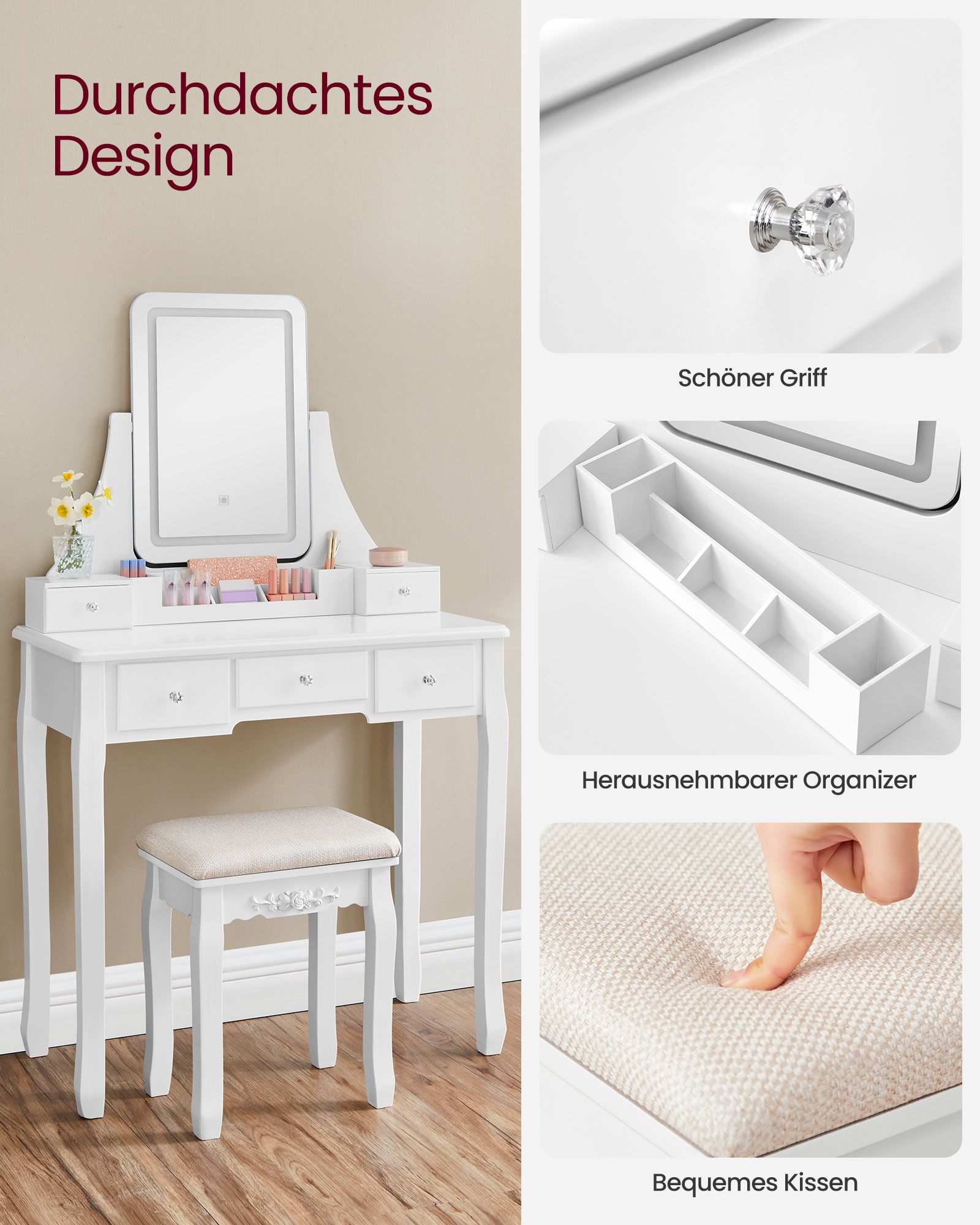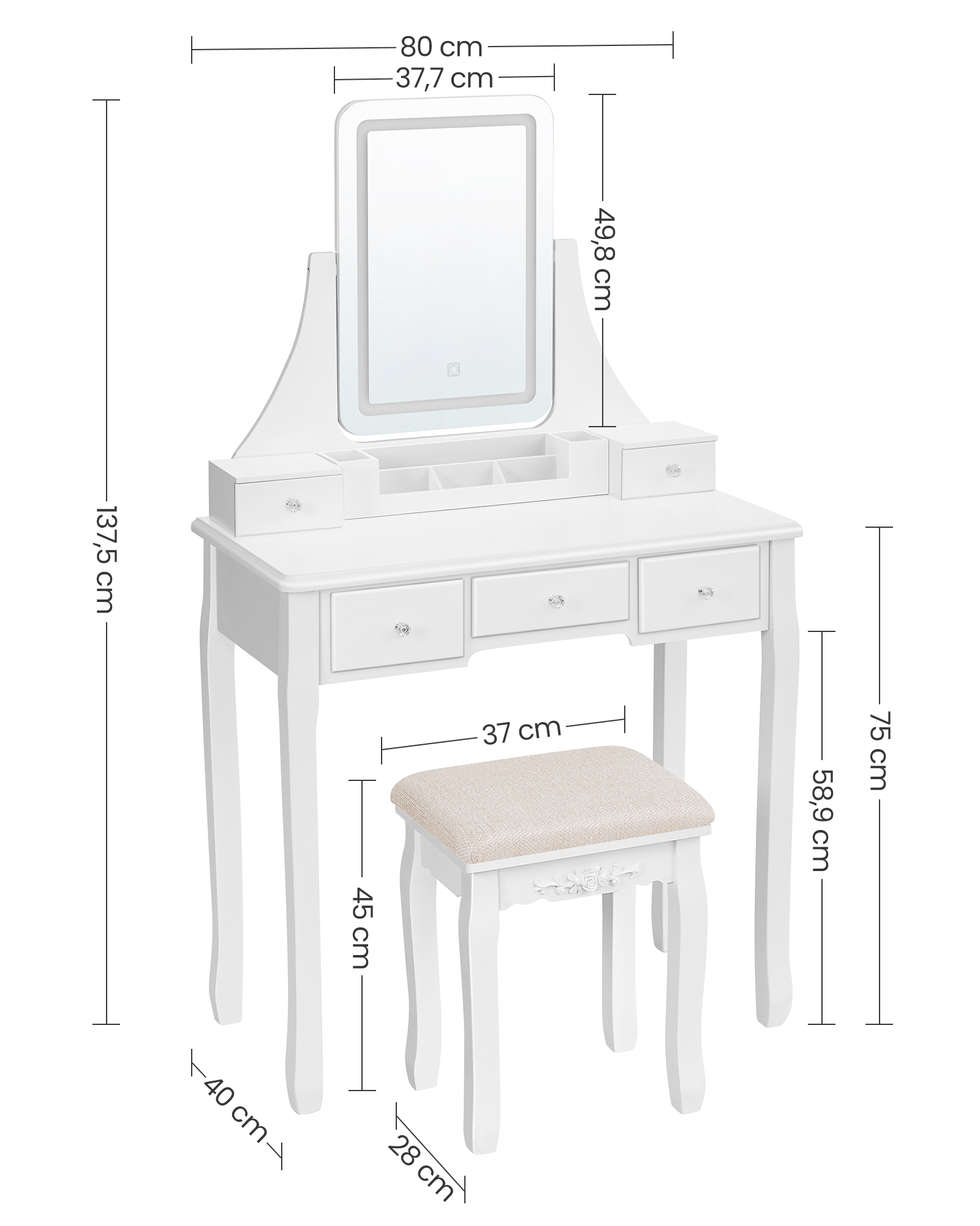 Produktdetaljer: Färg: Vit Material: MDF (medeldensitetsfiberplatta), bordsben av furu, pallben av gummiträ, skumplast, klädsel av linne-bomullsblandning Storlek sminkbord: 80 x 40 x 137,5 cm (L x B x H) Storlek pall: 37 x 28 x 45 cm (L x B x H) Vikt: 19,5 kg Max. statisk bärförmåga för pallen: 130 kg Leveransomfattning: 1 x sminkbord 1 x pall 1 x tillbehörspaket 1 x tippskydd 1 x bruksanvisning (DE, EN, FR, ES, IT) VASAGLE Anmärkningar:Av säkerhetsskäl får barn inte klättra på eller leka med produkten. Montera produkten enligt anvisningarna. Håll produkten borta från vatten. Fäst produkten på väggen med det medföljande tippskyddet. Lyft produkten om du vill flytta den till en annan plats. Dra den inte över golvet.