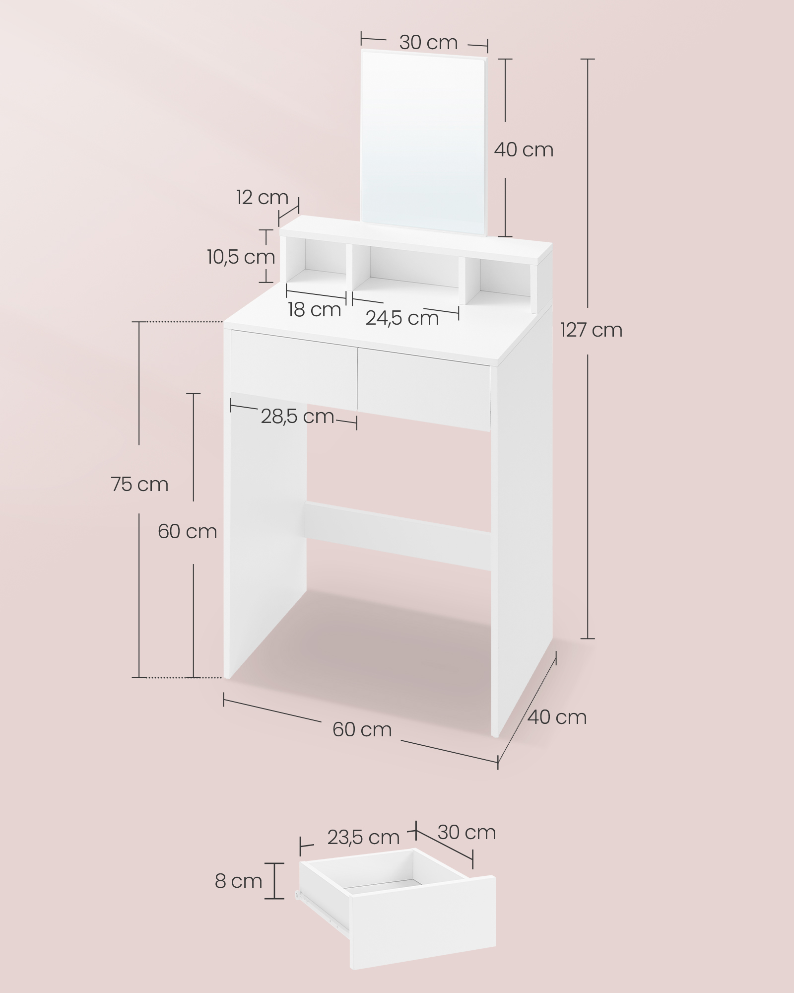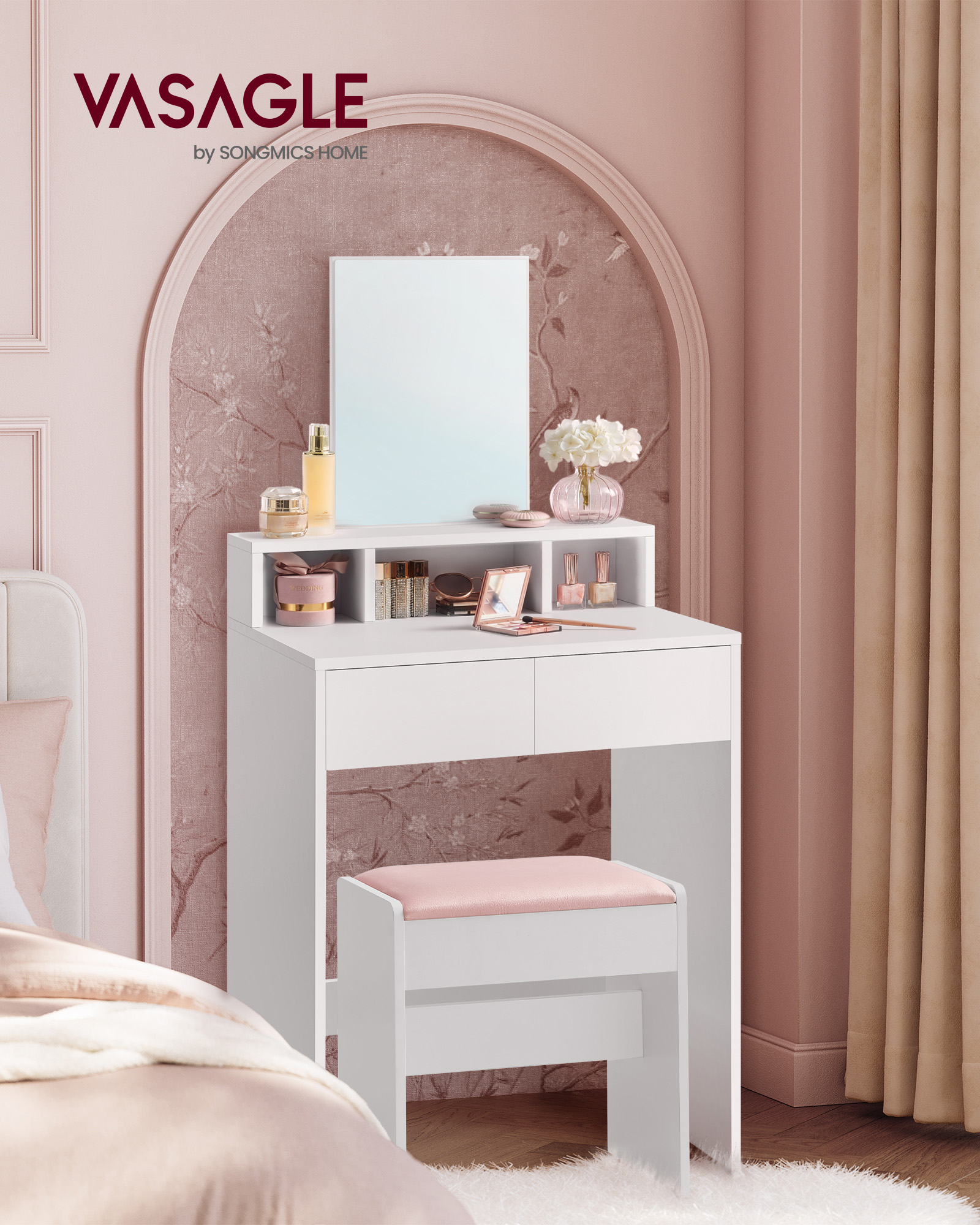 VASAGLE Sminkbord med stor spegel, toalettbord, 2 lådor, 3 öppna fack, sminkbord, modernt, pastellrosa RDT103R01
