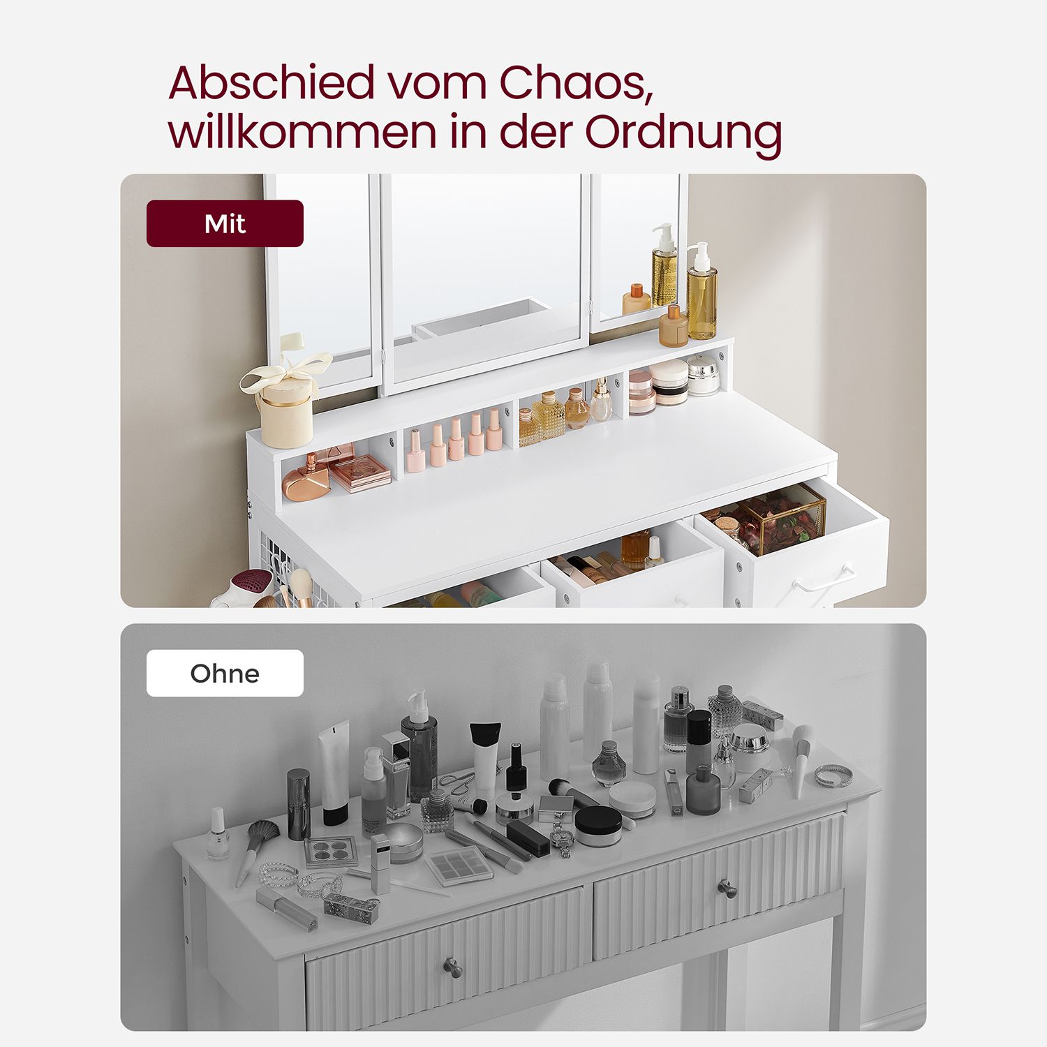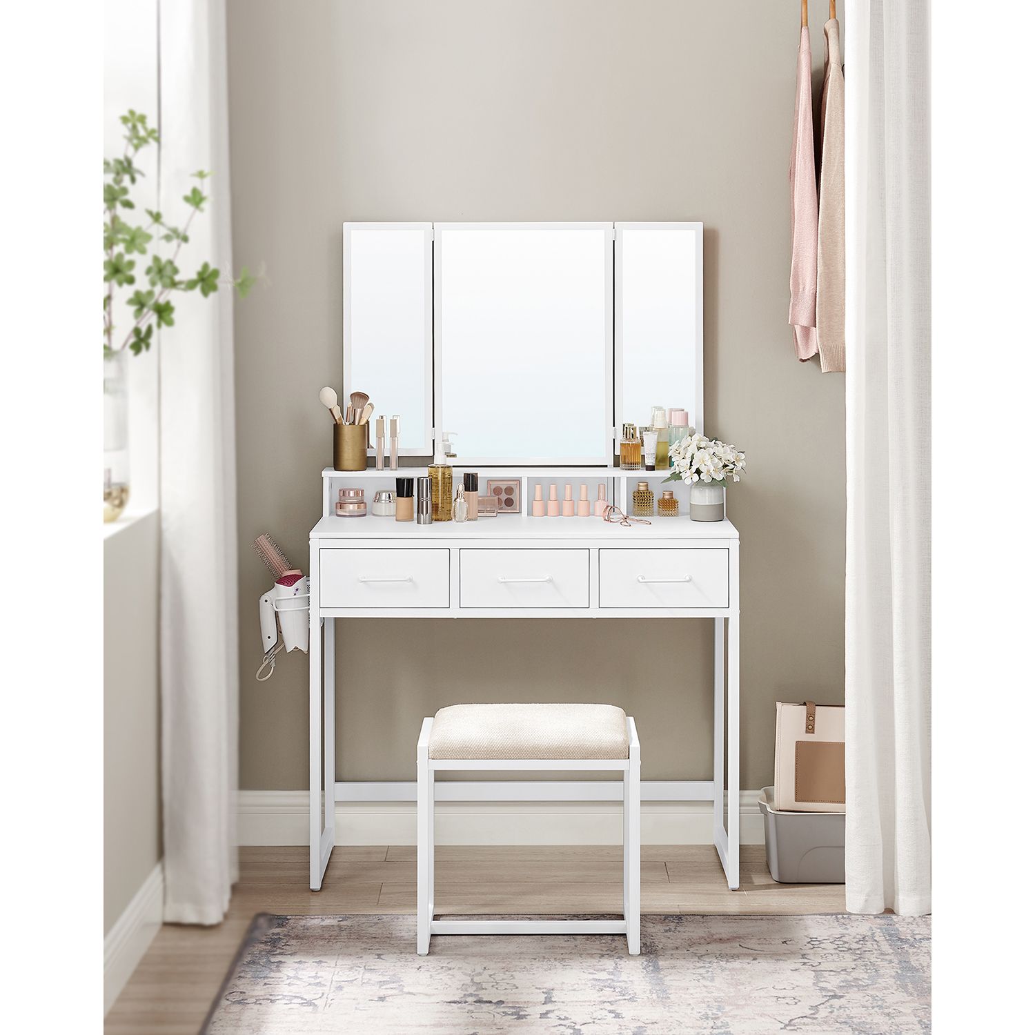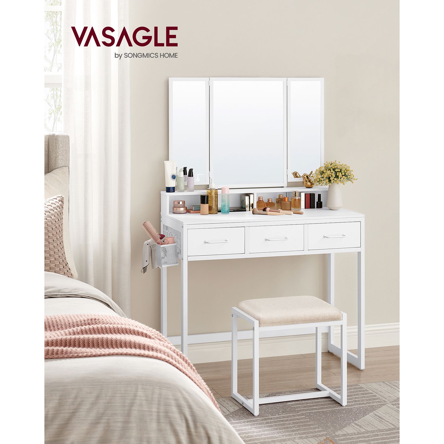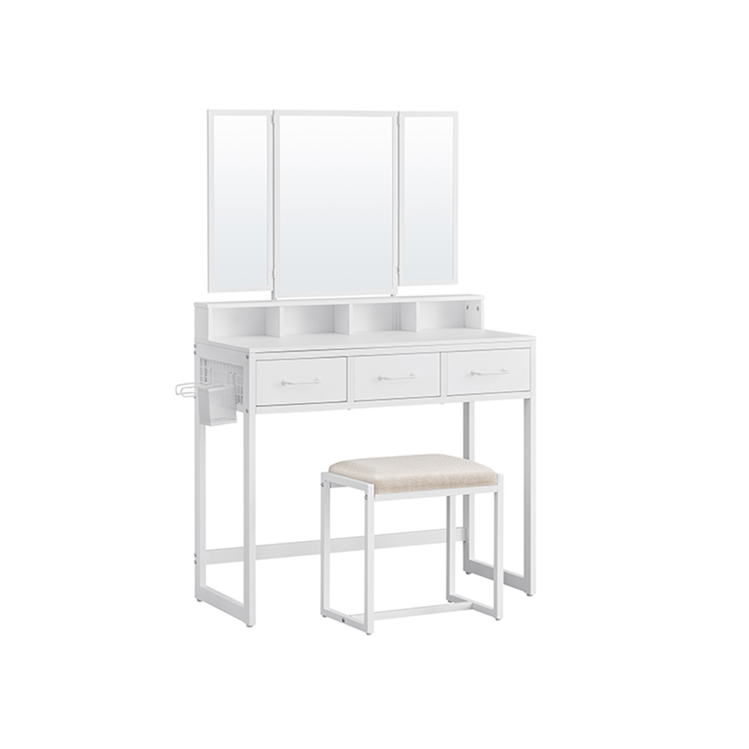 VASAGLE sminkbord, toalettbord med 3-delad fällbar spegel, hårtorkhållare, sminkbord med stoppad pall, 3 lådor, industriell design, vintagebrun-svart RVT004B01