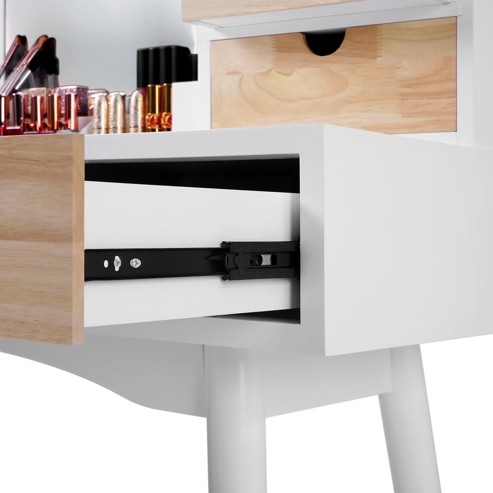 Ägna dig åt din skönhet. Sminka dig perfekt innan du lämnar huset på morgonen och ta bort sminket igen innan du går och lägger dig på kvällen. Tack vare den stora bordsskivan, de 2 öppna och stängda facken, 1 avtagbar organizer och 2 djupa lådor är detta sminkbord den perfekta hjälpredan för din dagliga skönhetsrutin.En pålitlig partner Detta sminkbord övertygar inte bara med sitt tidlösa utseende, utan också med sin solida materialmix av gummiträ och MDF. Du kan förvara dina skönhetsprodukter säkert i och på bordets olika delar. Sätt dig på den stabila pallen och beundra dig själv i den stora spegeln! Specifikationer: – Färg: Vit, natur. – Material: MDF (medeldensitetsfiberplatta), gummiträ, glas – Mått på sminkbord: 90 x 40 x 146 cm (L x B x H). – Pallens mått: 32,5 x 32,5 x 46 cm (L x B x H). – Produktvikt: 35,3 kg. – Max. statisk belastningskapacitet för pallen: 130 kg. Leveransomfattning: – 1 x sminkbord med spegel – 1 x pall. – 1 x tillbehörsset. – 1 x tippskyddsset. – 1 x bruksanvisning (eventuellt inte på tyska). VASAGLE Anmärkningar: – Av säkerhetsskäl får barn inte klättra på eller leka med produkten. – Torka av produkten med en ren trasa för daglig rengöring. – Håll produkten borta från vassa och spetsiga föremål för att undvika skador på ytan.