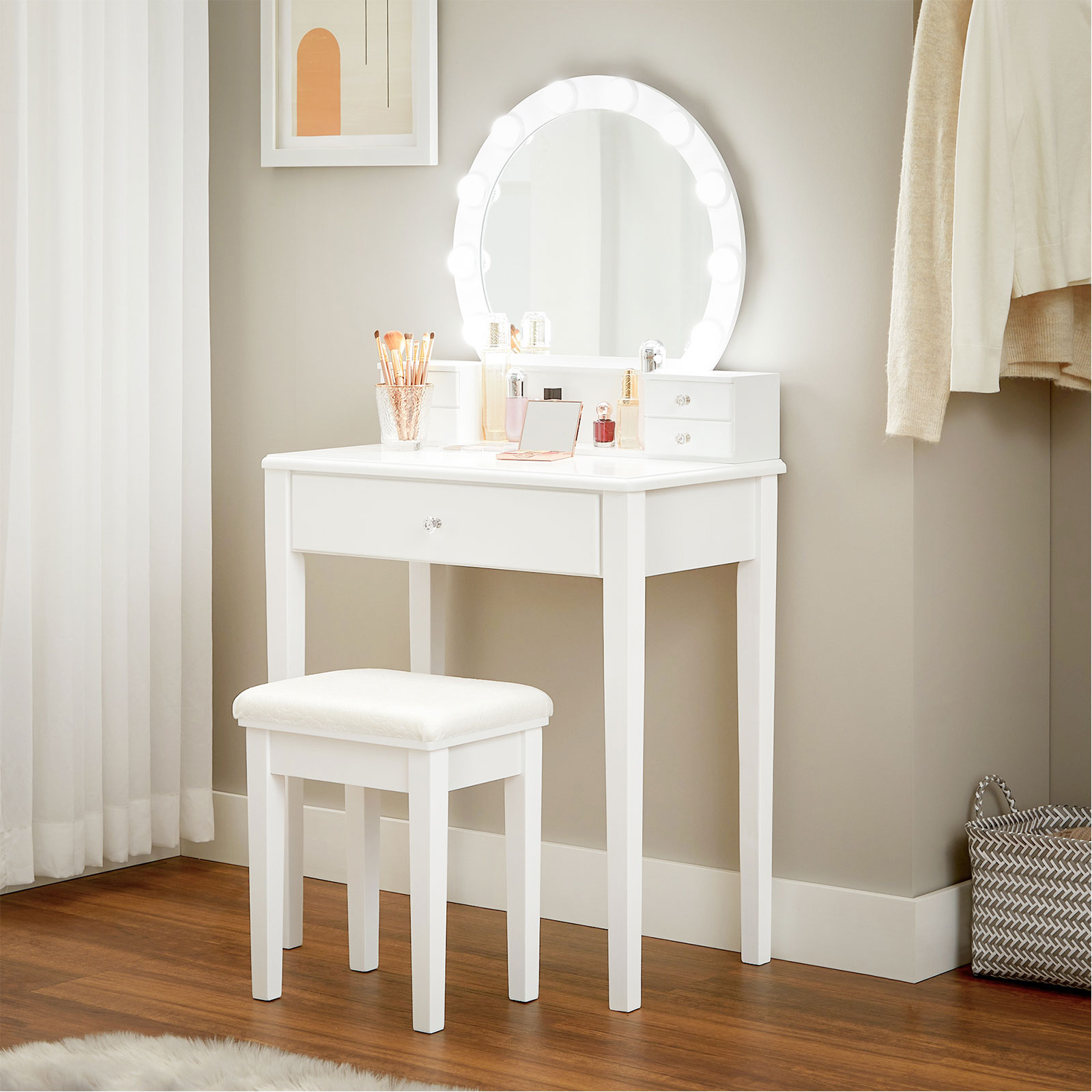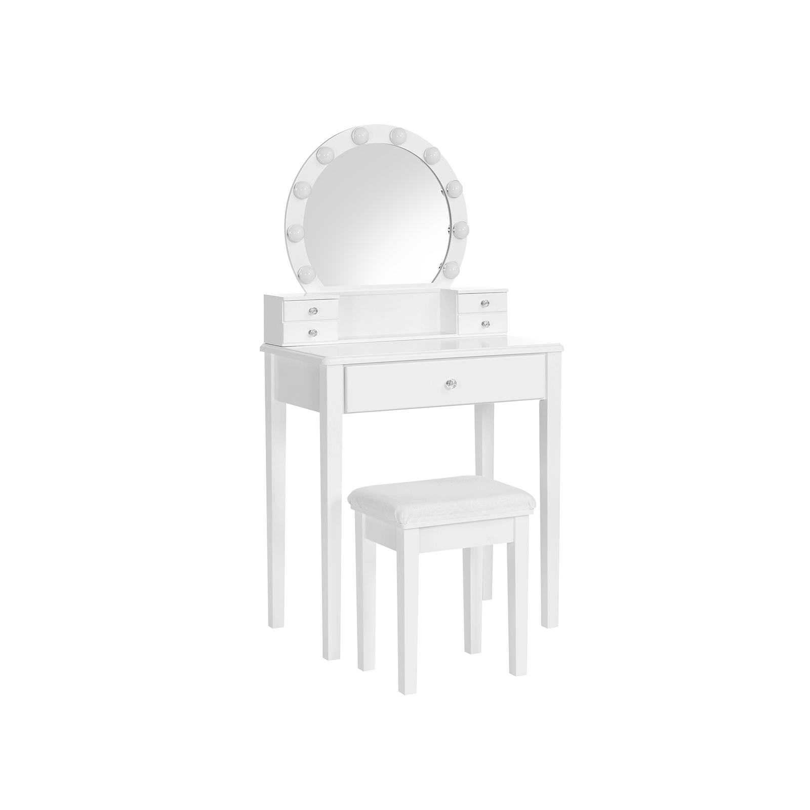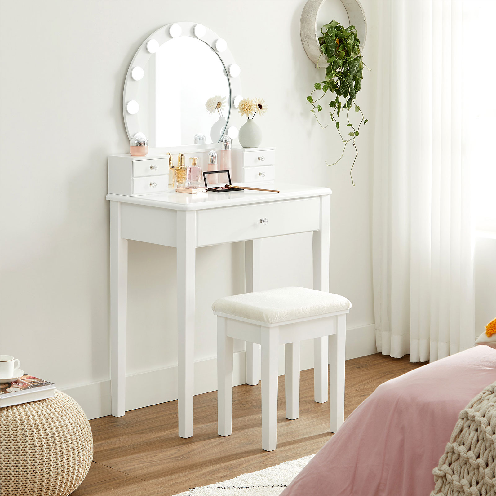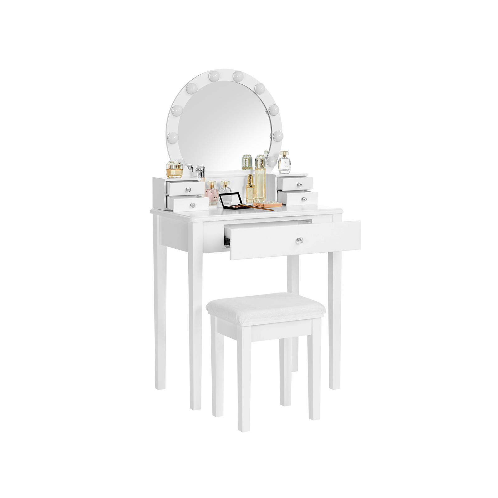 Underlätta din morgonrutin Du behöver inte längre vända upp och ner på hela huset för att hitta läppstiftet som kompletterar din makeup! Sätt dig på den bekväma, stoppade pallen och ta enkelt för dig av de välordnade makeup- och hudvårdsprodukterna på sminkbordet. Från och med nu blir varje morgon underbar. En förtrollande present En fantastisk presentidé till födelsedagen, julen eller en annan viktig årsdag! Med en stor spegel, gott om förvaringsutrymme och en bekväm pall kommer detta drömlika sminkbord att få alla att le! Produktdetaljer: – Färg: Vit – Material: MDF (medeldensitetsfiberplatta), furu, gummiträ, glas – Storlek på sminkbordet: 70 x 40 x 134 cm (L x B x H) – Storlek på pallen: 40 x 30 x 46 cm (L x B x H) – Vikt: 18 kg – Max. statisk belastningskapacitet för pallen: 130 kg Leveransomfattning: – 1 x sminkbord med spegel – 1 x pall – 1 x tillbehörspaket – 1 x bruksanvisning (DE, EN, FR, IT, ES) VASAGLE Anmärkningar:- Av säkerhetsskäl får barn inte klättra på eller leka med produkten. – Håll produkten borta från kemikalier. – Torka av produkten med en fuktig trasa för daglig rengöring.