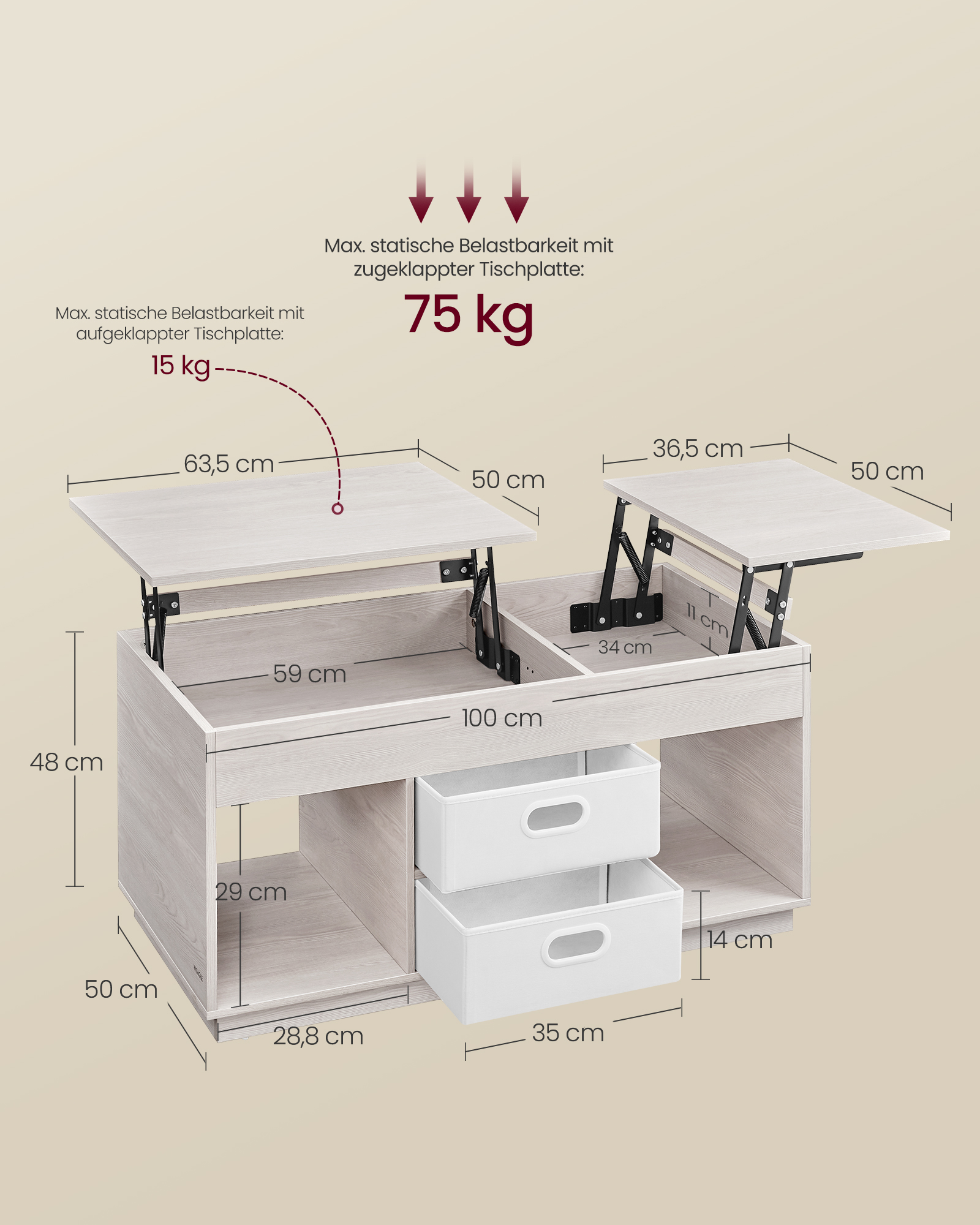VASAGLE soffbord, höj- och sänkbart vardagsrumsbord, 2 lådor och dolda fack, kaffebord, öppna fack, för vardagsrum, hemmakontor, snövit LCT210W01