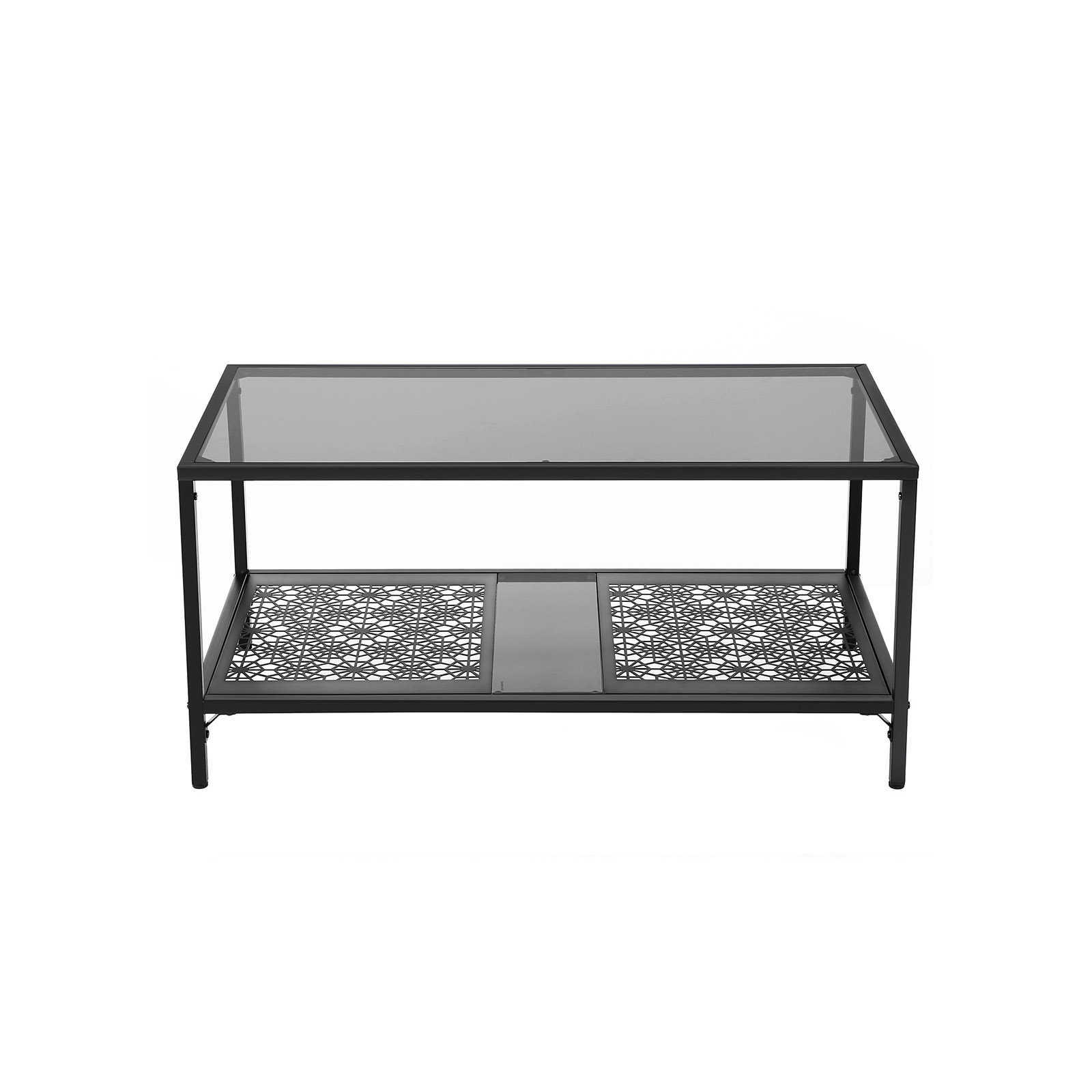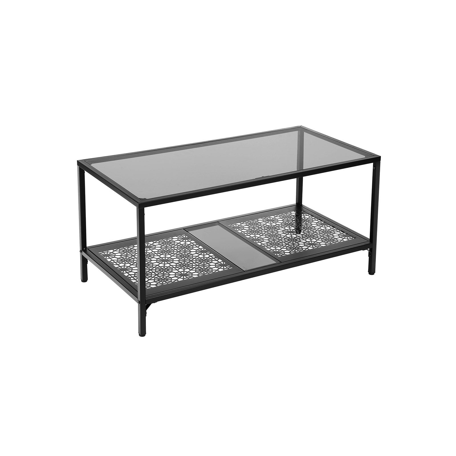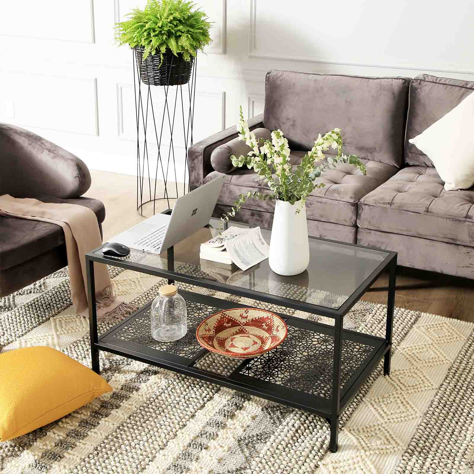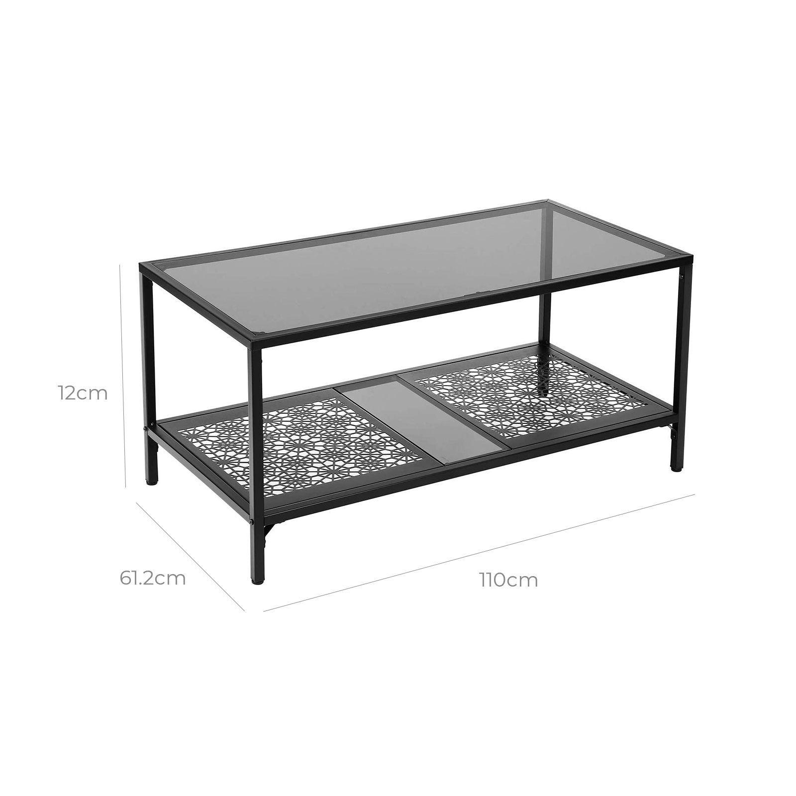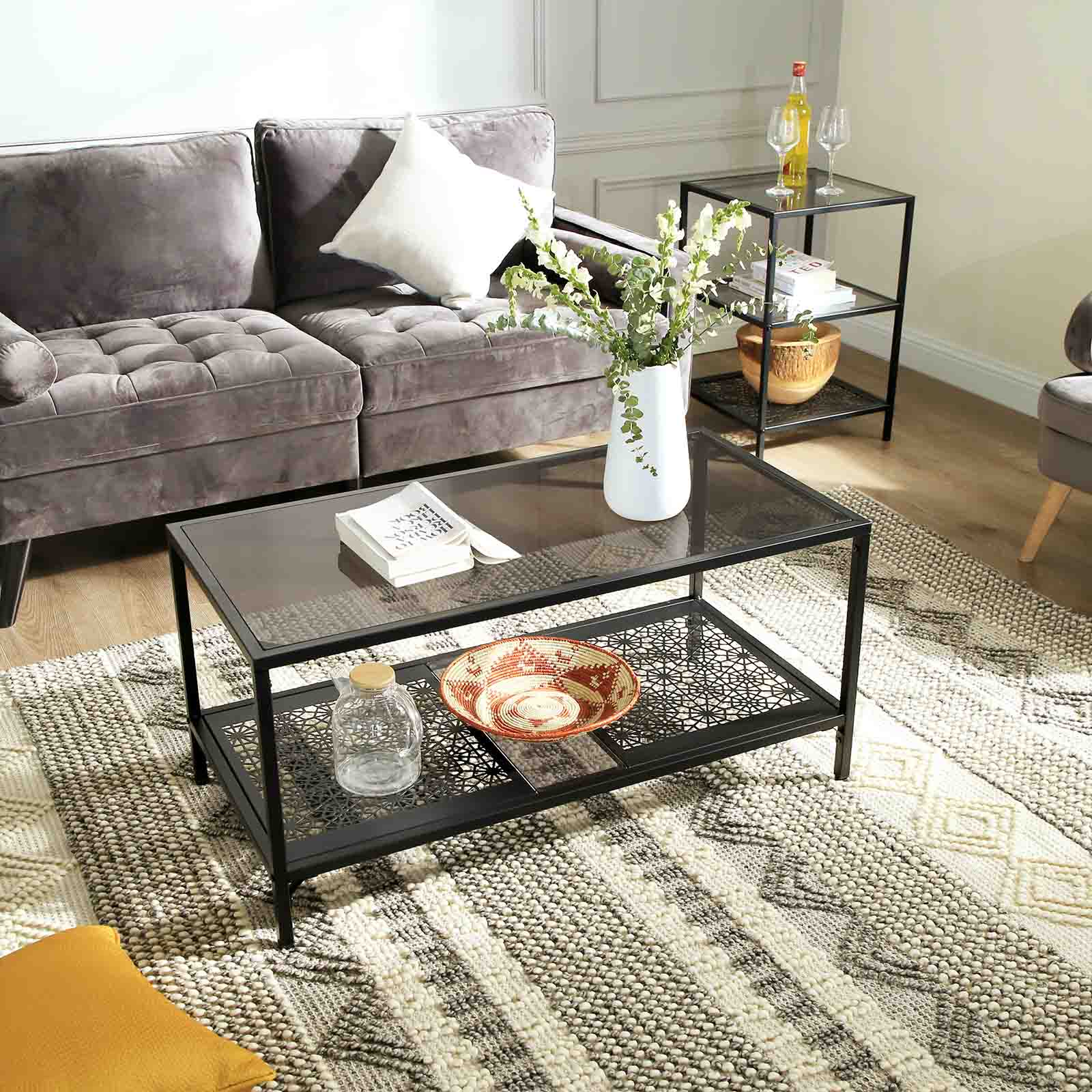 Elegant soffbord med iögonfallande dekorationer. De har till exempel designat det glasbord som visas ovan, vilket inte bara ger dig en ny dekoration med blommönster, utan också en generös bordsskiva och förvaringsyta.Glasytan tål en belastning på upp till 60 kg, hyllan i nedre delen tål upp till 30 kg. Du kan alltså ställa även tunga fruktskålar eller stora blomvaser på detta bord. Detta vardagsrumsbord bör inte vara det enda blickfånget i din lägenhet. Ta gärna en titt på de andra accentmöblerna i VASAGLE:s serie av industriella glasmöbler. Produktdetaljer: – Färg: Svart, gråaktig glasplatta – Material: Järn, härdat glas – Storlek: 100 x 50 x 48 cm (L x B x H) – Vikt: 14,4 kg – Max. statisk belastningskapacitet för glasytan: 60 kg – Max. statisk belastningskapacitet för hyllan med blommönster: 30 kg Leveransomfattning: – 1 x vardagsrumsbord med glasytan – 1 x tillbehörspåse – 1 x instruktioner (DE, EN, FR, IT, ES)