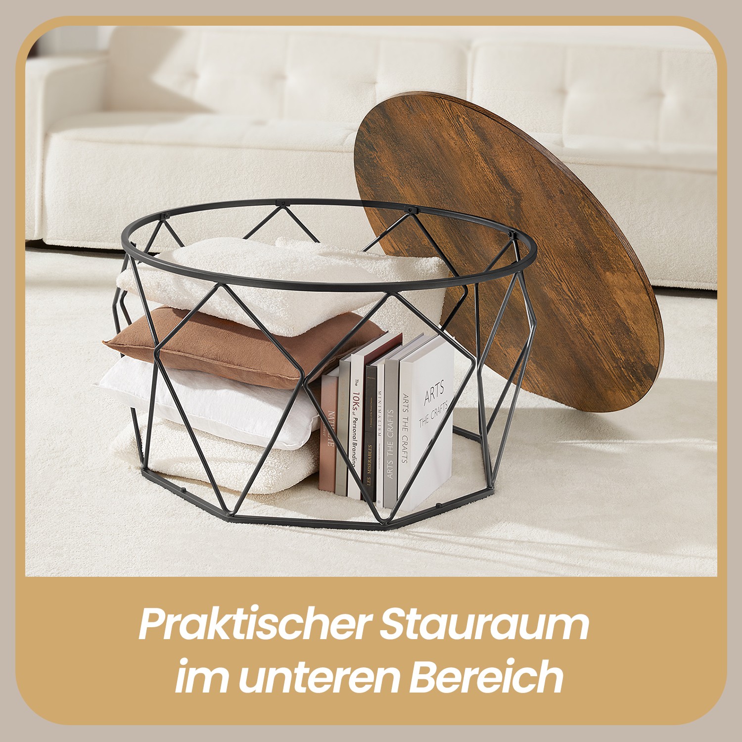 Produktdetaljer: – Färg: Vintagebrun-svart – Material: Spånskiva, stål – Storlek på soffbordet: 80 x 45 cm (Ø x H) – Vikt: 8,8 kg – Max. statisk belastningskapacitet: 30 kg Leveransomfattning: – 1 x soffbord – 1 x tillbehörspaket – 1 x bruksanvisning VASAGLE Anmärkningar: – Av säkerhetsskäl är det förbjudet för barn att klättra på eller leka med produkten. – Ta bort bordsskivan när du flyttar produkten. – Dra inte produkten över golvet för att undvika skador genom att produkten välter eller tippar.