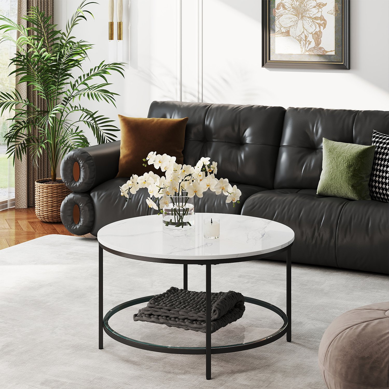 Soffbord, vardagsrumsbord, soffbord, för vardagsrum, med glasplatta, mycket förvaringsutrymme, enkel montering, marmorvit-bläck svart