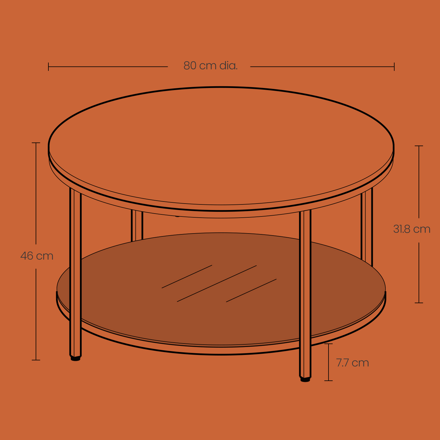 – Storlek (med justerbara fötter): 80 cm d, 46 cm H