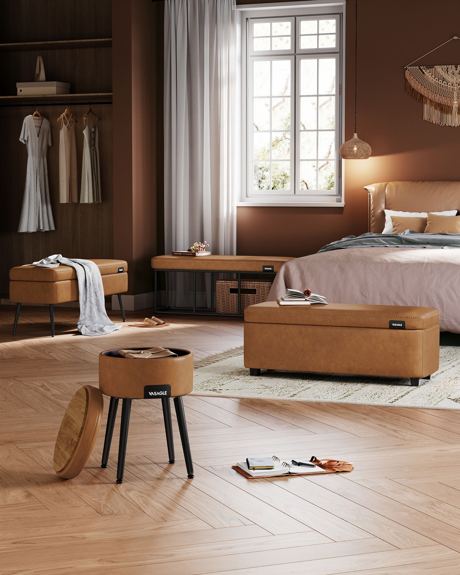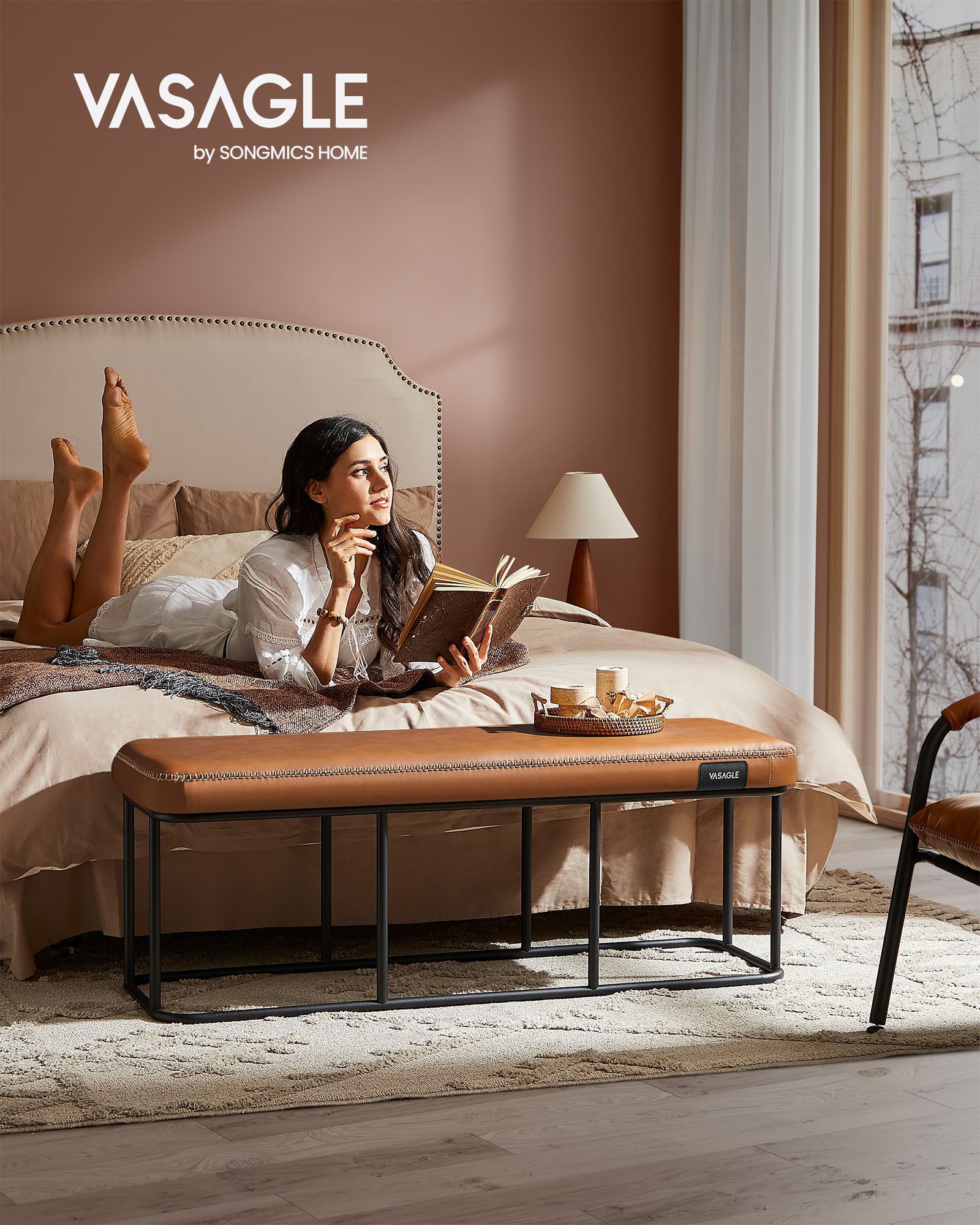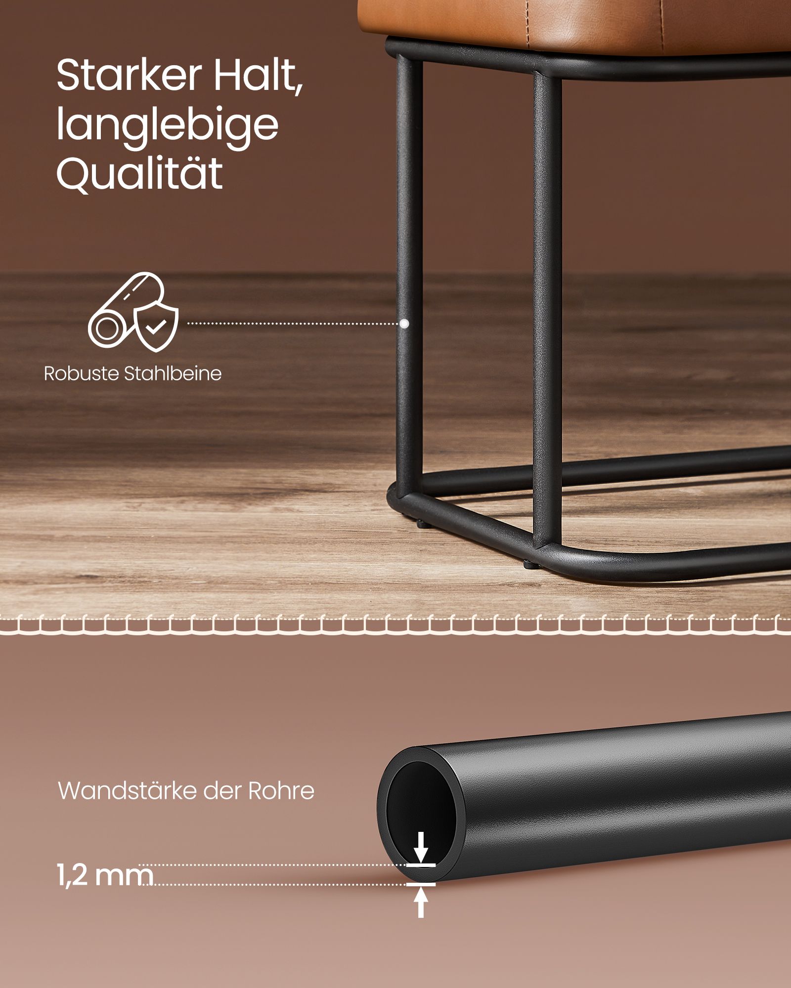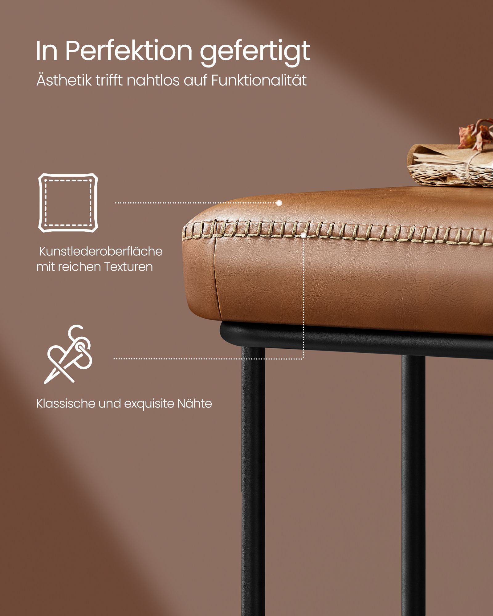 VASAGLE EKHO-kollektion – sovrumssoffa, konstläder, sömmar, matsalssoffa, sängsoffa, bänk med metallram, vardagsrum, mid-century modern-stil, belastningskapacitet upp till 300 kg, karamellbrun LOM073K01