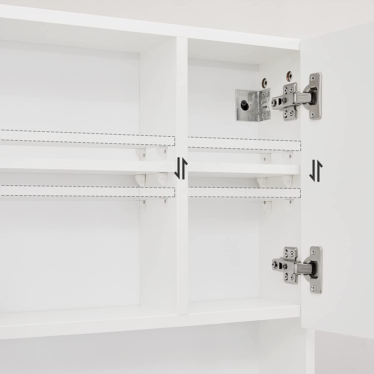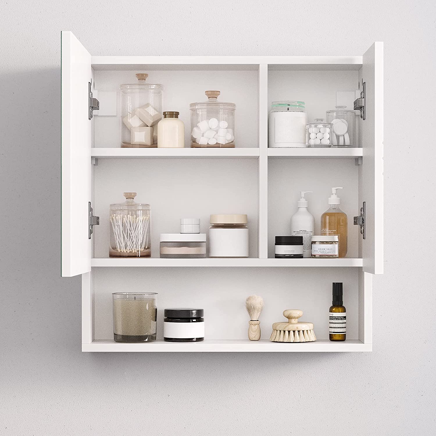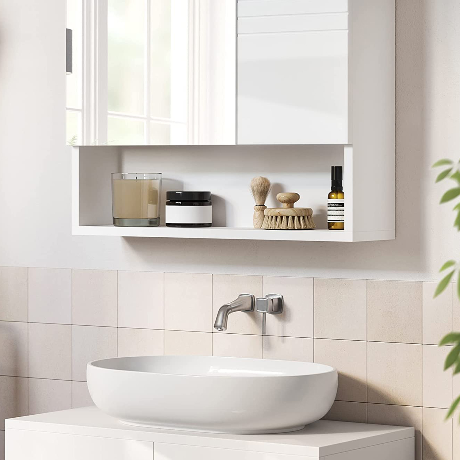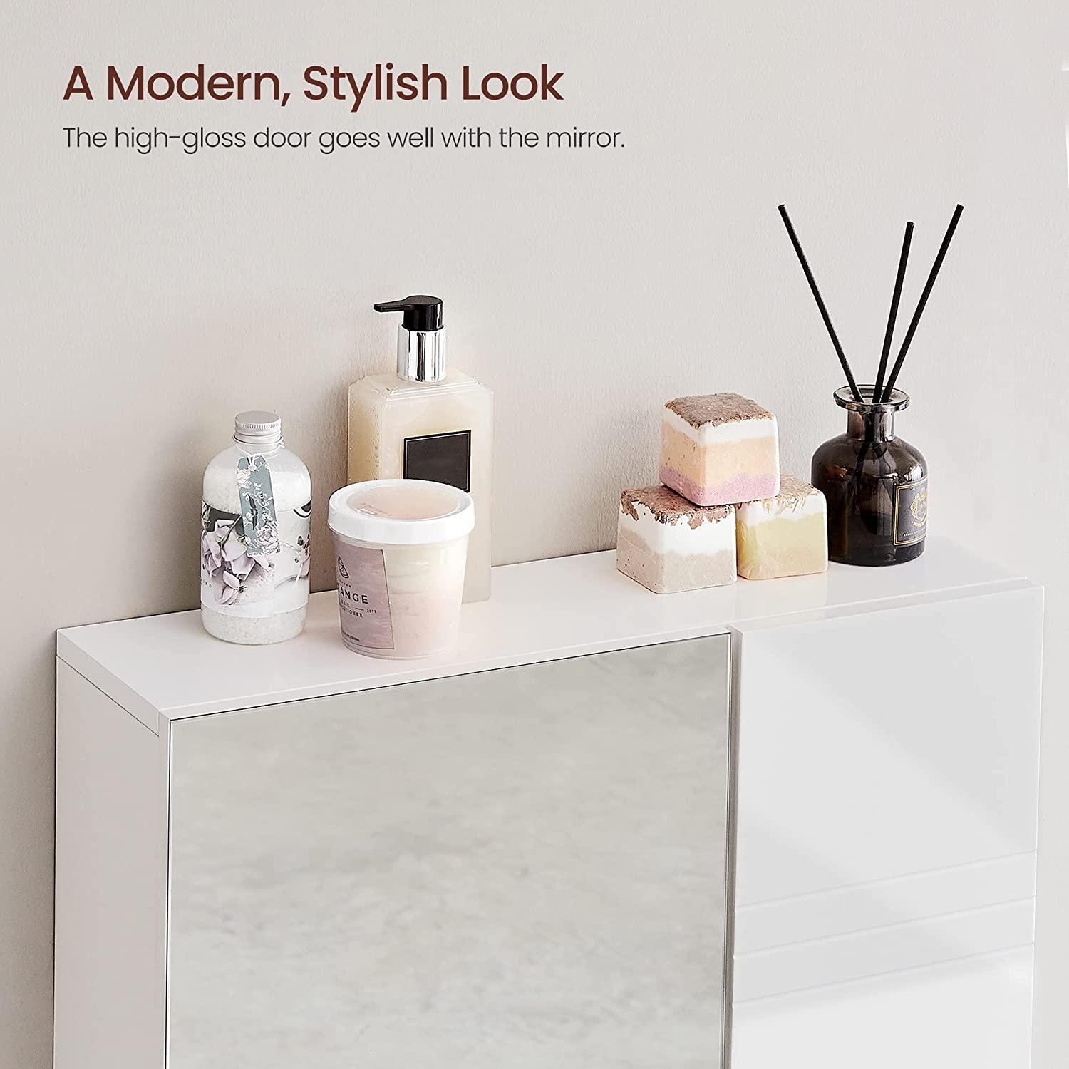 Detta spegelskåp har en glänsande vit yta med vit dörr så att du kan ge ditt badrum en fräsch och lugn känsla. Släpp alla bekymmer här, ladda batterierna och börja eller avsluta dagen på ett positivt sätt. Högkvalitativa material: Med detta badrumsskåp kan du inte bara visa upp elegans och stil. Möbeln är också hållbar, eftersom den är tillverkad av MDF, spånskivor och glas. In i minsta detalj: De två hyllplanerna inuti spegelskåpet är höj- och sänkbara, så att du kan förvara hygienartiklar i olika storlekar i det. Mjukstängande gångjärn förhindrar att skåpdörrarna smäller igen.Produktdetaljer: Färg: Vit Material: MDF (medeldensitetsfiberplatta), spånskiva, härdat spegelglas Storlek: 54 x 15 x 55 cm (L x B x H) Vikt: 9 kg Max. statisk belastningskapacitet: 15 kg Leveransomfattning: 1 x spegelskåp 1 x tillbehörspaket 1 x instruktioner VASAGLE Anmärkningar:Utsätt inte produkten för direkt solljus. Produkten bör inte komma i kontakt med stora mängder vatten. Fäst produkten på en solid vägg.