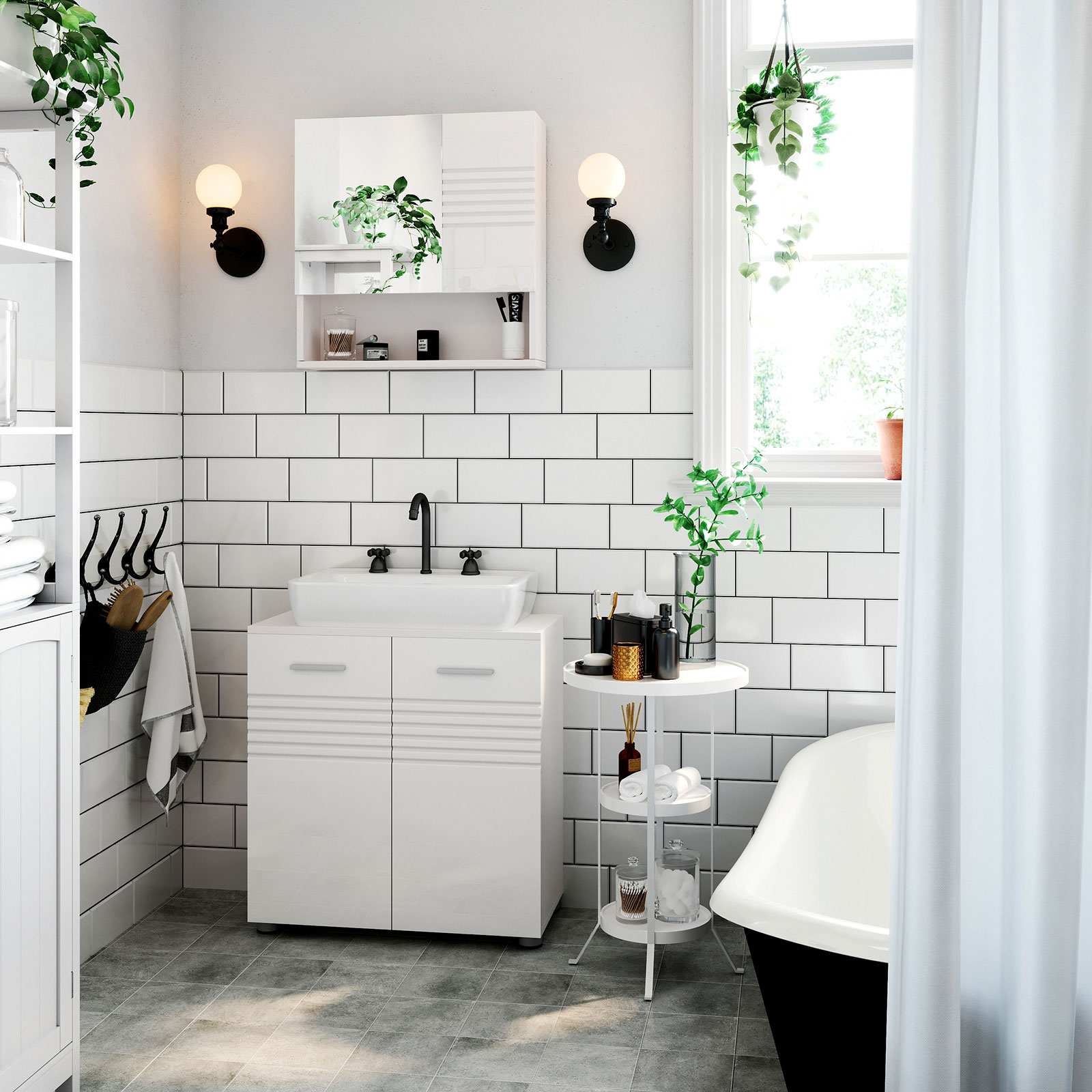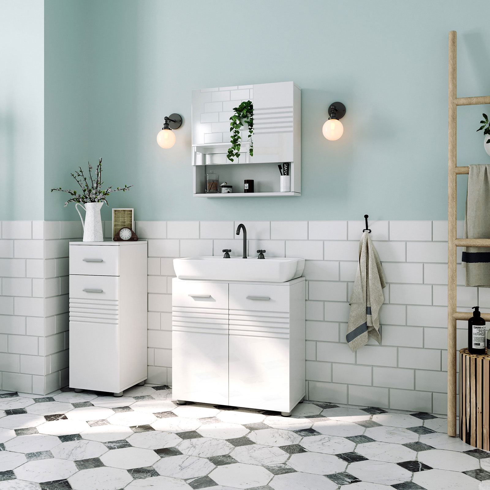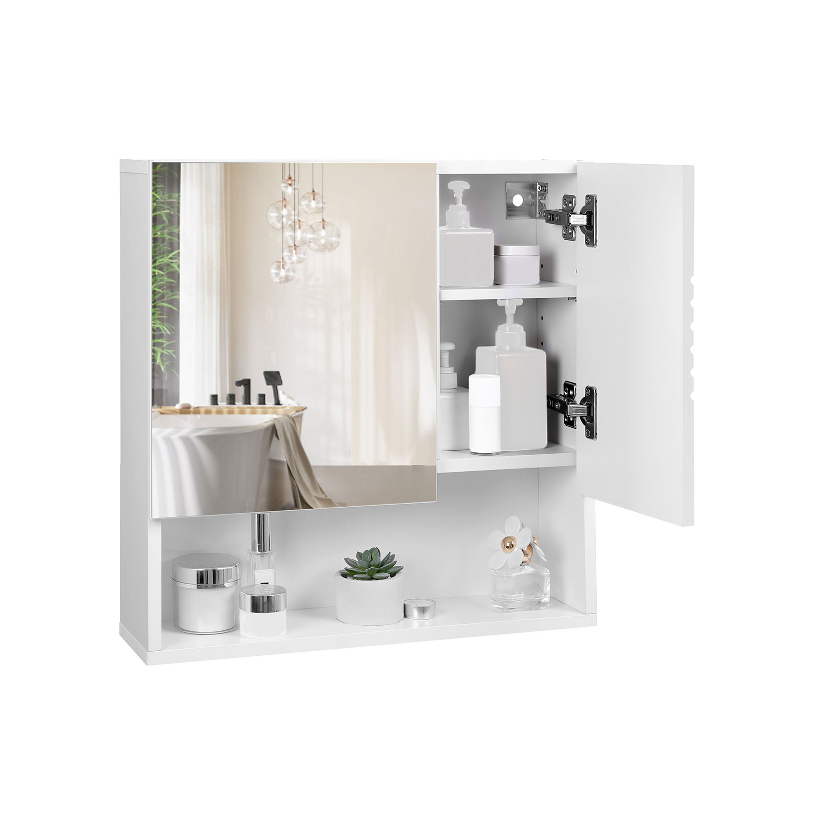 Designerna på VASAGLE har skapat stilfulla badrumsmöbler så att du kan ge ditt badrum en fräsch och lugn känsla. Här kan du släppa alla bekymmer, ladda batterierna och börja eller avsluta dagen på ett positivt sätt. Högkvalitativa material Med detta badrumsskåp kan du inte bara visa upp elegans och stil. Möbeln är också hållbar, eftersom kroppen är tillverkad av vita, melaminbelagda spånskivor. Skåpdörren är dessutom tillverkad av PVC-belagd MDF, vilket ger badrumsmöbeln en effektfull glans. I spegeln av härdat glas kan du dessutom beundra din skönhet. In i minsta detalj De två hyllplanerna inuti spegelskåpet är höj- och sänkbara, så att du kan förvara hygienartiklar i olika storlekar i det. Mjukstängande gångjärn förhindrar att skåpdörrarna smäller igen. Ett modernt badrum förtjänar detta badrumsskåp! Titta även på de andra badrumsmöblerna från VASAGLE för att skapa en enhetlig stil i ditt badrum. Produktdetaljer: – Färg: Glansigt vitt (dörr), matt vitt (kropp) – Material: Melaminbelagd spånskiva, PVC-belagd MDF, härdat spegelglas – Storlek: 54 x 15 x 55 cm (L x B x H) – Vikt: 10,3 kg – Max. belastningskapacitet: 15 kg Leveransomfattning: – 1 x spegelskåp – 1 x behållare med tillbehör – 1 x bruksanvisning (DE, EN, FR, ES, IT) VASAGLE Anmärkningar: – Utsätt inte produkten för direkt solljus. – Produkten bör inte komma i kontakt med stora mängder vatten. – Fäst produkten på en solid vägg. – Ta bort skyddsfilmen på produktens framsida efter montering.