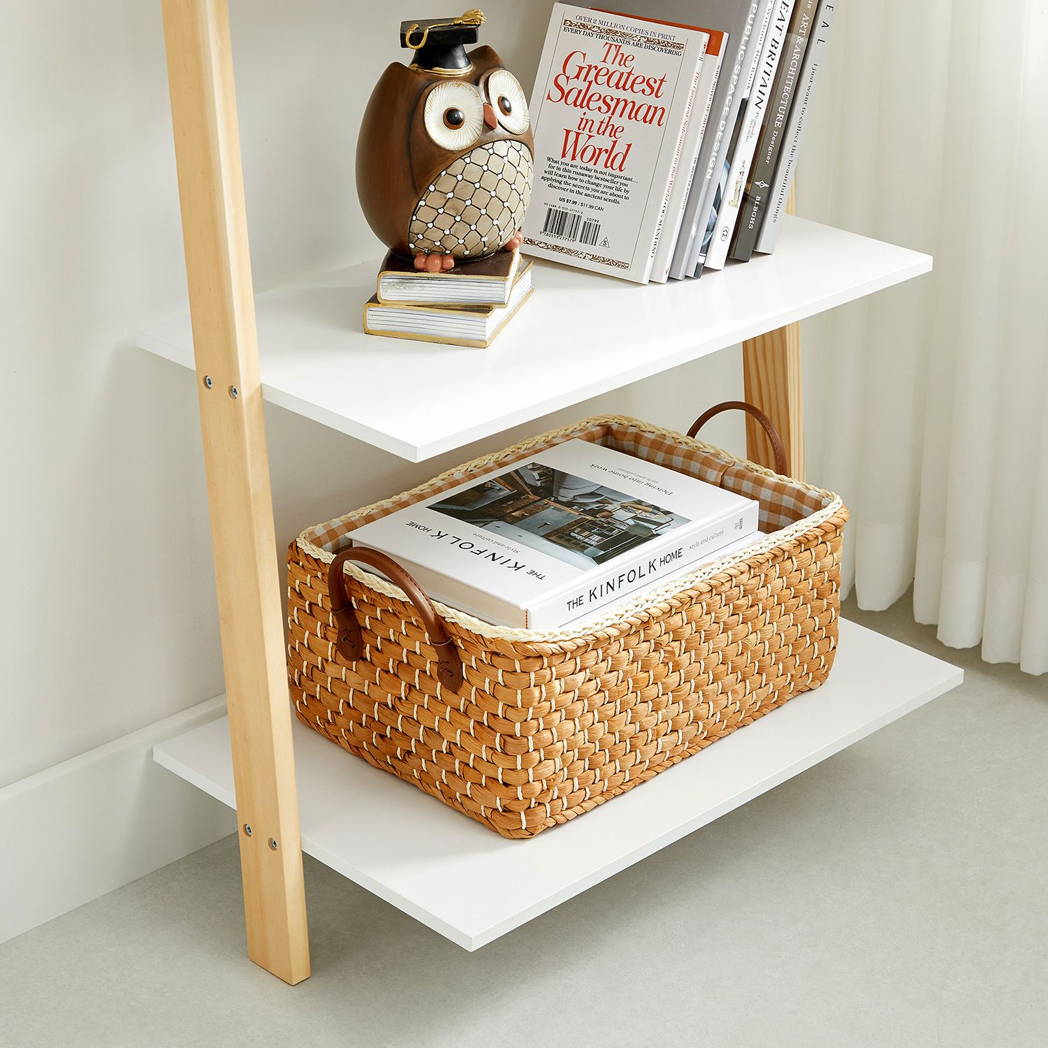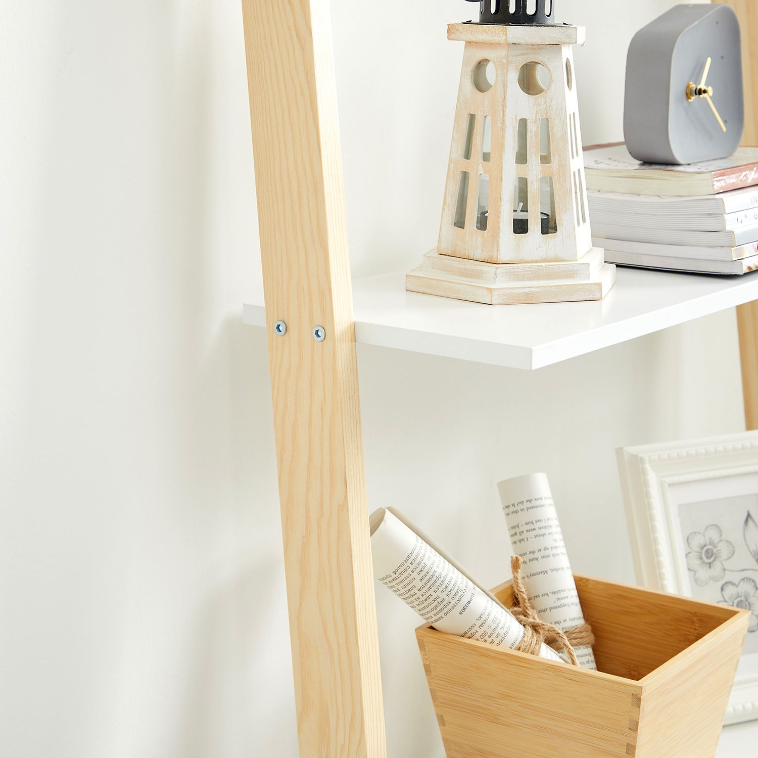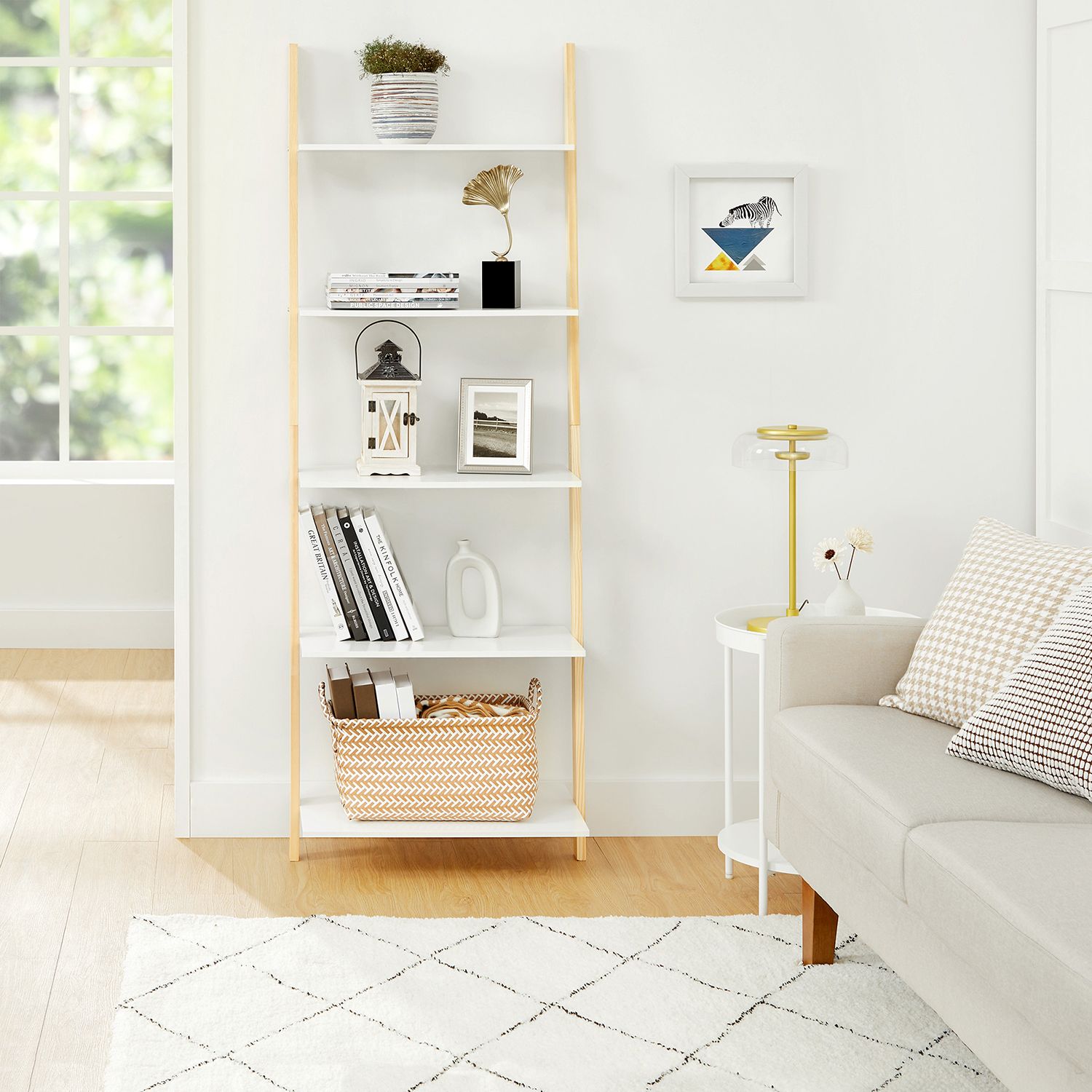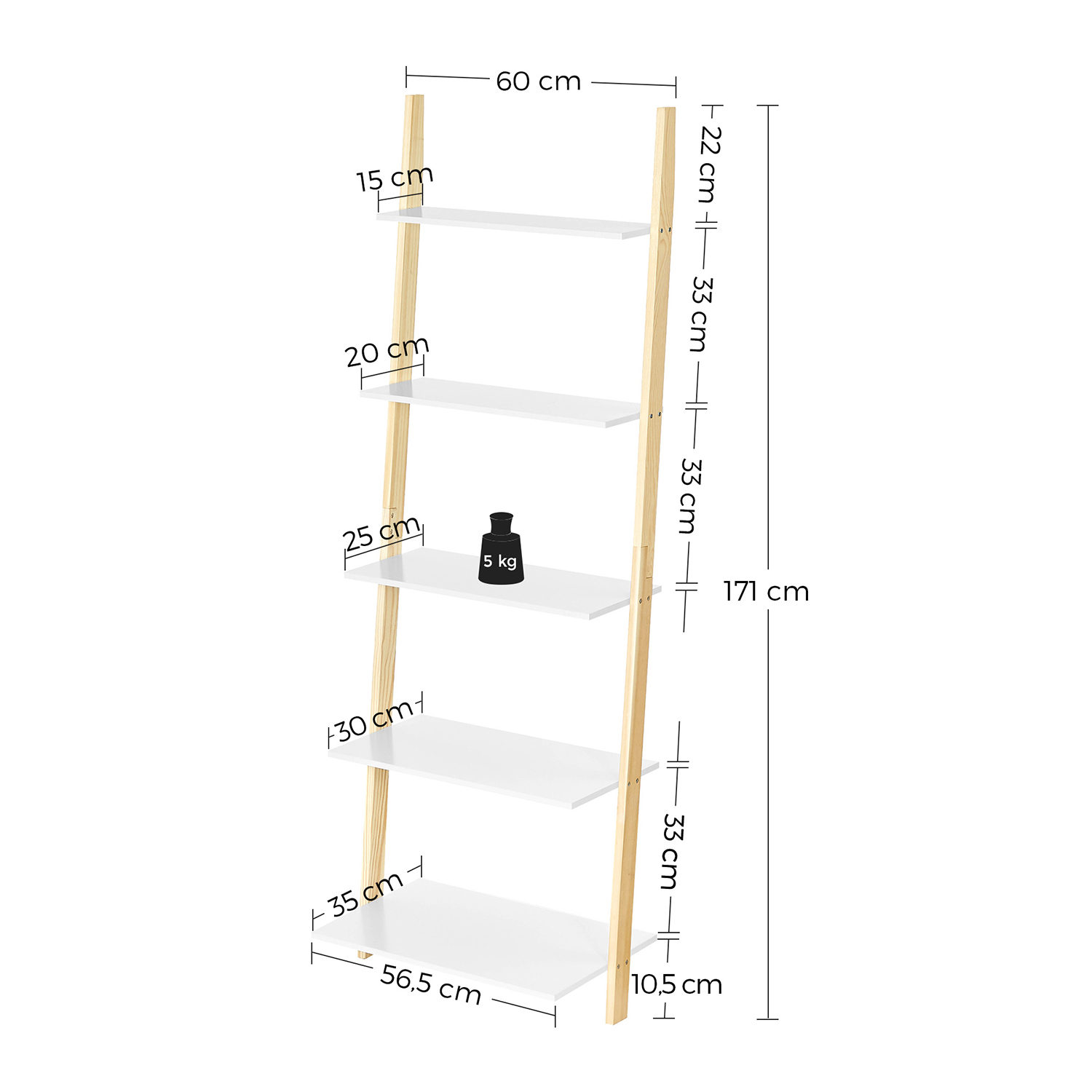 Ett hyllsystem, många möjligheter: En av de fantastiska sakerna med detta mångsidiga hyllsystem är att det kan vara precis vad du vill – det är multifunktionellt. Använd det som utställningshylla för dekorationer, i köket för kryddor och skålar eller i badrummet för hygienartiklar och handdukar. För små utrymmen: Tack vare den smala formen och den enkla designen utnyttjas det vertikala utrymmet optimalt. Ställ den helt enkelt i ett tomt hörn! Produktdetaljer: Färg: Mattvit-naturfärger Material: MDF (medeldensitetsfiberplatta), furu Storlek: 60 x 35 x 171 cm (L x B x H) Vikt: 8,6 kg Max. statisk belastningskapacitet per nivå: 5 kg Leveransomfattning: 1 x stegehylla 1 x tillbehörspaket 1 x tippskydd 1 x instruktioner (DE, EN, ES, FR, IT) VASAGLE Anmärkningar:Fäst denna produkt på väggen med det medföljande tippskyddet. Av säkerhetsskäl är det förbjudet för barn att klättra på eller leka med produkten.