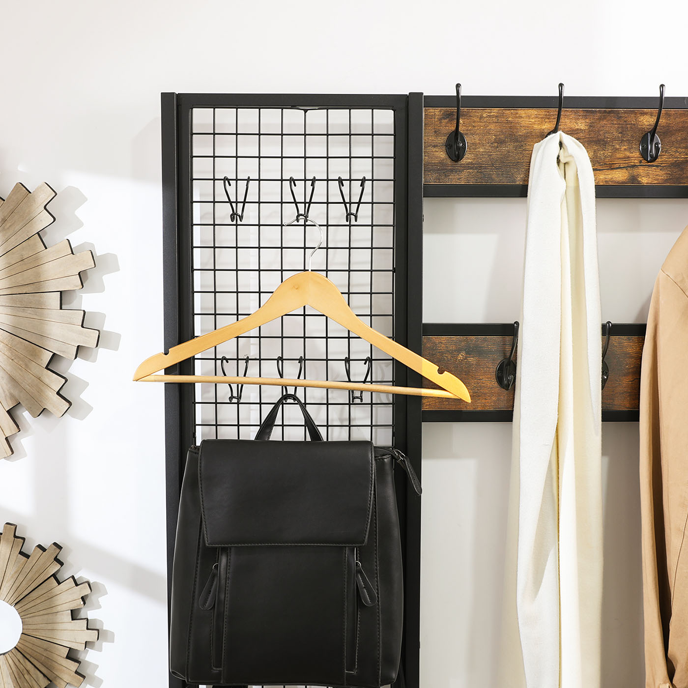 VASAGLE Stor garderob med bänk, klädställning med 9 klädkrokar och skohylla, garderob med gallervägg, 185 cm hög, mycket förvaringsutrymme, hall, sovrum, vintage, mörkbrun HSR98BX