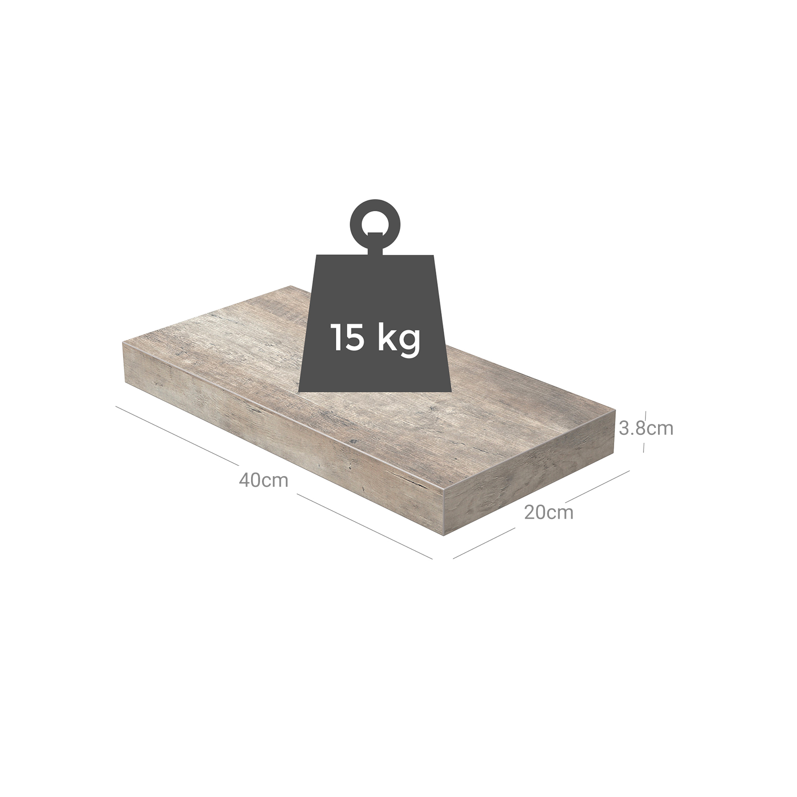 Saknar du förvaringsutrymme på golvet? Titta uppåt! Räcker inte utrymmet på golvet till för att ställa en smal hylla där? Var ska du då göra av dina dekorationsföremål, fotoramar, samlingar eller kryddor? Titta upp på väggarna! Använd den moderna svävande hyllan i greige (40 x 20 x 3,8 cm L/B/H) i vardagsrummet för att visa upp dina familjefoton, i badrummet för att förvara tvål och andra toalettartiklar eller i köket för att placera kryddor på.Två typer av väggfästen Vill du inte köra till byggvaruhuset bara för att köpa några skruvar, pluggar etc.? Inga problem, vi levererar olika väggfästen för massiva väggar och gipsväggar med träförstärkningar. Så kan du börja montera denna vägghylla direkt efter att du packat upp delarna. Produktdetaljer: – Färg: Greige – Material: E1-klass MDF (medeldensitetsfiberplatta), metall – Storlek: 40 x 20 x 3,8 cm (L x B x H) – Vikt: 1,5 kg – Max. statisk belastningskapacitet (vid montering på gipsvägg): 10 kg – Max. statisk belastningskapacitet (vid montering på massiv vägg): 15 kg Leveransomfattning:- 1 x vägghylla – 1 x tillbehörspåse – 1 x bruksanvisning (DE, EN, FR, ES, IT) VASAGLE Anmärkningar: – Montera hyllan enligt bruksanvisningen.- Vi rekommenderar att hyllan monteras på en massiv vägg (med en belastningskapacitet på upp till 15 kg). Om den monteras på träförstärkningar i en gipsvägg är belastningskapaciteten upp till 10 kg. – Placera inte för tunga föremål på hyllan. – Utsätt inte produkten för intensivt solljus och placera den inte i en fuktig miljö.